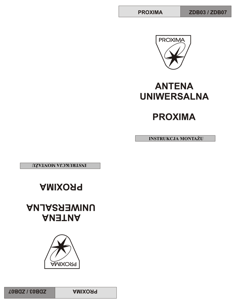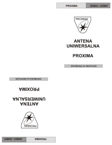 PROXIMA ZDB03 / ZDB07 PROXIMA ANTENA UNIWERSALNA PROXIMA INSTRUKCJA MONTA¯U INSTRUKCJA MONTA¯U PROXIMA ANTENA UNIWERSALNA PROXIMA PROXIMA ZDB03 / ZDB07 PROXIMA ZDB03 / ZDB07 PROXIMA ZDB03 / ZDB07 PL INSTRUKCJA MONTA¯U 1. Elementy 2 i 3 wsun¹æ w szczeliny w obudowie do pokrycia siê otworów i przykrêciæ wkrêtami ö2.9x9,5 (tak jak element 1) 2. Elementy dipoli UHF (4) za³o¿yæ w kolejnoœci pokazanej na rysunku na wystaj¹ce czêœci œrub i zamocowaæ nakrêtkami motylkowymi M3; 3. Elementy dipola VHF (5) za³o¿yæ na wystaj¹ce czêœci œrub i zamocowaæ nakrêtkami motylkowymi M3; 4. Elementy dipola VHF (5) przykrêciæ dwoma wkrêtami 2,9x9,5 na blaszkê zwieraj¹c¹ (7) ; za³o¿yæ nak³adkê maskuj¹c¹ (6); 5. W wersji pokojowej przykrêciæ dwoma wkrêtami 3,5x16 podstawkê (9) w pozosta³ych wersjach jest ju¿ przymocowany uchwyt do mocowania na maszcie(8); 6. Koñce kabla koncentrycznego przygotowaæ jak na rysunku (10) i nakrêciæ na nie z³¹cza „F” tak, aby ¿y³a œrodkowa kabla wystawa³a ok. 3 mm ponad krawêdŸ nakrêtki; 7. Kabel po³¹czyæ z anten¹ (12) i separatorem (13) ; po w³¹czeniu zasilacza do sieci w zasilaczu i w antenie powinny zaœwieciæ diody LED: - jeœli nie œwieci LED w antenie usun¹æ przerwê w po³¹czeniach kabla koncentrycznego; - jeœli nie œwieci LED w zasilaczu usun¹æ zwarcie w po³¹czeniach kabla koncentrycznego; 8. Obracaj¹c antenê i reguluj¹c wzmocnienie pokrêt³ami (11) ustawiæ najlepszy odbiór. KARTA GWARANCYJNA Producent udziela gwarancji na poprawne funkcjonowanie urz¹dzenia przez 24 miesi¹ce od daty sprzeda¿y, lecz nie d³u¿ej ni¿ 36 miesiêcy od daty produkcji. . Gwarancja nie obejmuje uszkodzeñ mechanicznych powsta³ych z winy u¿ytkownika ................................................. Pieczêæ i podpis sprzedawcy ................................ Data sprzeda¿y ................................ Data sprzeda¿y ................................................. Pieczêæ i podpis sprzedawcy . Gwarancja nie obejmuje uszkodzeñ mechanicznych powsta³ych z winy u¿ytkownika Producent udziela gwarancji na poprawne funkcjonowanie urz¹dzenia przez 24 miesi¹ce od daty sprzeda¿y, lecz nie d³u¿ej ni¿ 36 miesiêcy od daty produkcji. KARTA GWARANCYJNA 1. Elementy 2 i 3 wsun¹æ w szczeliny w obudowie do pokrycia siê otworów i przykrêciæ wkrêtami ö2.9x9,5 (tak jak element 1) 2. Elementy dipoli UHF (4) za³o¿yæ w kolejnoœci pokazanej na rysunku na wystaj¹ce czêœci œrub i zamocowaæ nakrêtkami motylkowymi M3; 3. Elementy dipola VHF (5) za³o¿yæ na wystaj¹ce czêœci œrub i zamocowaæ nakrêtkami motylkowymi M3; 4. Elementy dipola VHF (5) przykrêciæ dwoma wkrêtami 2,9x9,5 na blaszkê zwieraj¹c¹ (7) ; za³o¿yæ nak³adkê maskuj¹c¹ (6); 5. W wersji pokojowej przykrêciæ dwoma wkrêtami 3,5x16 podstawkê (9) w pozosta³ych wersjach jest ju¿ przymocowany uchwyt do mocowania na maszcie(8); 6. Koñce kabla koncentrycznego przygotowaæ jak na rysunku (10) i nakrêciæ na nie z³¹cza „F” tak, aby ¿y³a œrodkowa kabla wystawa³a ok. 3 mm ponad krawêdŸ nakrêtki; 7. Kabel po³¹czyæ z anten¹ (12) i separatorem (13) ; po w³¹czeniu zasilacza do sieci w zasilaczu i w antenie powinny zaœwieciæ diody LED: - jeœli nie œwieci LED w antenie usun¹æ przerwê w po³¹czeniach kabla koncentrycznego; - jeœli nie œwieci LED w zasilaczu usun¹æ zwarcie w po³¹czeniach kabla koncentrycznego; 8. Obracaj¹c antenê i reguluj¹c wzmocnienie pokrêt³ami (11) ustawiæ najlepszy odbiór. INSTRUKCJA MONTA¯U PL PROXIMA ZDB03 / ZDB07 PROXIMA ZDB03 / ZDB07