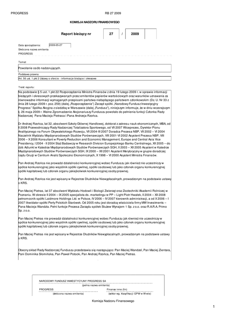 PROGRESS RB 27 2009 KOMISJA NADZORU FINANSOWEGO Raport bieżący nr Data sporządzenia: 27 / 2009 2009-05-27 Skrócona nazwa emitenta PROGRESS Temat Powołanie osób nadzorujących. Podstawa prawna Art. 56 ust. 1 pkt 2 Ustawy o ofercie - informacje bieżące i okresowe Treść raportu: Na podstawie § 5 ust. 1 pkt 22 Rozporządzenia Ministra Finansów z dnia 19 lutego 2009 r. w sprawie informacji bieżących i okresowych przekazywanych przez emitentów papierów wartościowych oraz warunków uznawania za równoważne informacji wymaganych przepisami państwa niebędącego państwem członkowskim (Dz. U. Nr 33 z dnia 28 lutego 2009 r. poz. 259) (dalej „Rozporządzenie”) Zarząd spółki „Narodowy Fundusz Inwestycyjny Progress” Spółka Akcyjna z siedzibą w Warszawie (dalej „Fundusz”), niniejszym informuje, że w dniu wczorajszym tj. 26 maja 2009 r. Walne Zgromadzenie Akcjonariuszy Funduszu powołało do pełnienia funkcji Członka Rady Nadzorczej Pana Macieja Pietrasa i Pana Andrzeja Rzońca. Dr Andrzej Rzońca, lat 32, absolwent Szkoły Głównej Handlowej, doktorat z zakresu nauk ekonomicznych, MBA, od II 2008 Przewodniczący Rady Nadzorczej Totalizatora Sportowego, od VII 2007 Wiceprezes, Dyrektor Pionu Analitycznego na Forum Obywatelskiego Rozwoju, VII 2004-III 2007 Doradca Prezesa NBP, VII 2002 – VI 2004 Naczelnik Wydziału Międzynarodowych Studiów Porównawczych, VIII 2001-VI 2002 Asystent Prezesa NBP, VIII 2006 – X 2006 Konsultant w Poverty Reduction and Economic Management, Europe and Central Asia Vice Presidency, I 2004 - II 2004 Staż Badawczy w Research Division Europejskiego Banku Centralnego, XII 2005 – do dziś Adiunkt w Katedrze Międzynarodowych Studiów Porównawczych SGH, II 2003 – XII 2005 Asystent w Katedrze Międzynarodowych Studiów Porównawczych SGH, IX 2000 – XII 2001 Asystent Merytoryczny w grupie doradczej rządu Gruzji w Centrum Analiz Społeczno Ekonomicznych, X 1998 – VI 2000 Asystent Ministra Finansów. Pan Andrzej Rzońca nie prowadzi działalności konkurencyjnej wobec Funduszu jak również nie uczestniczy w spółce konkurencyjnej jako wspólnik spółki cywilnej, spółki osobowej lub jako członek organu konkurencyjnej spółki kapitałowej lub członek organu jakiejkolwiek konkurencyjnej osoby prawnej. Pan Andrzej Rzońca nie jest wpisany w Rejestrze Dłużników Niewypłacalnych, prowadzonym na podstawie ustawy o KRS. Pan Maciej Pietras, lat 37 absolwent Wydziału Hodowli i Biologii Zwierząt oraz Zootechniki Akademii Rolniczej w Poznaniu. W okresie II 2004 – IX 2005 specjalista ds. marketingu w PP – Light Piotr Hwałek, II 2004 – XII 2008 pełnomocnik spółki Laidmore Holdings Ltd. w Polsce, IV 2006 – IV 2007 kierownik administracji, a od X 2006 – I 2007 likwidator spółki Perły Polskich Starówek. Od 2005 roku jest doradcą właściciela firmy MW Investments – Pana Macieja Wandzla. Pełni funkcje Prezesa Zarządu spółek Służew Wynajem 1 Sp. z o.o. oraz R.A.R.A. Primo Sp. z o.o. Pan Maciej Pietras nie prowadzi działalności konkurencyjnej wobec Funduszu jak również nie uczestniczy w spółce konkurencyjnej jako wspólnik spółki cywilnej, spółki osobowej lub jako członek organu konkurencyjnej spółki kapitałowej lub członek organu jakiejkolwiek konkurencyjnej osoby prawnej. Pan Maciej Pietras nie jest wpisany w Rejestrze Dłużników Niewypłacalnych, prowadzonym na podstawie ustawy o KRS. Obecny skład Rady Nadzorczej Funduszu przedstawia się następująco: Pan Maciej Wandzel, Pan Maciej Zientara, Pani Dominika Słomińska, Pan Paweł Potocki, Pan Andrzej Rzońca, Pan Maciej Pietras. NARODOWY FUNDUSZ INWESTYCYJNY PROGRESS SA (pełna nazwa emitenta) PROGRESS (skróc ona nazwa emitenta) Finanse inne (fin) (sektor wg. klasyfikacji GPW w W-wie) Komisja Nadzoru Finansowego 1 PROGRESS RB 27 2009 00-609 Warszawa (kod pocztowy) (miejscowość) Al. Armii Ludowej 26 (ulica) (numer) 022 579 79 00 022 579 79 01 (telefon) (fax) nfiprogress.com.pl (e-mail) (www) 5261029318 010964606 (NIP) (REGON) PODPISY OSÓB REPREZENTUJĄCYCH SPÓŁKĘ Data Imię i Nazwisko Stanowisko/Funkc ja 2009-05-27 Rafał Bauer Prezes Zarzadu 2009-05-27 Ewa Cieśla Członek Zarządu Podpis Komisja Nadzoru Finansowego 2