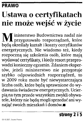 PRAWO Ustawa o certyfikatach nie może wejść w życie inisterstwo Budownictwa nadal nie przygotowało rozporządzeń, które będą określały kształt i koszty certyfikatów energetycznych. Nie wiadomo też, kiedy rozpoczną się szkolenia osób, które mają wydawać certyfikaty, i kiedy resort przeprowadzi konieczny egzamin. Zdaniem ekspertów, jeżeli ministerstwo nie przygotuje szybko odpowiednich rozporządzeń, to w 2009 roku może być niewystarczająca liczba osób, które będą uprawnione do wydawania świadectw energetycznych. Ucierpią na tym przede wszystkim zwykli obywatele, którzy nie będą mogli sprzedać ani wynająć swoich mieszkań i domów.» M strony 2 i 5 PRAWO Minister złamał prawo ie ma co owijać w bawełnę, minister budownictwa złamał rozporządzenie prezesa Rady Ministrów o zasadach techniki prawodawczej. Rozporządzenie jest krótkie, zwięzłe i wyjątkowo klarowne: „...jednocześnie z projektem ustawy przygotowuje się projekt rozporządzenia o znaczeniu podstawowym dla jej funkcjonowania...". Brak przepisów wykonawczych sparaliżował już niejedną ustawę. Tym razem paraliż objął ustawę o certyfikatach energetycznych. Sprawa nie jest wcale błaha. Jeżeli uchwalona ustawa nie zostanie szybko wprawiona w ruch, miliony mieszkań wypadnie z obrotu prawnego. Notariusze bez energetycznych certyfikatów nie będą mogli podpisywać aktów notarialnych. Cóż, na co dzień giniemy w gąszczu najrozmaitszych przepisów. Mamy już najobszerniejsze Dzienniki Ustaw w Europie, ale gdy przychodzi do konkretów, okazuje się, że wciąż brakuje nam przepisów, tych najważniejszych.B strona 5 N ANDRZEJ JANKOWSKI andrzej.jankowski @infor.pl PRAWO | BUDOWNICTWO | Charakterystyka energetyczna budynków Brak certyfikatów ograniczy obrót nieruchomościami NOWE PRAWO Ministerstwo Budownictwa nadal nie przygotowało rozporządzeń określających zakres szkolenia osób, które chcą wydawać certyfikaty energetyczne. Zdaniem ekspertów, brak odpowiednio wyszkolonych certyfikatorów może sparaliżować rynek obrotu nieruchomościami. ARKADIUSZ JARASZEK [email protected] o prawie trzech latach pracy i z prawie dwuletnim opóźnieniem została uchwalona nowelizacja ustawy Prawo budowlane, która wprowadza obowiązek posiadania i sporządzania certyfikatów zużycia energii budynków. Ustawa nadal pozostaje jednak martwa, gdyż Ministerstwo Budownictwa nie przygotowało rozporządzeń wykonawczych. Nadal nie wiadomo np., jak mają wyglądać certyfikaty i ile będą kosztować. -Potrzebne jest szybkie przygotowanie rozporządzeń, gdyż bez nich wydawanie certyfikatów nie będzie możliwe - mówi Arkadiusz Węglarz, wiceprzewodniczący Zrzeszenia Audytorów Energetycznych. P Brak wyszkolonej kadry Nawet gdy Ministerstwo Budownictwa przygotuje w ostatniej chwili rozporządzenia określające kształt i koszt certyfikatów, to może się okazać, że i tak nie będą one wydawane. Zgodnie bowiem z ustawą certyfikaty mają być sporządzane między innymi przez osoby z wyższym wykształceniem, które ukończą kurs certyfikacji i potwierdzą swoją wiedzę, zdając egzamin na certyfikatora przed komisją powołaną przez ministra budownictwa. - Mamy nieco ponad rok na przygotowanie co najmniej kilku tysięcy - jak zakładają eksperci, przeszkolonych specjalistów mogących w miarę szybko zbadać stan energetyczny setek tysięcy budynków czy mieszkań. Konieczne jest jak najszybsze rozpoczęcie odpowiednich szkoleń osób, które będą odpowiedzialne za wystawianie certyfikatów. Szkolenia muszą trwać przez jakiś czas, a do tego trzeba zakończyć je egzaminem - mówi Marcin Piotrowski, wiceprezes Konfederacji Budownictwa i Nieruchomości. Niestety, szkolenia takie nie mogą się rozpocząć między innymi właśnie z powodu braku odpowiednich rozporządzeń. Paraliż rynku nieruchomości Brak odpowiedniej liczby przeszkolonych osób, które będą mogły wydawać certyfikaty, może doprowadzić do paraliżu rynku nieruchomości. Według danych z Krajowej Rady Notarialnej co roku w Polsce przeprowadza się około 500 tyś. transakcji zakupu lub sprzedaży nieruchomości. Do tego każdego roku setki tysięcy mieszkań są wynajmowane. - Zgodnie z ustawą już od 2009 roku każda z tych nieruchomości będzie musiała posiadać certyfikat energetyczny, bez którego jej sprzedaż lub wynajęcie nie będzie w ogóle możliwe - mówi Marcin Piotrowski. Dodaje, że według różnych szacunków tylko w 2009 roku może być potrzeba wydania nawet l min certyfikatów. - Z powodu tak dużej liczby potrzebnych certyfikatów w pierwszym roku obowiązywania nowelizacji rysuje się poważny problem w obrocie nieruchomościami - wyjaśnia Marcin Piotrowski. Potrzebne rozporządzenia Brakiem odpowiednich rozporządzeń, które umożliwią wydawanie certyfikatów, zaniepokojeni są także pośrednicy w obrocie nieruchomościami. - Nie wyobrażam sobie sytuacji, w której z powodu zaniedbania państwa setki tysięcy osób nie mogłyby sprzedać swojego mieszkania. Byłaby to zupełnie wyjątkowa sytuacja, która może doprowadzić do paraliżu na rynku nieruchomości - mówi Tomasz Lebiedź, członek zarządu Polskiej Federacji Rynku Nieruchomości oraz pośrednik i doradca w obrocie nieruchomościami. Zaniepokojeni pośrednicy w obrocie nieruchomościami deklarują swoją pomoc. - Certyfikaty mogliby wydawać sami pośrednicy, któ- CERTYFIKACJA ENERGETYCZNA BUDYNKÓW Jakie będą konsekwencje niewydania w terminie potrzebnych rozporządzeń: • wstrzymana zostanie sprzedaż nieruchomości • utrudnione będzie wynajmowanie mieszkań • zabronione będzie dopuszczanie do użytkowania nowo wybudowanych budynków Jakie budynki będą musiały posiadać certyfikat: • nowo wybudowane i oddawane do użytkowania • sprzedawane • wynajmowane • budynki, w których w wyniku remontu zmieniła się charakterystyka energetyczna Kto będzie mógł wydawać certyfikaty: 