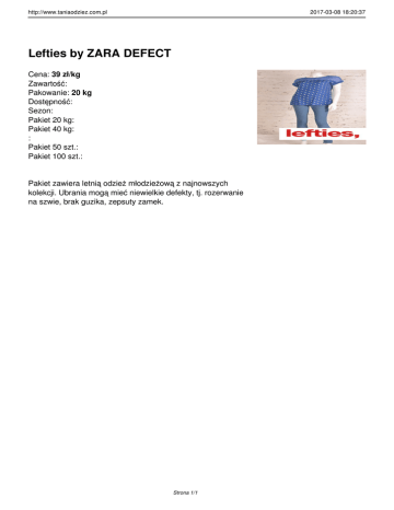 http://www.taniaodziez.com.pl 2017-03-08 18:20:37 Lefties by ZARA DEFECT Cena: 39 zł/kg Zawartość: Pakowanie: 20 kg Dostępność: Sezon: Pakiet 20 kg: Pakiet 40 kg: : Pakiet 50 szt.: Pakiet 100 szt.: Pakiet zawiera letnią odzież młodzieżową z najnowszych kolekcji. Ubrania mogą mieć niewielkie defekty, tj. rozerwanie na szwie, brak guzika, zepsuty zamek. Strona 1/1