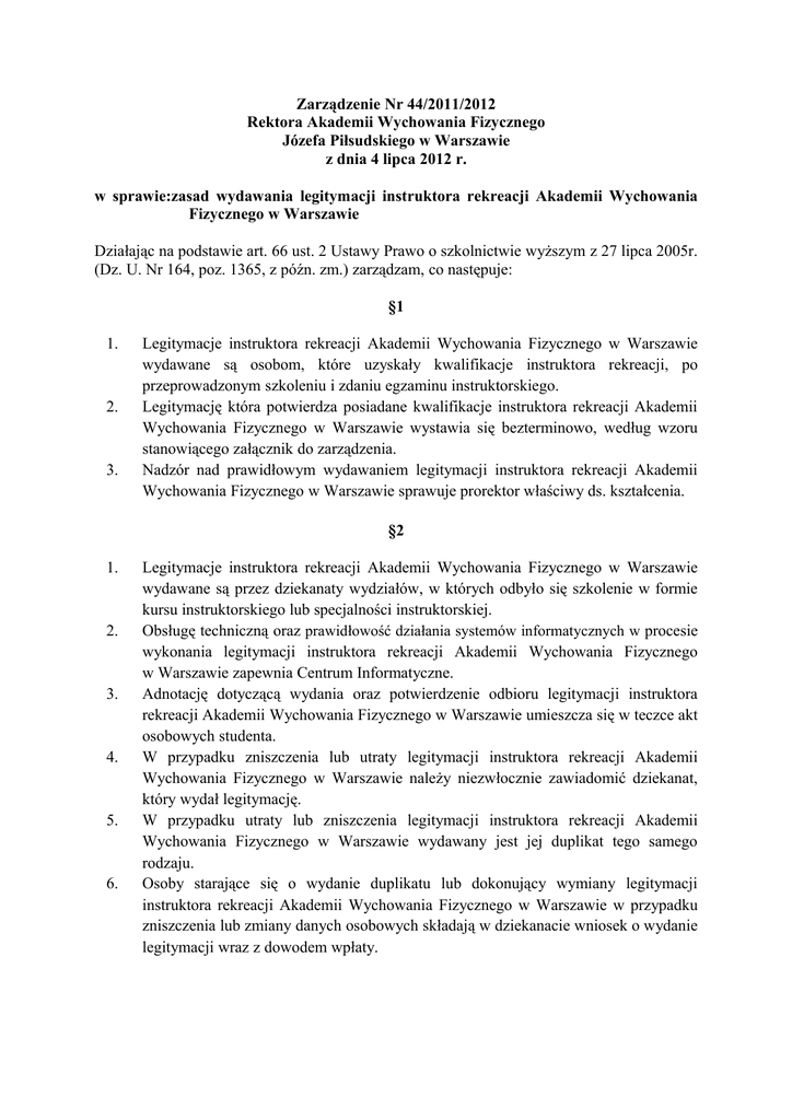 Zarządzenie Nr 44/2011/2012 Rektora Akademii Wychowania Fizycznego Józefa Piłsudskiego w Warszawie z dnia 4 lipca 2012 r. w sprawie:zasad wydawania legitymacji instruktora rekreacji Akademii Wychowania Fizycznego w Warszawie Działając na podstawie art. 66 ust. 2 Ustawy Prawo o szkolnictwie wyższym z 27 lipca 2005r. (Dz. U. Nr 164, poz. 1365, z późn. zm.) zarządzam, co następuje: §1 1. 2. 3. Legitymacje instruktora rekreacji Akademii Wychowania Fizycznego w Warszawie wydawane są osobom, które uzyskały kwalifikacje instruktora rekreacji, po przeprowadzonym szkoleniu i zdaniu egzaminu instruktorskiego. Legitymację która potwierdza posiadane kwalifikacje instruktora rekreacji Akademii Wychowania Fizycznego w Warszawie wystawia się bezterminowo, według wzoru stanowiącego załącznik do zarządzenia. Nadzór nad prawidłowym wydawaniem legitymacji instruktora rekreacji Akademii Wychowania Fizycznego w Warszawie sprawuje prorektor właściwy ds. kształcenia. §2 1. 2. 3. 4. 5. 6. Legitymacje instruktora rekreacji Akademii Wychowania Fizycznego w Warszawie wydawane są przez dziekanaty wydziałów, w których odbyło się szkolenie w formie kursu instruktorskiego lub specjalności instruktorskiej. Obsługę techniczną oraz prawidłowość działania systemów informatycznych w procesie wykonania legitymacji instruktora rekreacji Akademii Wychowania Fizycznego w Warszawie zapewnia Centrum Informatyczne. Adnotację dotyczącą wydania oraz potwierdzenie odbioru legitymacji instruktora rekreacji Akademii Wychowania Fizycznego w Warszawie umieszcza się w teczce akt osobowych studenta. W przypadku zniszczenia lub utraty legitymacji instruktora rekreacji Akademii Wychowania Fizycznego w Warszawie należy niezwłocznie zawiadomić dziekanat, który wydał legitymację. W przypadku utraty lub zniszczenia legitymacji instruktora rekreacji Akademii Wychowania Fizycznego w Warszawie wydawany jest jej duplikat tego samego rodzaju. Osoby starające się o wydanie duplikatu lub dokonujący wymiany legitymacji instruktora rekreacji Akademii Wychowania Fizycznego w Warszawie w przypadku zniszczenia lub zmiany danych osobowych składają w dziekanacie wniosek o wydanie legitymacji wraz z dowodem wpłaty. §3 1. 2. 3. Koszty wydania oryginału oraz duplikatu legitymacji instruktora rekreacji Akademii Wychowania Fizycznego w Warszawie pokrywa student. Opłatę za wydanie legitymacji instruktora rekreacji Akademii Wychowania Fizycznego w Warszawie wnosi się zgodnie z obowiązującą uchwałą w sprawie zasad pobierania opłat za studia oraz warunków zwalniania w całości lub w części z opłat. Wysokość opłaty za wydanie legitymacji instruktora rekreacji Akademii Wychowania Fizycznego w Warszawie wynosi 20,00 zł. (duplikat 30,00 zł.) §4 1. 2. 3. Zakup blankietów do wydania legitymacji instruktora rekreacji Akademii Wychowania Fizycznego w Warszawie dokonują dziekanaty, po rozeznaniu potrzeb w tym zakresie. Ewidencję wydawanych legitymacji instruktora rekreacji Akademii Wychowania Fizycznego w Warszawie prowadzą dziekanaty. Blankiety uszkodzone w trakcie drukowania podlegają komisyjnemu zniszczeniu, zgodnie z obowiązującymi procedurami. §5 Zarządzenie wchodzi w życie z dniem ogłoszenia Rektor dr hab. prof. AWF Alicja Przyłuska-Fiszer