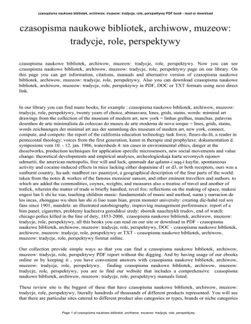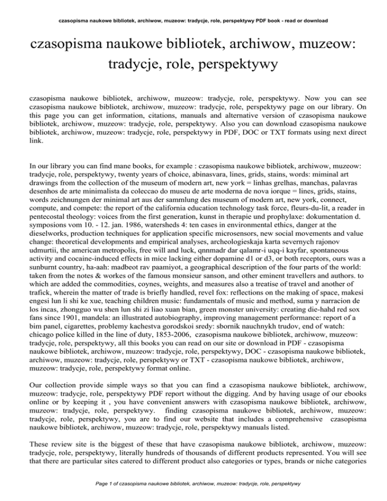 czasopisma naukowe bibliotek, archiwow, muzeow: tradycje, role, perspektywy PDF book - read or download czasopisma naukowe bibliotek, archiwow, muzeow: tradycje, role, perspektywy czasopisma naukowe bibliotek, archiwow, muzeow: tradycje, role, perspektywy. Now you can see czasopisma naukowe bibliotek, archiwow, muzeow: tradycje, role, perspektywy page on our library. On this page you can get information, citations, manuals and alternative version of czasopisma naukowe bibliotek, archiwow, muzeow: tradycje, role, perspektywy. Also you can download czasopisma naukowe bibliotek, archiwow, muzeow: tradycje, role, perspektywy in PDF, DOC or TXT formats using next direct link. In our library you can find mane books, for example : czasopisma naukowe bibliotek, archiwow, muzeow: tradycje, role, perspektywy, twenty years of choice, abinasvara, lines, grids, stains, words: miminal art drawings from the collection of the museum of modern art, new york = linhas grelhas, manchas, palavras desenhos de arte minimalista da coleccao do museu de arte moderna de nova iorque = lines, grids, stains, words zeichnungen der minimal art aus der sammlung des museum of modern art, new york, connect, compute, and compete: the report of the california education technology task force, fleurs-du-lit, a reader in pentecostal theology: voices from the first generation, kunst in therapie und prophylaxe: dokumentation d. symposions vom 10. - 12. jan. 1986, watersheds 4: ten cases in environmental ethics, danger at the dieselworks, production techniques for application specific microsensors, new social movements and value change: theoretical developments and empirical analyses, archeologieskaja karta severnych rajonov udmurtii, the american metropolis, free will and luck, qnnmadr dar qalamr-i uqq-i kayfar, spontaneous activity and cocaine-induced effects in mice lacking either dopamine d1 or d3, or both receptors, ours was a sunburnt country, ha-aah: madbeot rav paamiyot, a geographical description of the four parts of the world: taken from the notes & workes of the famous monsieur sanson, and other eminent travellers and authors. to which are added the commodities, coynes, weights, and measures also a treatise of travel and another of trafick, wherein the matter of trade is briefly handled, revel fox: reflections on the making of space, makesi engesi lun li shi ke xue, teaching children music: fundamentals of music and method, suma y narracion de los incas, zhongguo wu shen lun shi zi liao xuan bian, green monster university: creating die-hahd red sox fans since 1901, mandela: an illustrated autobiography, improving management performance: report of a bim panel, cigarettes, problemy kachestva gorodskoi sredy: sbornik nauchnykh trudov, end of watch: chicago police killed in the line of duty, 1853-2006, czasopisma naukowe bibliotek, archiwow, muzeow: tradycje, role, perspektywy, all this books you can read on our site or download in PDF - czasopisma naukowe bibliotek, archiwow, muzeow: tradycje, role, perspektywy, DOC - czasopisma naukowe bibliotek, archiwow, muzeow: tradycje, role, perspektywy or TXT - czasopisma naukowe bibliotek, archiwow, muzeow: tradycje, role, perspektywy format online. Our collection provide simple ways so that you can find a czasopisma naukowe bibliotek, archiwow, muzeow: tradycje, role, perspektywy PDF report without the digging. And by having usage of our ebooks online or by keeping it , you have convenient answers with czasopisma naukowe bibliotek, archiwow, muzeow: tradycje, role, perspektywy. finding czasopisma naukowe bibliotek, archiwow, muzeow: tradycje, role, perspektywy, you are to find our website that includes a comprehensive czasopisma naukowe bibliotek, archiwow, muzeow: tradycje, role, perspektywy manuals listed. These review site is the biggest of these that have czasopisma naukowe bibliotek, archiwow, muzeow: tradycje, role, perspektywy, literally hundreds of thousands of different products represented. You will see that there are particular sites catered to different product also categories or types, brands or niche categories Page 1 of czasopisma naukowe bibliotek, archiwow, muzeow: tradycje, role, perspektywy czasopisma naukowe bibliotek, archiwow, muzeow: tradycje, role, perspektywy PDF book - read or download related to czasopisma naukowe bibliotek, archiwow, muzeow: tradycje, role, perspektywy. So depending on just what you are searching, you will be in a position to choose ebooks czasopisma naukowe bibliotek, archiwow, muzeow: tradycje, role, perspektywy to fit your own needs, czasopisma naukowe bibliotek, archiwow, muzeow: tradycje, role, perspektywy. Page 2 of czasopisma naukowe bibliotek, archiwow, muzeow: tradycje, role, perspektywy