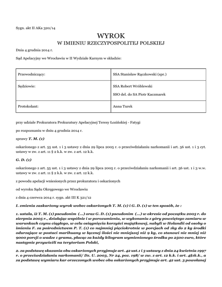 Sygn. akt II AKa 320/14 WYROK W IMIENIU RZECZYPOSPOLITEJ POLSKIEJ Dnia 4 grudnia 2014 r. Sąd Apelacyjny we Wrocławiu w II Wydziale Karnym w składzie: Przewodniczący: SSA Stanisław Rączkowski (spr.) Sędziowie: SSA Robert Wróblewski SSO del. do SA Piotr Kaczmarek Protokolant: Anna Turek przy udziale Prokuratora Prokuratury Apelacyjnej Teresy Łozińskiej - Fatygi po rozpoznaniu w dniu 4 grudnia 2014 r. sprawy T. M. (1) oskarżonego z art. 55 ust. 1 i 3 ustawy z dnia 29 lipca 2005 r. o przeciwdziałaniu narkomanii i art. 56 ust. 1 i 3 cyt. ustawy w zw. z art. 11 § 2 k.k. w zw. z art. 12 k.k. G. D. (1) oskarżonego z art. 55 ust. 1 i 3 ustawy z dnia 29 lipca 2005 r. o przeciwdziałaniu narkomanii i art. 56 ust. 1 i 3 w.w. ustawy w zw. z art. 11 § 2 k.k. w zw. z art. 12 k.k. z powodu apelacji wniesionych przez prokuratora i oskarżonych od wyroku Sądu Okręgowego we Wrocławiu z dnia 4 czerwca 2014 r. sygn. akt III K 321/12 I. zmienia zaskarżony wyrok wobec oskarżonych T. M. (1) i G. D. (1) w ten sposób, że : 1. ustala, iż T. M. (1) pseudonim (...) oraz G. D. (1) pseudonim (...) w okresie od początku 2005 r. do sierpnia 2005 r., działając wspólnie i w porozumieniu, w wykonaniu z góry powziętego zamiaru w warunkach czynu ciągłego, w celu osiągnięcia korzyści majątkowej, nabyli w Holandii od osoby o imieniu F. za pośrednictwem P. T. (1) co najmniej pięciokrotnie w porcjach od 1kg do 2 kg środki odurzające w postaci marihuany w łącznej ilości nie mniejszej niż 9 kg, co stanowi nie mniej niż 9000 porcji o wadze 1 grama, płacąc za każdy kilogram wymienionego środka po 2500 euro, które następnie przywieźli na terytorium Polski, 2. za podstawę skazania obu oskarżonych przyjmuje art. 42 ust.1 i 3 ustawy z dnia 24 kwietnia 1997 r. o przeciwdziałaniu narkomanii/ Dz. U. 2003, Nr 24, poz. 198/ w zw. z art. 12 k.k. i art. 4§1k.k., a za podstawę wymiaru kar orzeczonych wobec obu oskarżonych przyjmuje art. 42 ust. 3 powołanej wyżej ustawy w zw. z art. 4§1k.k. i art. 33§1k.k., a za podstawę prawną orzeczonych nawiązek przyjmuje art. 55 ust. 3 wymienionej wyżej ustawy, 3. uchyla orzeczenie o orzeczeniu środka karnego wobec obu oskarżonych podjęte na podstawie art. 45 § 1 k.k., II. w pozostałym zakresie zaskarżony wyrok wobec oskarżonych T. M. (1) i G. D. (1) utrzymuje w mocy, III. zasądza od oskarżonych na rzecz Skarbu Państwa po 5 złotych tytułem zwrotu wydatków wyłożonych przez Skarb Państwa w postępowaniu odwoławczym oraz wymierza im po 3400 złotych opłaty za drugą instancję oraz ustala prawidłową opłatę za pierwszą instancję w odniesieniu do obu oskarżonych na kwotę po 3400 złotych. UZASADNIENIE Prokurator Prokuratury Okręgowej we Wrocławiu oskarżył : 1.T. M. (1) o to, że w okresie od 2005 r. do 2007 r. w Holandii działając w wykonaniu z góry powziętego zamiaru w warunkach przestępstwa ciągłego, w celu osiągnięcia korzyści majątkowej, wspólnie i w porozumieniu z P. T. (1), G. D. (1) – ps. (...) i osobą o imieniu (...), dokonał co najmniej dziewięciokrotnego wewnątrzwspólnotowego nabycia znacznej ilości środków odurzających w postaci marihuany, w łącznej ilości nie mniejszej niż 17 kg, co stanowi nie mniej niż 17.000 jednorazowych porcji o wadze 1 grama, które następnie przywiózł na terytorium Polski w ten sposób, że : - w okresie od 2005 r. do grudnia 2006 r. nabył w Holandii od osoby o imieniu (...) wspólnie z G. D. (1) – ps. (...), za pośrednictwem P. T. (1) środki odurzające w łącznej ilości 9 kg marihuany, kupując każdorazowo w porcjach od 1 do 2 kg wymienionego środka, płacąc za każdy kilogram pieniędzmi w kwocie 2500 Euro, którą następnie zbył na terytorium Polski innym, nieustalonym dotychczas osobom, - w okresie od 2007 r. nabył w Holandii od osoby o imieniu (...) wspólnie z G. D. (1) – ps. (...) środki odurzające w łącznej ilości 8 kg marihuany, kupując każdorazowo po2 kg wymienionego środka, które następnie zbył na terytorium Polski innym, nieustalonym dotychczas osobom, tj. o przestępstwo z art. 55 ust. 1 i 3 ustawy z dnia 29 lipca 2005 r. o przeciwdziałaniu narkomanii( Dz. U. Nr 179, poz. 1485 ze zm.) i art. 56 ust. 1 i 3 cyt. ustawy w zw. z art. 11§2k.k. w zw. z art. 12 k.k. 2.G. D. (1) o to, że w okresie od 2005 r. do 2007 r. w Holandii działając w wykonaniu z góry powziętego zamiaru w warunkach przestępstwa ciągłego, w celu osiągnięcia korzyści majątkowej, wspólnie i w porozumieniu z P. T. (1), osobą o imieniu (...) i T. M. (1) ps. (...), dokonał co najmniej dziewięciokrotnego wewnątrzwspólnotowego nabycia znacznej ilości środków odurzających w postaci marihuany, w łącznej ilości nie mniejszej niż 17 kg, co stanowi nie mniej niż 17.000 jednorazowych porcji o wadze 1 grama, które następnie przywiózł na terytorium Polski w ten sposób, że : - w okresie od 2005 r. do grudnia 2006 r. nabył w Holandii od osoby o imieniu (...) wspólnie z T. M. (1) ps. (...), za pośrednictwem P. T. (1) środki odurzające w łącznej ilości 9 kg marihuany, kupując każdorazowo w porcjach od 1 do 2 kg wymienionego środka, płacąc za każdy kilogram pieniędzmi w kwocie 2500 Euro, którą następnie zbył na terytorium Polski innym, nieustalonym dotychczas osobom, - w okresie od 2007 r. nabył w Holandii od osoby o imieniu (...) wspólnie z T. M. (1) ps. (...), środki odurzające w łącznej ilości 8 kg marihuany, kupując każdorazowo po 2 kg wymienionego środka, które następnie zbył na terytorium Polski innym, nieustalonym dotychczas osobom, tj. o przestępstwo z art. 55 ust. 1 i 3 ustawy z dnia 29 lipca 2005 r. o przeciwdziałaniu narkomanii( Dz. U. Nr 179, poz. 1485 ze zm.) i art. 56 ust. 1 i 3 cyt. ustawy w zw. z art. 11§2k.k. w zw. z art. 12 k.k. Sąd Okręgowy we Wrocławiu wyrokiem z dnia 4 czerwca 2014 r. w sprawie o sygn. akt III K 321/13 : I uznał T. M. (1) i G. D. (1) za winnych popełnienia za