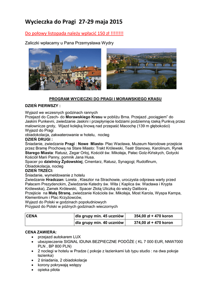 Wycieczka do Pragi 27-29 maja 2015 Do połowy listopada należy wpłacić 150 zł !!!!!!!! Zaliczki wpłacamy u Pana Przemysława Wydry PROGRAM WYCIECZKI DO PRAGI I MORAWSKIEGO KRASU DZIEŃ PIERWSZY : Wyjazd we wczesnych godzinach rannych Przejazd do Czech- do Morawskiego Krasu w pobliżu Brna. Przejazd „pociągiem” do Jaskini Punkevni, zwiedzanie Jaskini i przepłynięcie łodziami podziemną rzeką Punkvą przez malownicze groty, Wjazd kolejką linową nad przepaść Macochę (139 m głębokości) Wyjazd do Pragi obiadokolacja, zakwaterowanie w hotelu, nocleg DZIEŃ DRUGI : Śniadanie, zwiedzanie Pragi : Nowe Miasto- Plac Wacława, Muzeum Narodowe przejście przez Bramę Prochową na Stare Miasto: Trakt Królewski, Teatr Stanowy, Karolinum, Rynek Starego Miasta: Ratusz, Zegar Orloj, Kościół św. Mikołaja, Pałac Golz-Kińskych, Gotycki Kościół Marii Panny, pomnik Jana Husa. Spacer po dzielnicy Żydowskiej, Cmentarz, Ratusz, Synagogi; Rudolfinum, Obiadokolacja, nocleg DZIEŃ TRZECI: Śniadanie, wymeldowanie z hotelu Zwiedzanie Hradczan: Loreta , Klasztor na Strachowie, uroczysta odprawa warty przed Pałacem Prezydenckim, Zwiedzanie Katedry św. Wita ( Kaplica św. Wacława i Krypta Królewska), Zamek Królewski, Spacer Złotą Uliczką do wieży Dalibora , Przejście na Małą Stranę, zwiedzanie Kościoła św. Mikołaja, Most Karola, Wyspa Kampa, Klementinum i Plac Krzyżowców, Wyjazd do Polski w godzinach popołudniowych Przyjazd do Polski w późnych godzinach wieczornych CENA dla grupy min. 45 uczniów 354,00 zł + 470 koron dla grupy min. 40 uczniów 374,00 zł + 470 koron CENA ZAWIERA: przejazd autokarem LUX ubezpieczenie SIGNAL IDUNA BEZPIECZNE PODÓŻE ( KL 7 000 EUR, NNW7000 PLN , BP 800 PLN) 2 noclegi w hotelu w Pradze ( pokoje z łazienkami lub typu studio : na dwa pokoje łazienka) 2 śniadania, 2 obiadokolacje korony pokrywają wstępy opieka pilota