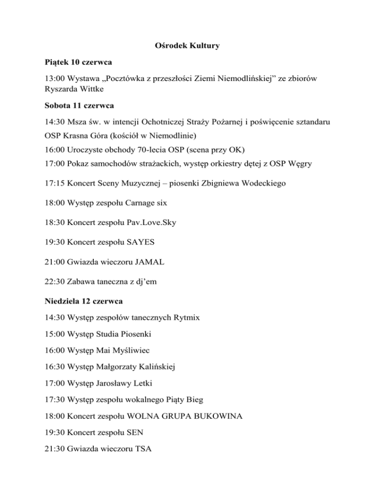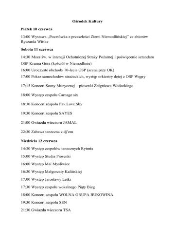 Ośrodek Kultury Piątek 10 czerwca 13:00 Wystawa „Pocztówka z przeszłości Ziemi Niemodlińskiej” ze zbiorów Ryszarda Wittke Sobota 11 czerwca 14:30 Msza św. w intencji Ochotniczej Straży Pożarnej i poświęcenie sztandaru OSP Krasna Góra (kościół w Niemodlinie) 16:00 Uroczyste obchody 70-lecia OSP (scena przy OK) 17:00 Pokaz samochodów strażackich, występ orkiestry dętej z OSP Węgry 17:15 Koncert Sceny Muzycznej – piosenki Zbigniewa Wodeckiego 18:00 Występ zespołu Carnage six 18:30 Koncert zespołu Pav.Love.Sky 19:30 Koncert zespołu SAYES 21:00 Gwiazda wieczoru JAMAL 22:30 Zabawa taneczna z dj’em Niedziela 12 czerwca 14:30 Występ zespołów tanecznych Rytmix 15:00 Występ Studia Piosenki 16:00 Występ Mai Myśliwiec 16:30 Występ Małgorzaty Kalińskiej 17:00 Występ Jarosławy Letki 17:30 Występ zespołu wokalnego Piąty Bieg 18:00 Koncert zespołu WOLNA GRUPA BUKOWINA 19:30 Koncert zespołu SEN 21:30 Gwiazda wieczoru TSA