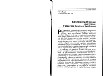 Człowiek ipoćrstwo Peter A. Redpoth John's University, New York St. Być kotolickim politykiem dziś w od powiedzi Bre nd o no"' t'#ililTl?i.tll o wspaniaĘrm uzasadnieniu moralnego prawa do religijnie uwarunkowanego Światopoglądu w sferze publicznej, jakie zaprezentował Brendan Sweetman, chciałb5rm dołączyć się do jego wystąpienia, Mocniej akcentując kwestię plusow i minusow bycia politykiem katolickim dziś.Będę chciał prrytoczyć tutaj fragmenty wystąpienia Jacquesa Maritaina na pierwszym posiedzeniu plenarnym drugiej sesji ONZ, z dnia 6 listopada 1,94T rol<tt, jako przykład religijnie inspirowanych poglądow, ktore głęboko, poąrĘvrnie i racjonalnie wpływaĘ na światpolityki przez ostatnie pięćdziesiąt lat i nadal mogą odgrywać pozytyvrną ro1ę we wsp łczesnych debatach politycznych. W roku 7947 , tak jak i dziś,Maritain dostrzegał , że zyjemy wszczeg lnie niebezpiecznym momencie ludzkiej historii. Ów czas niepewnoŚ ci, czas Maritaina, dotyczyi powojennej odbudowy. Nasz jest czasem odbudowy poliĘcznych sojuszy po upadku komunizmw oraz czasem zderzenia cywilizacji. Zachodnią cywilizację drapy od wewnątrz kryzys ftlozoficznej i poliĘcznej tozsamości. Z zewnątrz zaśzagrażają inne niebezpieczenstwa: islamski faszyzm i globalny terroryzm. To, w jaki sposob odpowiemy na te wyzwania, określinasząbliższą i dalszą przyszłość,rrasze przetrwanie. W odniesieniu do obu rodzaj w zagroŻenia katolicki polityk, inspirując się myŚlą Maritaina, m głby 77 Być kotolickim politykiem dziś- plusy i minusy. W odpowiedzi... Peter A. Redpoth odegrać istotną ro1ę w zachowaniu zachodniej cywilizacji i Światowego pokoju. Maritain doskonale zdavłałsobie sprawę z tego, że katolicyzrn łączy ftlozoftczną tożsamoścZachodu z jego }::istorycznymi korzeniami. Wiedza przechow5rwana w katolickiej tradycji pozutala odzyskać właściwerozumienie chrześcij a skich, metaftzy cznych, moralnych i teologicznych korzeni Zadnodu tlcwiących w nauczaniu KoŚcioła o godności osoby ludzkiej, wynikającej z Wcielertia, oraz w ft\ozoftcznych tradycjach starożytnej Grecji i Rzymu. Te intelektualne korzenie miaĘ wręcz fundamentalne znaczenie dla rozrvoju nowożytnej nauki, demokratycznych rząd w, jak i Deklaracji Praw Człowieka oNZ. Bez tycb korzeni zachodnia cywilŁacja nie przetrwa. Chyli się ona ku upadkowi, ponieważ nie tylko utraciła swoją teologiczną wiarę, ale i swoj umysł ftlozoficzny. Znając te korzenie i odwołując się do nich w Ęciu politycznym, katolicki polityk, w przeciwienstwie do naturalisty czry sekularysĘr, może wnieŚć do wsp łczesnej polityki ten rodzaj dyskursu, od kt rego zdeĘ rrasze przyszłe przetrwanie i kt ry pomoże nam bronić się zatowno przed zagroŻeniami wewnętrznymi, jak i zewnętrznymi. Przemowienie Maritaina z 1'947 roL<tl dotyczyło pięciu powiązanych ze sobą i mających swe źrodłow historii kwestii, ktorych rozvłiryanie, jak mniemał, miało istotnie okreŚlić kierunek dziejow Świata: (1) absolutnej suwerennościnarodowej, (2) makiawelizmu, (3) politycznego realizml;- lRealpotitikl, (4) przekroczenia swoistego pomieszania |babelism] myś1iwspołczesnej, (5) oraz pogodzenia mądrości z nauką, szczegolnie we wspołczesnej technice. W naszych czasach,jak sądzę, katoliccy politycy są o wiele lepiej przygotowani niż większośćnaturalistow i sekularystow, aby podjąć się przewodniej roli w dostrzeżeniu mozliwości rozvłiryania tych problemow w porządku poIitycznym - zarowno na poziomie polityki narodowej, jak i międzynarodowej. 78 Dla Maritaina gł wnym problemem wsp łczesnej polityki jest absolutna suwerennośćnarodowa, ponieważ: po pierwsze, zakładają wspołczesny porządek polityczny; po drugie, w sensie fiozoficznym doktryna absolutnej suwerenności głosi zasadę prawa silniejszego oraz, że narodoo.ry interes ma pierwszeristwo przed wszelkimi innymi względami. Krotko m wiąc, mamy do czynienia z uzasadnianiem polityki przez odwołanie do makiawelizmu, ktore sprawia, że wszelkie odwotywanie się do prawa naturalnego czy teorii wojny sprawiedliwej jest w najgorszym razie ignotowane, w najlepszym uznawane za niespojne. Jak po strasznym doŚwiadczeniu drugiej wojny światowej narody mogą czuć się moralnie usprawiedliwione w swoic}:. Żądaniach absolutnej suwerennoŚci? Jakim sposobem wspołczesne paristwo narodowe może odwoływać się do teorii wojny sprawiedliwej, gdy ze swojej istoty zakŁada ono prymat interesu narodowego nad wszystkim innym, włącznie z prawem naturalnym? TWierdzenie, że polityka powinna być neutralna względem niezalcżnych od umysłu ludzkiego dobra i zła, Maritain nazywa ,,ludobojczym błędem''. Podobnie jak Sokrates, rozmawiający z Kalliklesem w Platonskim Gorgiaszu, Maritain wskazuje, że dokŁryna głosząca zasadę prawa silniejszego, chociaż doraŹnie rnoże przynieśćsukces, w ostateczrlym rozrachunku prowadzi do absolutnej tyranii. Absolutny makiaw elizm ostateczni e zuly cięża jedynie z makiawelizmem umiarkowanym. Dalej Maritain mowi nam, iż jedynie odpowiedni klimat duchowy, zdolny do uznania prawdziwych bohaterow, lnoże nadać sprawiedliwości politycznej moc obalenia zasad i potęgi makiawelizmu. Najwyraźniej tego rodzaju klimat jest przesiąknięty duchem metafizyki i moralności, realny we wkład mają katolicyzm i katoliccy politycy (nie naturaliści i sekularyści) - głownie dzięki walce z makiawelizmem oraz staraniom o odpowiednie warunki ducho- 79 Być kotolickim politykiem dziś - plusy i minusy. W odpowiedzi... Peter A. Redpoth we w świecie polityki, dziwych bohaterow. kt re sprzyjają powstawaniu praw- nauki ftzykalne z prawdami klasycznej etyki, metafizyki i religii. Tego wspołczesny naturalizm i sekularyzrn nigdy Zdanriem Maritaina, problem reaJizmu politycznego jest następstwem makiawelŁmu. W czasach Maritaina problem ten obejmował kwestię, jak podchodzić do moralnego odbywania niemieckiego nazizmu. Obecn