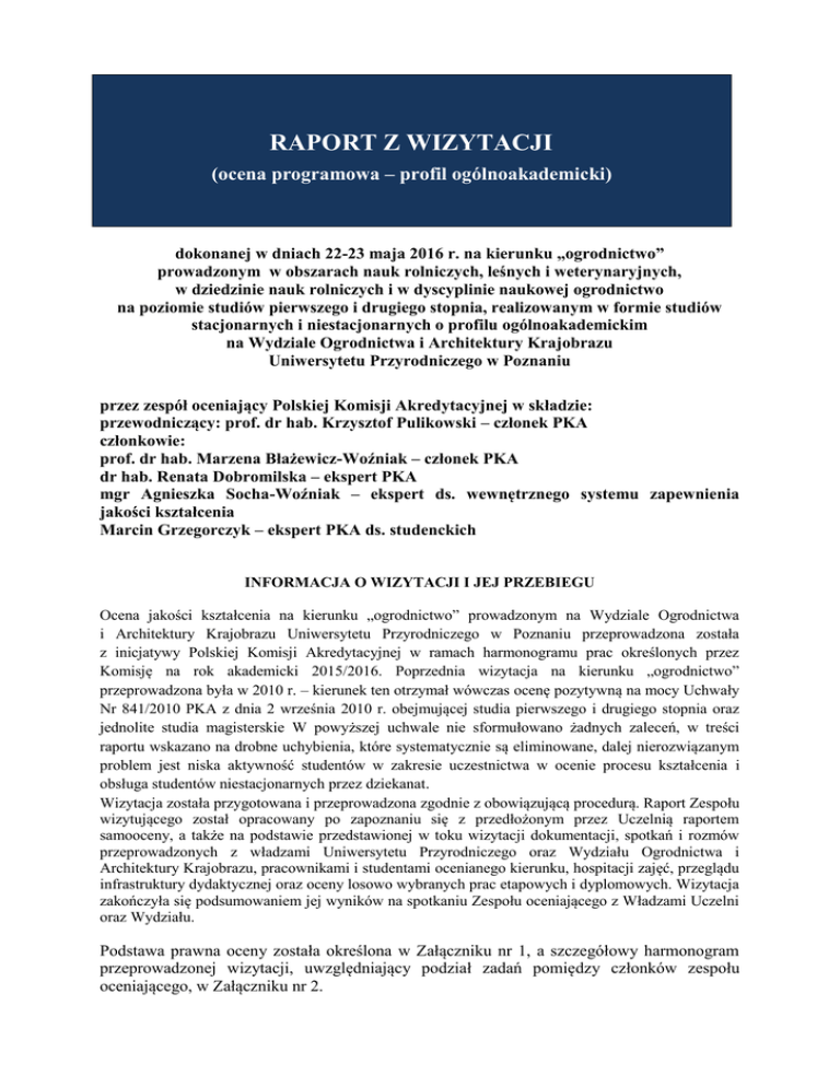 RAPORT Z WIZYTACJI (ocena programowa – profil ogólnoakademicki) dokonanej w dniach 22-23 maja 2016 r. na kierunku „ogrodnictwo” prowadzonym w obszarach nauk rolniczych, leśnych i weterynaryjnych, w dziedzinie nauk rolniczych i w dyscyplinie naukowej ogrodnictwo na poziomie studiów pierwszego i drugiego stopnia, realizowanym w formie studiów stacjonarnych i niestacjonarnych o profilu ogólnoakademickim na Wydziale Ogrodnictwa i Architektury Krajobrazu Uniwersytetu Przyrodniczego w Poznaniu przez zespół oceniający Polskiej Komisji Akredytacyjnej w składzie: przewodniczący: prof. dr hab. Krzysztof Pulikowski – członek PKA członkowie: prof. dr hab. Marzena Błażewicz-Woźniak – członek PKA dr hab. Renata Dobromilska – ekspert PKA mgr Agnieszka Socha-Woźniak – ekspert ds. wewnętrznego systemu zapewnienia jakości kształcenia Marcin Grzegorczyk – ekspert PKA ds. studenckich INFORMACJA O WIZYTACJI I JEJ PRZEBIEGU Ocena jakości kształcenia na kierunku „ogrodnictwo” prowadzonym na Wydziale Ogrodnictwa i Architektury Krajobrazu Uniwersytetu Przyrodniczego w Poznaniu przeprowadzona została z inicjatywy Polskiej Komisji Akredytacyjnej w ramach harmonogramu prac określonych przez Komisję na rok akademicki 2015/2016. Poprzednia wizytacja na kierunku „ogrodnictwo” przeprowadzona była w 2010 r. – kierunek ten otrzymał wówczas ocenę pozytywną na mocy Uchwały Nr 841/2010 PKA z dnia 2 września 2010 r. obejmującej studia pierwszego i drugiego stopnia oraz jednolite studia magisterskie W powyższej uchwale nie sformułowano żadnych zaleceń, w treści raportu wskazano na drobne uchybienia, które systematycznie są eliminowane, dalej nierozwiązanym problem jest niska aktywność studentów w zakresie uczestnictwa w ocenie procesu kształcenia i obsługa studentów niestacjonarnych przez dziekanat. Wizytacja została przygotowana i przeprowadzona zgodnie z obowiązującą procedurą. Raport Zespołu wizytującego został opracowany po zapoznaniu się z przedłożonym przez Uczelnią raportem samooceny, a także na podstawie przedstawionej w toku wizytacji dokumentacji, spotkań i rozmów przeprowadzonych z władzami Uniwersytetu Przyrodniczego oraz Wydziału Ogrodnictwa i Architektury Krajobrazu, pracownikami i studentami ocenianego kierunku, hospitacji zajęć, przeglądu infrastruktury dydaktycznej oraz oceny losowo wybranych prac etapowych i dyplomowych. Wizytacja zakończyła się podsumowaniem jej wyników na spotkaniu Zespołu oceniającego z Władzami Uczelni oraz Wydziału. Podstawa prawna oceny została określona w Załączniku nr 1, a szczegółowy harmonogram przeprowadzonej wizytacji, uwzględniający podział zadań pomiędzy członków zespołu oceniającego, w Załączniku nr 2. OCENA SPEŁNIENIA KRYTERIÓW OCENY PROGRAMOWEJ DLA KIERUNKÓW STUDIÓW O PROFILU OGÓLNOAKADEMICKIM Ocena końcowa spełnienia kryterium*) Kryterium oceny wyróżniająco 1. Jednostka sformułowała koncepcję kształcenia i realizuje na ocenianym kierunku studiów program kształcenia umożliwiający osiągnięcie zakładanych efektów kształcenia 2. Liczba i jakość kadry naukowodydaktycznej oraz prowadzone w jednostce badania naukowe1 zapewniają realizację programu kształcenia na ocenianym kierunku oraz osiągnięcie przez studentów zakładanych efektów kształcenia 3. Współpraca z otoczeniem społecznym, gospodarczym lub kulturalnym w procesie kształcenia 4. Jednostka dysponuje infrastrukturą dydaktyczną i naukową umożliwiającą realizację programu kształcenia o profilu ogólnoakademickim i osiągnięcie przez studentów zakładanych efektów kształcenia, oraz prowadzenie badań naukowych 5. Jednostka zapewnia studentom wsparcie w procesie uczenia się, prowadzenia badań i wchodzenia na rynek pracy 6. W jednostce działa skuteczny wewnętrzny system zapewniania jakości kształcenia zorientowany na ocenę realizacji efektów kształcenia i doskonalenia programu kształcenia oraz podniesienie jakości na ocenianym kierunku studiów *) – ocena dotyczy obu stopnia kształcenia 1 w pełni znacząco częściowo niedostatecznie X*) X X X X X Określenia: obszar wiedzy, dziedzina nauki i dyscyplina naukowa, dorobek naukowy, osiągnięcia naukowe, stopień i tytuł naukowy oznaczają odpowiednio: obszar sztuki, dziedziny sztuki i dyscypliny artystyczne, dorobek artystyczny, osiągnięcia artystyczne oraz stopień i tytuł w zakresie sztuki. 1. Jednostka sformułowała koncepcję kształcenia i realizuje na ocenianym kierunku studiów program kształcenia umożliwiający osiągnięcie zakładanych efektów kształcenia. 1.1. Koncepcja kształcenia na ocenianym kierunku studiów jest zgodna z misją i strategią rozwoju uczelni, odpowiada celom określonym w strategii jednostki oraz w polityce zapewnienia jakości, a także uwzględnia wzorce i doświadczenia krajowe i międzynarodowe właściwe dla danego zakresu kształcenia.* 1.2 Plany rozwoju kierunku uwzględniają tendencje zmian zachodzących w dziedzinach nauki i dyscyplinach naukowych, z których kierunek się wywodzi, oraz są zorientowane na potrzeby otoczenia społecznego, gospodarczego lub kulturalnego, w tym w szczególności rynku pracy. 1.3 Jednostka przyporządkowała oceniany kierunek studiów do obszaru/obszarów kształcenia oraz wskazała dziedzinę/dziedziny nauki oraz dyscyplinę/dyscypliny naukowe, do których odnoszą się efekty kształcenia dla ocenianego kierunku. 1.4. Efekty kształcenia zakładane dla ocenianego kierunku studiów są spójne z wybranymi efektami kształcenia dla obszaru/obszarów kształcenia, poziomu i profilu ogólnoakademickiego, do którego/których kierunek ten został przyporządkowany, określonymi w Krajowych Ramach Kwalifikacji dla Szkolnictwa Wyższego, sformułowane w sposób zrozumiały i pozwalający na stworzenie systemu ich weryfikacji. W przypadku kierunków studiów, o których mowa w art. 9b, oraz kształcenia przygotowującego do wyk