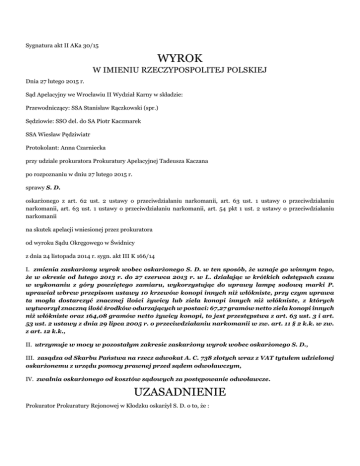 Sygnatura akt II AKa 30/15 WYROK W IMIENIU RZECZYPOSPOLITEJ POLSKIEJ Dnia 27 lutego 2015 r. Sąd Apelacyjny we Wrocławiu II Wydział Karny w składzie: Przewodniczący: SSA Stanisław Rączkowski (spr.) Sędziowie: SSO del. do SA Piotr Kaczmarek SSA Wiesław Pędziwiatr Protokolant: Anna Czarniecka przy udziale prokuratora Prokuratury Apelacyjnej Tadeusza Kaczana po rozpoznaniu w dniu 27 lutego 2015 r. sprawy S. D. oskarżonego z art. 62 ust. 2 ustawy o przeciwdziałaniu narkomanii, art. 63 ust. 1 ustawy o przeciwdziałaniu narkomanii, art. 63 ust. 1 ustawy o przeciwdziałaniu narkomanii, art. 54 pkt 1 ust. 2 ustawy o przeciwdziałaniu narkomanii na skutek apelacji wniesionej przez prokuratora od wyroku Sądu Okręgowego w Świdnicy z dnia 24 listopada 2014 r. sygn. akt III K 166/14 I. zmienia zaskarżony wyrok wobec oskarżonego S. D. w ten sposób, że uznaje go winnym tego, że w okresie od lutego 2013 r. do 27 czerwca 2013 r. w L. działając w krótkich odstępach czasu w wykonaniu z góry powziętego zamiaru, wykorzystując do uprawy lampę sodową marki P. uprawiał wbrew przepisom ustawy 10 krzewów konopi innych niż włókniste, przy czym uprawa ta mogła dostarczyć znacznej ilości żywicy lub ziela konopi innych niż włókniste, z których wytworzył znaczną ilość środków odurzających w postaci: 67,27 gramów netto ziela konopi innych niż włókniste oraz 164,08 gramów netto żywicy konopi, to jest przestępstwa z art. 63 ust. 3 i art. 53 ust. 2 ustawy z dnia 29 lipca 2005 r. o przeciwdziałaniu narkomanii w zw. art. 11 § 2 k.k. w zw. z art. 12 k.k., II. utrzymuje w mocy w pozostałym zakresie zaskarżony wyrok wobec oskarżonego S. D., III. zasądza od Skarbu Państwa na rzecz adwokat A. C. 738 złotych wraz z VAT tytułem udzielonej oskarżonemu z urzędu pomocy prawnej przed sądem odwoławczym, IV. zwalnia oskarżonego od kosztów sądowych za postępowanie odwoławcze. UZASADNIENIE Prokurator Prokuratury Rejonowej w Kłodzku oskarżył S. D. o to, że : I w dniu 27 czerwca 2013 r. w L., woj. (...), wbrew przepisom ustawy posiadał znaczną ilość środków odurzających w postaci ziela konopi innych niż włókniste w ilości 62,70 gramów netto oraz żywicy konopi w ilości 132,41 gramów netto, tj. o czyn z art. 62 ust. 2 ustawy z dnia 29 lipca 2005 r. o przeciwdziałaniu narkomanii, II w okresie od lutego 2013 r. do 27 czerwca 2013 r. w L., woj. (...), wbrew przepisom ustawy uprawiał trzy krzewy konopi innych niż włókniste, tj. o czyn z art. 63 ust. 1 ustawy z dnia 29 lipca 2005 r. o przeciwdziałaniu narkomanii, III w czerwcu 2013 r. w L., woj. (...), wbrew przepisom ustawy uprawiał osiem krzewów konopi innych niż włókniste, tj. o czyn z art. 63 ust. 1 ustawy z dnia 29 lipca 2005 r. o przeciwdziałaniu narkomanii, IV w okresie od lutego 2013 r. do czerwca 2013 r. w L., woj. (...), wbrew przepisom ustawy, przystosował lampę sodową marki P. do niedozwolonego wytwarzania środków odurzających i przy jej użyciu środki takie pozyskiwał, tj. o czyn z art. 54 ust.2 pkt 1 ustawy z dnia 29 lipca 2005 r. o przeciwdziałaniu narkomanii Sprawa została skierowana do Sądu Rejonowego w Kłodzku. Wyrokiem tego sądu z dnia 22 maja 2014 r. w sprawie o sygn. akt II K 863/13 S. D. został uznany winnym tego, że działając czynem ciągłym w wykonaniu z góry powziętego zamiaru w okresie od lutego 2013 r. do 27 czerwca 2013 r., wykorzystując do uprawy lampę sodową marki P., uprawiał wbrew przepisom ustawy 11 krzewów konopi innych niż włókniste z których wytworzył środek odurzający w postaci 62,70 gramów netto ziela konopi innych niż włókniste oraz 132,41 gramów netto żywicy konopi, to jest czynu z art. 63 ust. 1 w zw. z art. 53 ust. 1 ustawy z dnia 29 lipca 2005 r. o przeciwdziałaniu narkomanii w zw. z art. 11§2k.k. w zw. z art. 12 k.k. i za to na podstawie art. 53 ust.1 ustawy z dnia 29 lipca 2005 r. o przeciwdziałaniu narkomanii w zw. z art. 11§3k.k. i skazany na karę 10 miesięcy pozbawienia wolności. Sąd orzekł również o przepadku dowodów rzeczowych oraz zwolnił oskarżonego od kosztów sądowych. Wskazany wyrok zaskarżył rzecznik oskarżenia publicznego w całości na niekorzyść oskarżonego. Prokurator zarzucił obrazę przepisu prawa materialnego, a to art. 53 ust. 2 ustawy z dnia 29 lipca 2005 r. o przeciwdziałaniu narkomanii poprzez wyrażenie błędnego poglądu prawnego, że ilość środków odurzających, które oskarżony wytworzył na skutek uprawy nie wyczerpuje znamienia znacznej ilości środków odurzających, którego realizacja stanowi warunek przypisania znamion strony przedmiotowej w/w przestępstwa, podczas gdy ilość środków wytworzonych przez w/w oskarżonego to jest prawie 200 gramów byłaby wystarczająca do jednorazowego zaspokojenia potrzeb co najmniej kilkudziesięciu osób używających ich, co w konsekwencji uzasadniałoby przyjęcie kwalifikacji prawnej z art. 53 ust. 2 w/w ustawy. Sąd Okręgowy w Świdnicy wyrokiem z dnia 19 września 2014 r. w sprawie o sygn. akt IV Ka 629/14 w uwzględnieniu apelacji prokuratora uchylił zaskarżony wyrok i sprawę przekazał do rozpoznania sądowi pierwszej instancji, Sądowi Okręgowemu w Świdnicy. Po ponownym rozpoznaniu sprawy Sąd Okręgowy w Świdnicy wyrokiem z dnia 24 listopada 2014 r. w sprawie o sygn. akt III K 166/14 : I uznał oskarżonego S. D. winnym tego, że w okresie od lutego 2013 r. do 27 czerwca 2013 r. w L. działając w krótkich odstępach czasu w wykonaniu z góry powziętego zamiaru, wykorzystując do uprawy lampę sodową marki P. uprawiał wbrew przepisom ustawy 10 krzewów konopi innych niż włókniste, z których wytworzył środek odurzający w postaci 67,27 gramów netto ziela konopi innych niż włókniste oraz 164,08 gramów netto żywicy konopi, to jest przestępstwa z art. 63 ust. 3 i art. 53 ust. 2 ustawy z dnia 29 lipca 2005 r. o przeciwdziałaniu narkomanii w zw. z art. 11§1k.k. w zw. z art. 12 k.k. i z