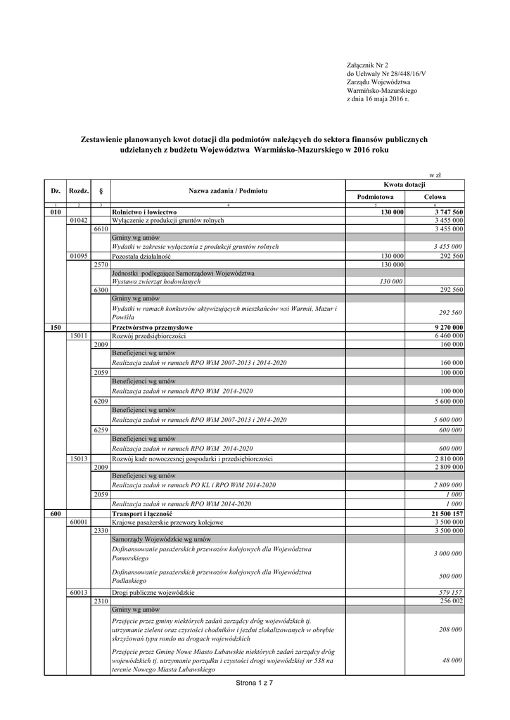 Załącznik Nr 2 do Uchwały Nr 28/448/16/V Zarządu Województwa Warmińsko-Mazurskiego z dnia 16 maja 2016 r. Zestawienie planowanych kwot dotacji dla podmiotów należących do sektora finansów publicznych udzielanych z budżetu Województwa Warmińsko-Mazurskiego w 2016 roku w zł Kwota dotacji Dz. Rozdz. § Nazwa zadania / Podmiotu 1 2 3 4 Rolnictwo i łowiectwo Wyłączenie z produkcji gruntów rolnych 010 01042 Podmiotowa Celowa 5 6 130 000 6610 Gminy wg umów Wydatki w zakresie wyłączenia z produkcji gruntów rolnych Pozostała działalność 01095 2570 Jednostki podlegające Samorządowi Województwa Wystawa zwierząt hodowlanych Gminy wg umów Wydatki w ramach konkursów aktywizujących mieszkańców wsi Warmii, Mazur i Powiśla Przetwórstwo przemysłowe Rozwój przedsiębiorczości 15011 Beneficjenci wg umów Realizacja zadań w ramach RPO WiM 2007-2013 i 2014-2020 2059 Beneficjenci wg umów Realizacja zadań w ramach RPO WiM 2014-2020 6209 Beneficjenci wg umów Realizacja zadań w ramach RPO WiM 2007-2013 i 2014-2020 6259 Beneficjenci wg umów Realizacja zadań w ramach RPO WiM 2014-2020 Rozwój kadr nowoczesnej gospodarki i przedsiębiorczości 2009 Beneficjenci wg umów Realizacja zadań w ramach PO KL i RPO WiM 2014-2020 2059 Realizacja zadań w ramach RPO WiM 2014-2020 Transport i łączność Krajowe pasażerskie przewozy kolejowe 600 60001 2330 Samorządy Wojewódzkie wg umów Dofinansowanie pasażerskich przewozów kolejowych dla Województwa Pomorskiego Dofinansowanie pasażerskich przewozów kolejowych dla Województwa Podlaskiego Drogi publiczne wojewódzkie 60013 130 000 292 560 9 270 000 6 460 000 160 000 2009 15013 3 455 000 292 560 292 560 6300 150 130 000 130 000 3 747 560 3 455 000 3 455 000 160 000 100 000 100 000 5 600 000 5 600 000 600 000 600 000 2 810 000 2 809 000 2 809 000 1 000 1 000 21 500 157 3 500 000 3 500 000 3 000 000 500 000 579 157 256 002 2310 Gminy wg umów Przejęcie przez gminy niektórych zadań zarządcy dróg wojewódzkich tj. utrzymanie zieleni oraz czystości chodników i jezdni zlokalizowanych w obrębie skrzyżowań typu rondo na drogach wojewódzkich 208 000 Przejęcie przez Gminę Nowe Miasto Lubawskie niektórych zadań zarządcy dróg wojewódzkich tj. utrzymanie porządku i czystości drogi wojewódzkiej nr 538 na terenie Nowego Miasta Lubawskiego 48 000 Strona 1 z 7 Kwota dotacji Dz. Rozdz. § Nazwa zadania / Podmiotu 1 2 3 4 Podmiotowa Celowa 5 6 Przejęcie przez Gminę Bartoszyce niektórych zadań zarządcy dróg wojewódzkich tj. utrzymanie odcinków drogi wojewódzkiej nr 592 w ciągu ul. Kętrzyńskiej i Bohaterów Warszawy w miejscowości Bartoszyce. 1 Przejęcie przez Gminę Giżycko niektórych zadań zarządcy dróg wojewódzkich tj. utrzymanie porządku i czystości na nowo wybudowanym ciągu pieszo-rowerowym w ciągu drogi wojewódzkiej nr 592 w miejscowości Sterławki Małe 1 323 155 6610 Gminy wg umów Remont nawierzchni wraz z chodnikami odcinka drogi wojewódzkiej nr 531 (część ul. Warmińskiej - od skrzyżowania z ul. Mazurską do skrzyżowania z ul. Warszawską, łącznie ze skrzyżowaniami) w Łukcie 60041 500 000 500 000 Infrastruktura portowa 6209 Beneficjenci wg umów Realizacja zadań w ramach RPO WiM 2007-2013 Infrastruktura telekomunikacyjna 60053 6209 Beneficjenci wg umów Realizacja zadań w ramach RPO WiM 2007-2013 Pozostała działalność 60095 2330 Samorządy Wojewódzkie wg umów Międzynarodowa Droga Wodna E 70 Beneficjenci wg umów Realizacja zadań w ramach RPO WiM 2007-2013 i 2014 -2020 6259 Beneficjenci wg umów Realizacja zadań w ramach RPO WiM 2014-2020 Turystyka Pozostała działalność 63095 2009 Beneficjenci wg umów Realizacja zadań w ramach RPO WiM 2007-2013 i 2014 -2020 2059 Beneficjenci wg umów Realizacja zadań w ramach RPO WiM 2014-2020 2330 Samorządy Wojewódzkie wg umów Utrzymanie i rozwój Portalu projektu "Trasy rowerowe w Polsce Wschodniej promocja" Beneficjenci wg umów Realizacja zadań w ramach RPO WiM 2007-2013 i 2014 -2020 6259 Beneficjenci wg umów Realizacja zadań w ramach RPO WiM 2014-2020 Gospodarka mieszkaniowa Pozostała działalność 70095 6209 Beneficjenci wg umów Realizacja zadań w ramach RPO WiM 2007-2013 i 2014 -2020 6259 Beneficjenci wg umów Realizacja zadań w ramach RPO WiM 2014-2020 Administracja publiczna Urzędy marszałkowskie 750 75018 250 000 16 671 000 50 000 12 990 000 3 631 000 3 631 000 1 280 000 1 280 000 200 000 200 000 60 000 60 000 20 000 20 000 400 000 6209 700 500 000 250 000 250 000 50 000 12 990 000 6209 630 323 155 2008 Beneficjenci wg umów Realizacja zadań w ramach PT RPO WiM 20014-2020 Realizacja zadań w ramach RPO WiM 2007-2013 Strona 2 z 7 400 000 600 000 600 000 3 700 000 3 700 000 1 400 000 1 400 000 2 300 000 2 300 000 2 229 500 2 169 000 1 804 000 724 000 1 080 000 Kwota dotacji Dz. Rozdz. § Nazwa zadania / Podmiotu 1 2 3 4 2058 Celowa 5 6 220 000 Beneficjenci wg umów Realizacja zadań w ramach PT RPO WiM 20014-2020 6208 Beneficjenci wg umów Realizacja zadań w ramach PT RPO WiM 20014-2020 Realizacja zadań w ramach RPO WiM 2007-2013 6258 Beneficjenci wg umów Realizacja zadań w ramach PT RPO WiM 20014-2020 Promocja jednostek samorządu terytorialnego 75075 Podmiotowa 2710 220 000 130 000 70 000 60 000 15 000 15 000 50 000 50 000 Gminy wg umów 75095 Pomoc finansowa dla miasta Sępopol na utworzenie stanowiska pełnomocnika ds. Cittaslow 10 000 Pomoc finansowa dla miasta Lubawa na organizację Festiwalu Miast Cittaslow 40 000 Pozostała działalność 10 500 10 500 2710 Gminy i powiaty wg umów Dotacje celowe przekazane jednostkom samorządu terytorialnego w ramach pomocy finansowej na własne zadania bieżące z zakresu współpracy międzynarodowej na wsparcie międzynarodowych wymian młodzieży Bezpieczeństwo publiczne i ochrona przeciwpożarowa Ochotnicze Straże Pożarne 754 75412 6610 10 500 1 290 000 300 000 300 000 Gminy wg umów Realizacja zadań związanych z poprawą bezpieczeństwa publiczne