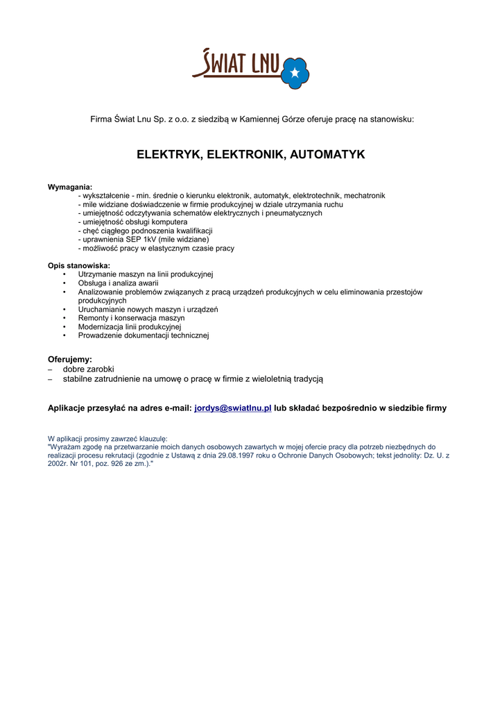 Firma Świat Lnu Sp. z o.o. z siedzibą w Kamiennej Górze oferuje pracę na stanowisku: ELEKTRYK, ELEKTRONIK, AUTOMATYK Wymagania: - wykształcenie - min. średnie o kierunku elektronik, automatyk, elektrotechnik, mechatronik - mile widziane doświadczenie w firmie produkcyjnej w dziale utrzymania ruchu - umiejętność odczytywania schematów elektrycznych i pneumatycznych - umiejętność obsługi komputera - chęć ciągłego podnoszenia kwalifikacji - uprawnienia SEP 1kV (mile widziane) - możliwość pracy w elastycznym czasie pracy Opis stanowiska: • Utrzymanie maszyn na linii produkcyjnej • Obsługa i analiza awarii • Analizowanie problemów związanych z pracą urządzeń produkcyjnych w celu eliminowania przestojów produkcyjnych • Uruchamianie nowych maszyn i urządzeń • Remonty i konserwacja maszyn • Modernizacja linii produkcyjnej • Prowadzenie dokumentacji technicznej Oferujemy: – dobre zarobki – stabilne zatrudnienie na umowę o pracę w firmie z wieloletnią tradycją Aplikacje przesyłać na adres e-mail: [email protected] lub składać bezpośrednio w siedzibie firmy W aplikacji prosimy zawrzeć klauzulę: "Wyrażam zgodę na przetwarzanie moich danych osobowych zawartych w mojej ofercie pracy dla potrzeb niezbędnych do realizacji procesu rekrutacji (zgodnie z Ustawą z dnia 29.08.1997 roku o Ochronie Danych Osobowych; tekst jednolity: Dz. U. z 2002r. Nr 101, poz. 926 ze zm.)."