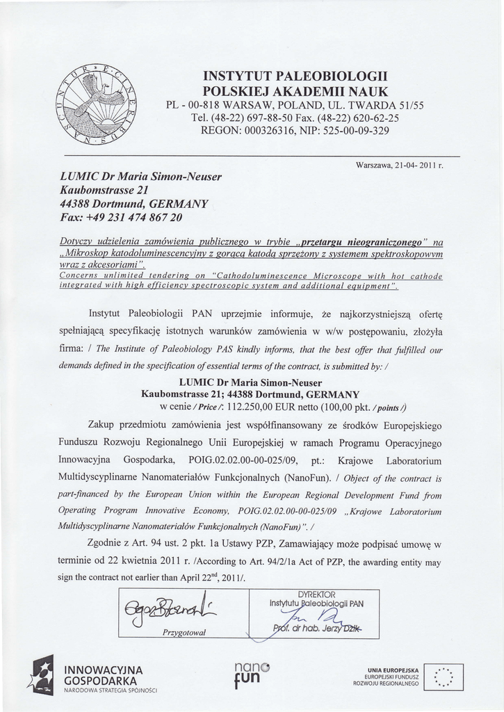 INSTYTUT PALBOBIOLOGII POLSKIEJ AKADEMII NAUK PL - OO-818 WARSAW, POLAND, UL. TWARDA 51155 Tel. (48-22)697-88-50Fax. (48-22)620-62-25 REGON: 000326316, NIP: 525-00-09-329 Warszawa.2l-04- 2011r. LUMIC Dr Maria Simon-Neuser Kaubomstrasse2I 44388 Dortmund, GERMANY Fax: +49231 474 867 20 Dotvc4v udzielenia ząmówienia publiczneqo w tr}lbie ,,przetargu nieograniczonego', na ,,Milcroskop kntodoluminescenc]ljn}lz qorąca lutodą sprzeżonyz systememspehroskopowvm wraz z akcesoriami". Concerns unlimited tendering on ,,Cathodoluminescence Microscope with hot cąthode inteerąted with high efficiency spectroscooic system ąnd ądditionąl equipment,,. Instytut Paleobiologii PAN uprzejmie informuje' ze najkorzystniejszą ofertę spełniającąspecyfikację istotnych warunków zamówienia w w/w postępowaniu,złoŻyła firma: I The Instituteof Paleobiologt PAS kindly informs,that the best offer thatfulfilled our demandsdefinedin thespeciJicationof essentiąltermsof thecontract,is submittedby:/ LUMIC Dr Maria Simon-Neuser Kaubomstrasse21; 44388Dońmund' GERMANY w cenie/ Price/: 112.250,00EUR netto(100,00pkt. / points/) Zakup przedmiotu zamówienia jest współfinansowanyze środkówEuropejskiego Funduszu Rozwoju Regionalnego Unii Europejskiej w ramach Programu Operacyjnego Innowacyjna Gospodarka, POIG.02.02.00-00-0f5109,pt.: Krajowe Laboratorium MultidyscyplinameNanomateriałówFunkcjonalnych(NanoFun).l object of the contrąctis part-financed by the European Union within the European Regional Development Fund from operating Program Innovative Economy, PoIG.02.02.00.00-025/09 ,,Krajowe Laborątorium Mul tidyscypl inarn e N anomąter i ałów F unlrcjonalnych (NanoF un),,. / Zgodniez Art,94 ust.2 pkt.la UstawyPZP, Zamawiającymoię podpisaćumowęw terminieod 22 kwietnia 20l| r. /Accordingto Art. 94/2/|aAct of PZP, theawardingentiĘmay sign the contractnot earlier than April 22"d,f}ll/. lnstyfutu loleobiologiiPAN Łą, dr hqb,JerryYftK INNOWACYJNA GOSPODARKA NARoDoWA sTRATEcIAsPoJNośCI nCIn# fun UNIA EUROPEJSKA EUROPEJSKI FUNDUSZ ROZWOJUREGIONALNEGO r-- --l li...il