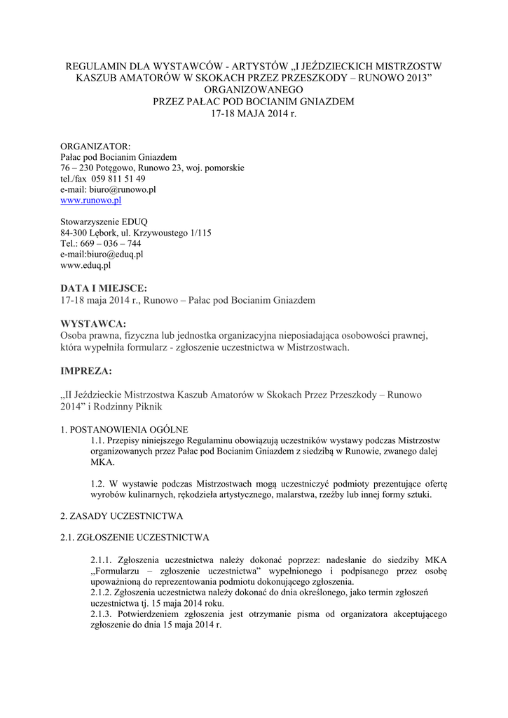REGULAMIN DLA WYSTAWCÓW - ARTYSTÓW „I JEŹDZIECKICH MISTRZOSTW KASZUB AMATORÓW W SKOKACH PRZEZ PRZESZKODY – RUNOWO 2013” ORGANIZOWANEGO PRZEZ PAŁAC POD BOCIANIM GNIAZDEM 17-18 MAJA 2014 r. ORGANIZATOR: Pałac pod Bocianim Gniazdem 76 – 230 Potęgowo, Runowo 23, woj. pomorskie tel./fax 059 811 51 49 e-mail: [email protected] www.runowo.pl Stowarzyszenie EDUQ 84-300 Lębork, ul. Krzywoustego 1/115 Tel.: 669 – 036 – 744 e-mail:[email protected] www.eduq.pl DATA I MIEJSCE: 17-18 maja 2014 r., Runowo – Pałac pod Bocianim Gniazdem WYSTAWCA: Osoba prawna, fizyczna lub jednostka organizacyjna nieposiadająca osobowości prawnej, która wypełniła formularz - zgłoszenie uczestnictwa w Mistrzostwach. IMPREZA: „II Jeździeckie Mistrzostwa Kaszub Amatorów w Skokach Przez Przeszkody – Runowo 2014” i Rodzinny Piknik 1. POSTANOWIENIA OGÓLNE 1.1. Przepisy niniejszego Regulaminu obowiązują uczestników wystawy podczas Mistrzostw organizowanych przez Pałac pod Bocianim Gniazdem z siedzibą w Runowie, zwanego dalej MKA. 1.2. W wystawie podczas Mistrzostwach mogą uczestniczyć podmioty prezentujące ofertę wyrobów kulinarnych, rękodzieła artystycznego, malarstwa, rzeźby lub innej formy sztuki. 2. ZASADY UCZESTNICTWA 2.1. ZGŁOSZENIE UCZESTNICTWA 2.1.1. Zgłoszenia uczestnictwa należy dokonać poprzez: nadesłanie do siedziby MKA ,,Formularzu – zgłoszenie uczestnictwa” wypełnionego i podpisanego przez osobę upoważnioną do reprezentowania podmiotu dokonującego zgłoszenia. 2.1.2. Zgłoszenia uczestnictwa należy dokonać do dnia określonego, jako termin zgłoszeń uczestnictwa tj. 15 maja 2014 roku. 2.1.3. Potwierdzeniem zgłoszenia jest otrzymanie pisma od organizatora akceptującego zgłoszenie do dnia 15 maja 2014 r. 2.1.4. Formularz zgłoszeniowy należy wypełnić w całości, wpisując szczegółowe informacje w miejscach, które tego wymagają. Brak wypełnionej rubryki uznany zostanie za rezygnację z uczestnictwa w wystawie. 2.1.5. Przekazanie powierzchni wystawienniczej nastąpi w dniu Mistrzostw (17.05.2014 r. lub 18.05.2013 – według indywidualnych ustaleń) 2.1.6. Uczestnictwo jest bezpłatne. Każdy uczestnik przekaże jedną ze swoich prac na rzecz Mistrzostw. 2.2. ODWOŁANIE UCZESTNICTWA 2.2.1. Każdy zgłaszający ma prawo do odwołania swego udziału w imprezie. 2.2.2. Odwołanie uczestnictwa lub odstąpienie od udziału w imprezie wymaga zgłoszenie w formie pisemnej. Za pisemną formę uważa się przesłanie rezygnacji drogą pocztową, faksem lub w formie elektronicznej 2.2.3. Odstąpienie od udziału uczestnictwa w imprezie w terminie krótszym niż 15 dni przed rozpoczęciem imprezy. 3. PRZEPISY PORZĄDKOWE 3.1. Okresy montażu i demontażu stoiska określane zostaną indywidualnie z każdym wystawcą. 3.2. W godzinach otwarcia wystawy stoiska powinny być dostępne dla zwiedzających. Wystawa będzie otwarta w godzinach 9 – 17. 3.3. Sprzątanie stoisk powinno odbywać się przed otwarciem i po zamknięciu Mistrzostw dla zwiedzających. 3.5. Uczestnicy wystawy są zobowiązani przed rozpoczęciem i po zakończeniu Mistrzostw do usunięcia ze stoiska i okolicznego terenu opakowań i odpadów pozostałych po montażu (demontażu) i wyposażeniu stoiska. Odpady należy wrzucić do pojemników / kontenerów przeznaczonych na odpady mieszane. 3.6. Pozostawione bez powiadomienia organizatora MKA elementy obudowy i wyposażenia stoiska, nieusunięte przez uczestnika wystawy w okresie demontażu, uważa się za mienie porzucone. 3.7. Zabronione jest wprowadzanie (wnoszenie) na tereny MKA zwierząt. 4. ZABEZPIECZENIE TERENU 4.1. Tereny Mistrzostw są zabezpieczane przez służby zabezpieczenia MKA. 4.2. Wystawca jest zobowiązany, zarówno podczas wystawy, jak i w okresach montażu i demontażu stoiska, do zabezpieczenia na własny koszt i ryzyko eksponatów, sprzętu i urządzeń przed ewentualnymi szkodami lub ubytkami. 5. ODPOWIEDZIALNOŚĆ I UBEZPIECZENIE 5.1. MKA nie ponosi odpowiedzialności za szkody lub ubytki w mieniu uczestników wystawy, spowodowane przez osoby trzecie albo wyłącznie z winy poszkodowanego. 5.2. MKA nie ponosi odpowiedzialności za szkody w mieniu uczestników wystawy spowodowane siłą wyższą, np. pożarem, eksplozją, uderzeniem pioruna, wichurą, zalaniem wodą. 5.3. Uczestnicy wystawy powinni we własnym zakresie ubezpieczyć się z tytułu odpowiedzialności cywilnej oraz ubezpieczyć swoje mienie znajdujące się na terenach wystawy (eksponaty, sprzęt i urządzenia na stoisku, wyposażenia stoisk, mienie prywatne pojazdy służbowe itp.), zarówno na okres trwania wystawy. 5.4. Uczestnik wystawy ponosi odpowiedzialność finansową za spowodowanie szkód w mieniu MKA (uszkodzenie, zniszczenie, ubytki). Oceny szkód dokonują organizator Mistrzostw w obecności przedstawiciela uczestnika wystawy, co zostanie potwierdzone w stosownym protokole. 5.5. O wystąpieniu szkody uczestnik wystawy zobowiązany jest pisemnie powiadomić organizatora Mistrzostw. 5.6. Wystawca ponosi pełną odpowiedzialność za jakość oferowanych i sprzedawanych przez siebie produktów bezpośrednio przed klientami.