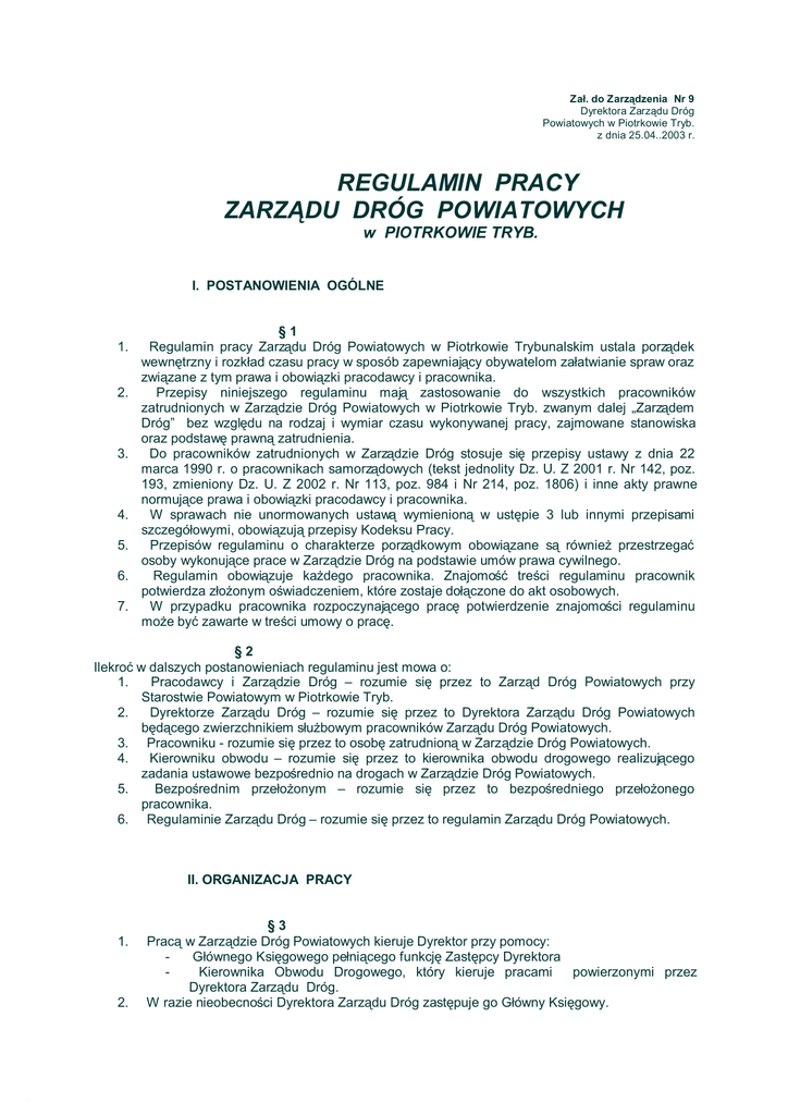 Zał. do Zarządzenia Nr 9 Dyrektora Zarządu Dróg Powiatowych w Piotrkowie Tryb. z dnia 25.04..2003 r. REGULAMIN PRACY ZARZĄDU DRÓG POWIATOWYCH w PIOTRKOWIE TRYB. I. POSTANOWIENIA OGÓLNE 1. 2. 3. 4. 5. 6. 7. §1 Regulamin pracy Zarządu Dróg Powiatowych w Piotrkowie Trybunalskim ustala porządek wewnętrzny i rozkład czasu pracy w sposób zapewniający obywatelom załatwianie spraw oraz związane z tym prawa i obowiązki pracodawcy i pracownika. Przepisy niniejszego regulaminu mają zastosowanie do wszystkich pracowników zatrudnionych w Zarządzie Dróg Powiatowych w Piotrkowie Tryb. zwanym dalej „Zarządem Dróg” bez względu na rodzaj i wymiar czasu wykonywanej pracy, zajmowane stanowiska oraz podstawę prawną zatrudnienia. Do pracowników zatrudnionych w Zarządzie Dróg stosuje się przepisy ustawy z dnia 22 marca 1990 r. o pracownikach samorządowych (tekst jednolity Dz. U. Z 2001 r. Nr 142, poz. 193, zmieniony Dz. U. Z 2002 r. Nr 113, poz. 984 i Nr 214, poz. 1806) i inne akty prawne normujące prawa i obowiązki pracodawcy i pracownika. W sprawach nie unormowanych ustawą wymienioną w ustępie 3 lub innymi przepisami szczegółowymi, obowiązują przepisy Kodeksu Pracy. Przepisów regulaminu o charakterze porządkowym obowiązane są również przestrzegać osoby wykonujące prace w Zarządzie Dróg na podstawie umów prawa cywilnego. Regulamin obowiązuje każdego pracownika. Znajomość treści regulaminu pracownik potwierdza złożonym oświadczeniem, które zostaje dołączone do akt osobowych. W przypadku pracownika rozpoczynającego pracę potwierdzenie znajomości regulaminu może być zawarte w treści umowy o pracę. §2 Ilekroć w dalszych postanowieniach regulaminu jest mowa o: 1. Pracodawcy i Zarządzie Dróg – rozumie się przez to Zarząd Dróg Powiatowych przy Starostwie Powiatowym w Piotrkowie Tryb. 2. Dyrektorze Zarządu Dróg – rozumie się przez to Dyrektora Zarządu Dróg Powiatowych będącego zwierzchnikiem służbowym pracowników Zarządu Dróg Powiatowych. 3. Pracowniku - rozumie się przez to osobę zatrudnioną w Zarządzie Dróg Powiatowych. 4. Kierowniku obwodu – rozumie się przez to kierownika obwodu drogowego realizującego zadania ustawowe bezpośrednio na drogach w Zarządzie Dróg Powiatowych. 5. Bezpośrednim przełożonym – rozumie się przez to bezpośredniego przełożonego pracownika. 6. Regulaminie Zarządu Dróg – rozumie się przez to regulamin Zarządu Dróg Powiatowych. II. ORGANIZACJA PRACY 1. 2. §3 Pracą w Zarządzie Dróg Powiatowych kieruje Dyrektor przy pomocy: Głównego Księgowego pełniącego funkcję Zastępcy Dyrektora Kierownika Obwodu Drogowego, który kieruje pracami powierzonymi przez Dyrektora Zarządu Dróg. W razie nieobecności Dyrektora Zarządu Dróg zastępuje go Główny Księgowy. 3. Przydziału zadań pracownikom w trakcie bieżącej realizacji czynności służbowych dokonuje bezpośredni przełożony. 4. W Zarządzie Dróg Powiatowych obowiązuje zasada wydawania poleceń służbowych pracownikom przez bezpośredniego przełożonego. W przypadku gdy polecenie służbowe wydał pracownikowi przełożony wyższego szczebla - pracownik, który to polecenie otrzymał, obowiązany jest polecenie wykonać po zawiadomieniu bezpośredniego przełożonego. W przypadku nieobecności bezpośredniego przełożonego pracownik, który otrzymał polecenie wykonuje je, a bezpośredniego przełożonego informuje o tym po jego powrocie do pracy. III. OBOWIAZKI PRACODAWCY §4 Do obowiązków pracodawcy należy w szczególności: 1. zaznajomienie pracowników podejmujących pracę z zakresem czynności, obowiązków, sposobem wykonywania pracy na wyznaczonych stanowiskach oraz ich podstawowymi uprawnieniami, 2. organizowanie pracy w sposób zapewniający pełne wykorzystanie czasu pracy, jak również osiąganie przez pracowników przy wykorzystaniu ich uzdolnień i kwalifikacji, wysokiej wydajności i należytej jakości pracy, 3. zapewnienie bezpiecznych i higienicznych warunków pracy oraz prowadzenie szkoleń pracowników w zakresie bezpieczeństwa i higieny pracy, 4. wypłacanie pracownikom należne im wynagrodzenie w terminie i miejscu ustalonym w niniejszym Regulaminie, 5. zaspokojenie w miarę posiadanych środków finansowych, bytowych, socjalnych i kulturowych potrzeb pracowników, 6. stosowanie obiektywnych i sprawiedliwych kryteriów oceny pracowników oraz warunków ich pracy, 7. ułatwianie pracownikom podnoszenia kwalifikacji zawodowych, 8. prowadzenie dokumentacji w sprawach związanych ze stosunkiem pracy oraz akt osobowych pracowników, a w razie rozwiązania albo wygaśnięcia stosunku pracy z pracownikiem, niezwłoczne wydanie pracownikowi świadectwa pracy, 9. kształtowanie w zakładzie zasad współżycia społecznego i nie dopuszczanie do dyskryminacji w stosunku pracy. §5 Pracodawca nie może dopuścić do pracy pracownika bez aktualnego orzeczenia lekarskiego stwierdzającego brak przeciwwskazań do pracy na danym stanowisku. 1. Przed dopuszczeniem do pracy pracodawca kieruje pracownika: na wstępne badania lekarskie w celu uzyskania zaświadczenia lekarskiego o zdolności do pracy na stanowisku, na którym ma być zatrudniony, do stanowiska pracy odpowiedzialnego za bezpieczeństwo i higienę pracy, na badania kontrolne w celu ustalenia zdolności do wykonywania pracy na dotychczasowym stanowisku w przypadku niezdolności do pracy pracownika trwającej dłużej niż 30 dni spowodowanej chorobą. 2. Pracodawca w ramach profilaktycznej opieki zdrowotnej kieruje pracownika na badania okresowe. 3. Pracownik zatrudniony na stanowisku z monitorem ekranowym, któremu lekarz podczas badań wstępnych, okresowych lub kontrolnych w zaświadczeniu lekarskim w ramach zapewnionej przez pracodawcę profilaktycznej opieki zdrowotnej zalecił pracę w okularach korygujących wzrok, może ubiegać się o refundację ich kosztów od pracodawcy. 4. Pracodawca jest obowiązany zapewnić pracowniko