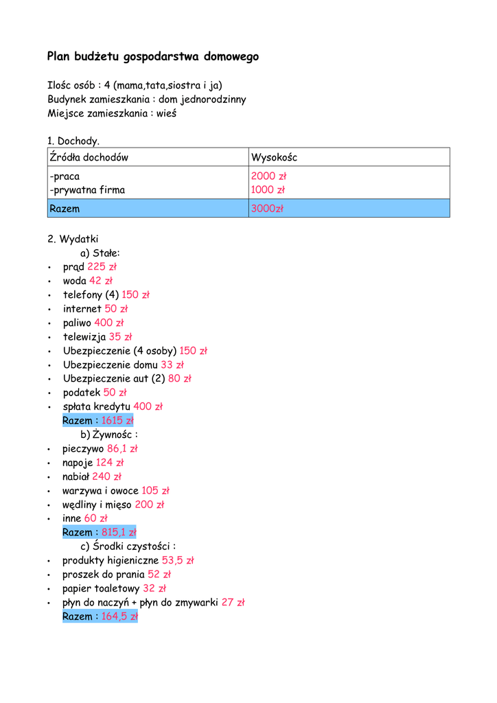 Plan budżetu gospodarstwa domowego Ilośc osób : 4 (mama,tata,siostra i ja) Budynek zamieszkania : dom jednorodzinny Miejsce zamieszkania : wieś 1. Dochody. Źródła dochodów Wysokośc -praca -prywatna firma 2000 zł 1000 zł Razem 3000zł 2. Wydatki a) Stałe: • prąd 225 zł • woda 42 zł • telefony (4) 150 zł • internet 50 zł • paliwo 400 zł • telewizja 35 zł • Ubezpieczenie (4 osoby) 150 zł • Ubezpieczenie domu 33 zł • Ubezpieczenie aut (2) 80 zł • podatek 50 zł • spłata kredytu 400 zł Razem : 1615 zł b) Żywnośc : • pieczywo 86,1 zł • napoje 124 zł • nabiał 240 zł • warzywa i owoce 105 zł • wędliny i mięso 200 zł • inne 60 zł Razem : 815,1 zł c) Środki czystości : • produkty higieniczne 53,5 zł • proszek do prania 52 zł • papier toaletowy 32 zł • płyn do naczyń + płyn do zmywarki 27 zł Razem : 164,5 zł d) Urzymanie psów : • karma 80 zł • weterynarz 10 zł Razem : 90 zł e) Wydatki szkolne : 100zł f) Odzież : 100 zł Suma wszystkich wydatków : 2884,6 Oszczędności : 3000zł – 2884,6 zł = 115,4 zł Weronika Buchcik kl. IB