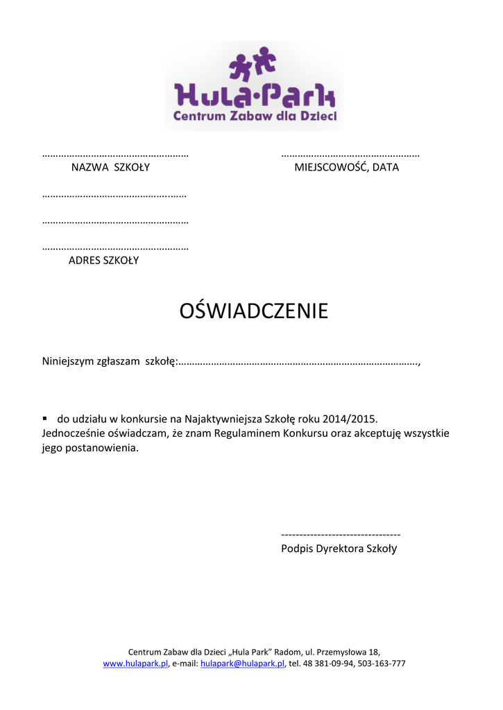 ……………………………………………… NAZWA SZKOŁY …………………………………………… MIEJSCOWOŚĆ, DATA ………………………………………..…… ……………………………………………… ……………………………………………… ADRES SZKOŁY OŚWIADCZENIE Niniejszym zgłaszam szkołę:……………………………………………………………………………., do udziału w konkursie na Najaktywniejsza Szkołę roku 2014/2015. Jednocześnie oświadczam, że znam Regulaminem Konkursu oraz akceptuję wszystkie jego postanowienia. ------------------- Podpis Dyrektora Szkoły Centrum Zabaw dla Dzieci „Hula Park” Radom, ul. Przemysłowa 18, www.hulapark.pl, e-mail: [email protected], tel. 48 381-09-94, 503-163-777 REGULAMIN KONKURSU (PROGRAMU LOJALOŚCIOWEGO) „NAJAKTYWNIEJSZA SZKOŁA ROKU 2015/2016” 1. Regulamin niniejszy określa zasady uczestnictwa w konkursie ( ROZUMIANYM JAKO PROGRAM LOJALNOŚCIOWY) organizowanym przez Hula Park ( SONG s.c.) z siedzibą w Radomiu przy ul. Przemysłowej 18, zwanym dalej Organizatorem. 2. Konkurs rozpoczyna się 1 września 2015 r. i trwa do 30 czerwca 2016 r. (włącznie). 3. Konkurs prowadzony jest na obszarze Rzeczypospolitej Polskiej. 4. W Konkursie mogą wziąć udział wszystkie szkoły podstawowe. 5. Konkurs ma na celu promowanie aktywności fizycznej wśród dzieci oraz przeciwdziałanie wadom postawy i otyłości. 6. Warunkiem przystąpienia do Konkursu jest pisemne zgłoszenie szkoły (podpisane przez Dyrektora zgłaszanej placówki) dostarczone do Organizatora Konkursu drogą mailową ([email protected]) lub pozostawienie w Centrum Zabaw dla Dzieci Hula Park. 7. Zadanie konkursowe polega na odwiedzeniu Centrum Zabaw dla Dzieci Hula Park (skorzystanie z oferty dla szkół) przez jak największą liczbę dzieci z jednej szkoły, w ciągu całego roku szkolnego 2015/2016. 8. Zasady: a) Grupy odwiedzające Centrum Zabaw dla Dzieci Hula Park powinny składać się z dzieci w wieku 5 13 lat. b) Minimalna liczba dzieci w grupie wynosi 15. c) Centrum Zabaw dla Dzieci Hula Park może odwiedzić więcej niż jedna grupa dzieci z tej samej szkoły. d) Jedna grupa (klasa) może odwiedzić Centrum Zabaw dla Dzieci Hula Park dowolną ilość razy. Przy każdej wizycie ilość dzieci doliczana jest do sumy dzieci z jednej szkoły. e) Grupy z jednej szkoły mogą przychodzić w różnych terminach, w trakcie trwania Konkursu. f) Grupy mogą wybrać dowolny rodzaj wizyty z oferty Centrum Zabaw dla Dzieci Hula Park dla szkół. g) Minimalna ilość dzieci, która kwalifikuję szkołę do odbioru nagrody to 200 dzieci. 9. Od 1 stycznia 2016 r, bieżący ranking szkół biorących udział w Konkursie, będzie można obserwować na stronie www.hulapark.pl. Ranking będzie również dostępny w Centrum Zabaw dla Dzieci Hula Park. Dane rankingu będą uzupełniane raz w miesiącu, do 4 dnia każdego miesiąca. 10. Spośród wszystkich szkół uczestniczących w Konkursie wybrane zostaną dwie, z których największa ilość uczniów (dzieci) odwiedziła Centrum Zabaw dla Dzieci Hula Park, w trakcie trwania Konkursu. 11. Nagrodą konkursową jest: a) Za miejsce I – sprzęt sportowy dla szkoły o równowartości 2000 zł brutto. Rodzaj sprzętu zostanie uzgodniony indywidualnie z Dyrektorem zwycięskiej szkoły, przy założeniu, że musi to być sprzęt wykorzystywany w trakcie lekcji WF. b) Za miejsce II – 30 wejściówek indywidualnych do Centrum Zabaw dla Dzieci Hula Park - ważne do 31 grudnia 2016. Wejściówki mogą być rozdane uczniom, którzy w minionym roku uzyskali osiągnięcia sportowe, uczestniczyli we wszystkich zajęciach WF-u , posiadają inne osiągnięcia, które zdaniem władz szkoły zasługują na nagrodę. 12. Każdy uczestnik (szkoła) Konkursu otrzyma dyplom potwierdzający udział szkoły w konkursie. 13. Wyniki Konkursu zostaną ogłoszone 6 lipca 2016 roku, na stronie: www.hulapark.pl 14. Wszystkie nagrody zostaną dostarczone przez Organizatora Konkursu do dnia 31 sierpnia 2016 r. 15. Reklamacje dotyczące wyników konkursu można składać w terminie 7 dni od daty ogłoszenia wyników, formie pisemnej, na adres Organizatora. Reklamacje zgłoszone po tym terminie nie będą przez Organizatora rozpatrywane. 16. Szkoła biorąca udział w Konkursie potwierdza, że wyraża zgodę: a) na zapisy niniejszego Regulaminie, b) na umieszczenie swoich danych osobowych w adresowej bazie danych Organizatora, c) na dalsze ich wykorzystanie i przetwarzanie w celach marketingowych, d) na zamieszczenie danych szkoły oraz liczby dzieci w rankingu konkursowym, prezentowanym na www.hulapark.pl. 17. W kwestiach nieuregulowanych w niniejszym Regulaminie zastosowanie mają przepisy polskiego prawa, w szczególności Kodeksu Cywilnego. 18. Nagroda - wydanie nagrody za zdobycie 1 miejsca nastąpi za kwotę 1 zł netto Centrum Zabaw dla Dzieci „Hula Park” Radom, ul. Przemysłowa 18, www.hulapark.pl, e-mail: [email protected], tel. 48 381-09-94, 503-163-777
