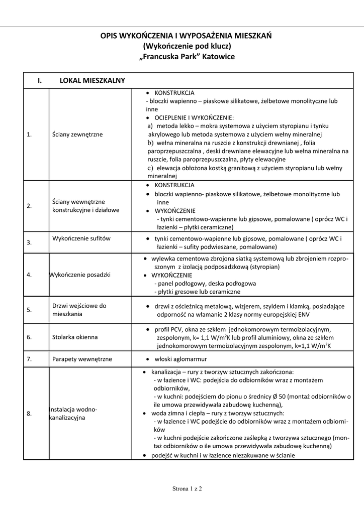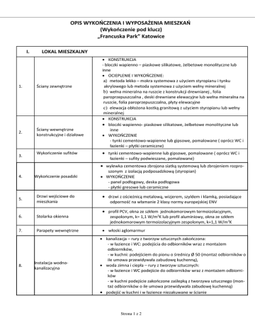 OPIS WYKOŃCZENIA I WYPOSAŻENIA MIESZKAŃ (Wykończenie pod klucz) „Francuska Park” Katowice I. LOKAL MIESZKALNY 1. Ściany zewnętrzne 2. Ściany wewnętrzne konstrukcyjne i działowe 3. Wykończenie sufitów KONSTRUKCJA - bloczki wapienno – piaskowe silikatowe, żelbetowe monolityczne lub inne OCIEPLENIE I WYKOŃCZENIE: a) metoda lekko – mokra systemowa z użyciem styropianu i tynku akrylowego lub metoda systemowa z użyciem wełny mineralnej b) wełna mineralna na ruszcie z konstrukcji drewnianej , folia paroprzepuszczalna , deski drewniane elewacyjne lub wełna mineralna na ruszcie, folia paroprzepuszczalna, płyty elewacyjne c) elewacja obłożona kostką granitową z użyciem styropianu lub wełny mineralnej KONSTRUKCJA bloczki wapienno- piaskowe silikatowe, żelbetowe monolityczne lub inne WYKOŃCZENIE - tynki cementowo-wapienne lub gipsowe, pomalowane ( oprócz WC i łazienki – płytki ceramiczne) tynki cementowo-wapienne lub gipsowe, pomalowane ( oprócz WC i łazienki – sufity podwieszane, pomalowane) wylewka cementowa zbrojona siatką systemową lub zbrojeniem rozpro 4. Wykończenie posadzki 5. Drzwi wejściowe do mieszkania 6. Stolarka okienna 7. Parapety wewnętrzne 8. Instalacja wodnokanalizacyjna szonym z izolacją podposadzkową (styropian) WYKOŃCZENIE - panel podłogowy, deska podłogowa - płytki gresowe lub ceramiczne drzwi z ościeżnicą metalową, wizjerem, szyldem i klamką, posiadające odporność na włamanie 2 klasy normy europejskiej ENV profil PCV, okna ze szkłem jednokomorowym termoizolacyjnym, zespolonym, k= 1,1 W/m2K lub profil aluminiowy, okna ze szkłem jednokomorowym termoizolacyjnym zespolonym, k=1,1 W/m 2K włoski aglomarmur kanalizacja – rury z tworzyw sztucznych zakończona: - w łazience i WC: podejścia do odbiorników wraz z montażem odbiorników, - w kuchni: podejściem do pionu o średnicy Ø 50 (montaż odbiorników o ile umowa przewidywała zabudowę kuchenną), woda zimna i ciepła – rury z tworzyw sztucznych: - w łazience i WC podejście do odbiorników wraz z montażem odbiorni ków - w kuchni podejście zakończone zaślepką z tworzywa sztucznego (mon taż odbiorników o ile umowa przewidywała zabudowę kuchenną) podejść w kuchni i w łazience niezakuwane w ścianie Strona 1 z 2 z sieci miejskiej, 9. Ogrzewanie 10. Instalacja elektryczna grzejniki płytowe, stalowe z głowicami termostatycznymi grzejnik drabinkowy w łazience gniazda 230 V zabezpieczone wyłącznikami różnicowo- prądowymi instalacja oświetleniowa – punkty zakończone kostką lub odbiornikami w kuchni dodatkowo puszka NT do kuchenki 400V (montaż odbiorników o ile umowa przewidywała zabudowę kuchenną) w mieszkaniach tablice podtynkowe 1 gniazdo telefoniczne umożliwiające podłączenie telefonii cyfrowej lub Internetu 11. Instalacja telefoniczna 12. Instalacja telewizyjna 2 gniazda TV 13. Instalacja domofonowa aparat naścienny 14. Tarasy nad garażami posadzka z kostki betonowej lub z płytek gresowych mrozoodpornych 15. Balkony posadzka z desek impregnowanych balustrady stalowe malowane proszkowo 1. Ściany zewnętrzne żelbetowe monolityczne, malowane 2. Ściany wewnętrzne żelbetowe monolityczne i silikatowe, malowane 3. Płyta posadzkowa posadzka betonowa przemysłowa utwardzona powierzchniowo 4. Strop garażu żelbetowy monolityczny, docieplony w obrębie powierzchni mieszkalnej parteru posadzka betonowa przemysłowa utwardzona powierzchniowo lub z płytek ceramicznych drzwi do pomieszczeń technicznych systemowe wydzielone ściankami działowymi, z drzwiami, i oświetleniem, nietynkowane posadzka betonowa utwardzona powierzchniowo, II. Garaż 5. Pomieszczenia techniczne 6. Komórki lokatorskie 7 Instalacje instalacja oświetlenia podstawowego, awaryjnego i ewakuacyjnego instalacja wentylacji mechanicznej III. KOMUNIKACJA WEWNĘTRZNA - KLATKI SCHODOWE 1. Ściany wewnętrzne i sufity tynk ciepłochłonny malowanie farbą akrylową 2. Posadzki, schody płytki gresowe 3. Instalacja oświetleniowa oświetlenie i osprzęt dostosowany do wymogów oświetlenia schodowego W przypadku trudności w nabyciu danego rodzaju materiału, może być zastosowany materiał zastępczy o porównywalnej jakości. Strona 2 z 2