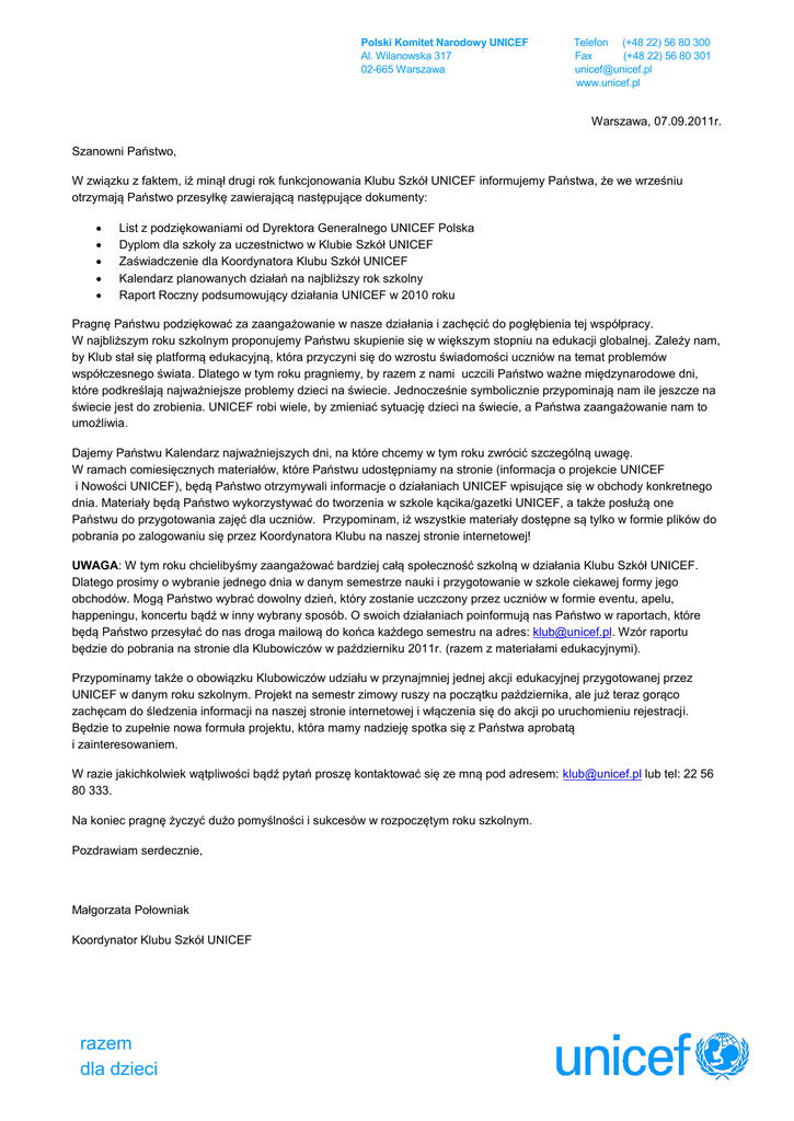 Polski Komitet Narodowy UNICEF Al. Wilanowska 317 02-665 Warszawa Telefon (+48 22) 56 80 300 Fax (+48 22) 56 80 301 [email protected] www.unicef.pl Warszawa, 07.09.2011r. Szanowni Państwo, W związku z faktem, iż minął drugi rok funkcjonowania Klubu Szkół UNICEF informujemy Państwa, że we wrześniu otrzymają Państwo przesyłkę zawierającą następujące dokumenty: List z podziękowaniami od Dyrektora Generalnego UNICEF Polska Dyplom dla szkoły za uczestnictwo w Klubie Szkół UNICEF Zaświadczenie dla Koordynatora Klubu Szkół UNICEF Kalendarz planowanych działań na najbliższy rok szkolny Raport Roczny podsumowujący działania UNICEF w 2010 roku Pragnę Państwu podziękować za zaangażowanie w nasze działania i zachęcić do pogłębienia tej współpracy. W najbliższym roku szkolnym proponujemy Państwu skupienie się w większym stopniu na edukacji globalnej. Zależy nam, by Klub stał się platformą edukacyjną, która przyczyni się do wzrostu świadomości uczniów na temat problemów współczesnego świata. Dlatego w tym roku pragniemy, by razem z nami uczcili Państwo ważne międzynarodowe dni, które podkreślają najważniejsze problemy dzieci na świecie. Jednocześnie symbolicznie przypominają nam ile jeszcze na świecie jest do zrobienia. UNICEF robi wiele, by zmieniać sytuację dzieci na świecie, a Państwa zaangażowanie nam to umożliwia. Dajemy Państwu Kalendarz najważniejszych dni, na które chcemy w tym roku zwrócić szczególną uwagę. W ramach comiesięcznych materiałów, które Państwu udostępniamy na stronie (informacja o projekcie UNICEF i Nowości UNICEF), będą Państwo otrzymywali informacje o działaniach UNICEF wpisujące się w obchody konkretnego dnia. Materiały będą Państwo wykorzystywać do tworzenia w szkole kącika/gazetki UNICEF, a także posłużą one Państwu do przygotowania zajęć dla uczniów. Przypominam, iż wszystkie materiały dostępne są tylko w formie plików do pobrania po zalogowaniu się przez Koordynatora Klubu na naszej stronie internetowej! UWAGA: W tym roku chcielibyśmy zaangażować bardziej całą społeczność szkolną w działania Klubu Szkół UNICEF. Dlatego prosimy o wybranie jednego dnia w danym semestrze nauki i przygotowanie w szkole ciekawej formy jego obchodów. Mogą Państwo wybrać dowolny dzień, który zostanie uczczony przez uczniów w formie eventu, apelu, happeningu, koncertu bądź w inny wybrany sposób. O swoich działaniach poinformują nas Państwo w raportach, które będą Państwo przesyłać do nas droga mailową do końca każdego semestru na adres: [email protected]. Wzór raportu będzie do pobrania na stronie dla Klubowiczów w październiku 2011r. (razem z materiałami edukacyjnymi). Przypominamy także o obowiązku Klubowiczów udziału w przynajmniej jednej akcji edukacyjnej przygotowanej przez UNICEF w danym roku szkolnym. Projekt na semestr zimowy ruszy na początku października, ale już teraz gorąco zachęcam do śledzenia informacji na naszej stronie internetowej i włączenia się do akcji po uruchomieniu rejestracji. Będzie to zupełnie nowa formuła projektu, która mamy nadzieję spotka się z Państwa aprobatą i zainteresowaniem. W razie jakichkolwiek wątpliwości bądź pytań proszę kontaktować się ze mną pod adresem: [email protected] lub tel: 22 56 80 333. Na koniec pragnę życzyć dużo pomyślności i sukcesów w rozpoczętym roku szkolnym. Pozdrawiam serdecznie, Małgorzata Połowniak Koordynator Klubu Szkół UNICEF razem dla dzieci