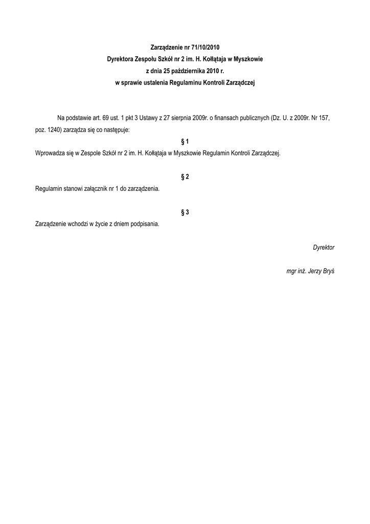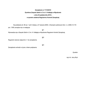 Zarządzenie nr 71/10/2010 Dyrektora Zespołu Szkół nr 2 im. H. Kołłątaja w Myszkowie z dnia 25 października 2010 r. w sprawie ustalenia Regulaminu Kontroli Zarządczej Na podstawie art. 69 ust. 1 pkt 3 Ustawy z 27 sierpnia 2009r. o finansach publicznych (Dz. U. z 2009r. Nr 157, poz. 1240) zarządza się co następuje: §1 Wprowadza się w Zespole Szkół nr 2 im. H. Kołłątaja w Myszkowie Regulamin Kontroli Zarządczej. §2 Regulamin stanowi załącznik nr 1 do zarządzenia. §3 Zarządzenie wchodzi w życie z dniem podpisania. Dyrektor mgr inż. Jerzy Bryś Załącznik nr 1 do Zarządzenia nr 71/10/2010 z dnia 25.10.2010 r. Regulaminu Kontroli Zarządczej w Zespole Szkół nr 2 im. H. Kołłątaja w Myszkowie Postanowienia ogólne §1 Ustalenia niniejszego regulaminu dotyczą sposobu organizacji i zasad przeprowadzania kontroli zarządczej w Zespole Szkół nr 2 im. H. Kołłątaja w Myszkowie. §2 Kontrola zarządcza to ogół działań podejmowanych dla zapewnienia realizacji celów i zadań w sposób zgodny z prawem, efektywny, oszczędny i terminowy, opracowany w celu dostarczenia racjonalnego zapewnienia co do realizacji celów w następujących obszarach: 1. zgodności działalności z przepisami prawa oraz procedurami wewnętrznymi, 2. skuteczności i efektywności działania, 3. wiarygodności sprawozdań, 4. ochrony zasobów, 5. przestrzegania i promowania zasad etycznego postępowania, 6. efektywności i skuteczności przepływu informacji, 7. zarządzania ryzykiem. Środowisko wewnętrzne §3 1. Zatrudnieni w szkole pracownicy samorządowi są świadomi wartości etycznych przyjętych w szkole, określonych w Kodeksie Etyki Pracowników Starostwa Powiatowego w Myszkowie, stanowiącym załącznik nr 1 do niniejszego Regulaminu. 2. Nauczyciele przestrzegają preambuły oraz art. 4 Ustawy o Systemie Oświaty (DzU. Z 2004 r. nr 256, poz. 2572 ze zm.) oraz art. 6, art. 9, art. 12 ust. 2, art. 26, art 75 Karty nauczyciela w zakresie wartości etycznych. §4 1. Rekrutacja nowych pracowników przebiega w taki sposób, aby zapewnić wybór najlepszego kandydata. 2. Rekrutację nowych pracowników przeprowadza komisja rekrutacyjna, w skład której wchodzą: a) Dyrektor, b) kierownik szkolenia praktycznego. 3. Szczegółowe wymagania dotyczące nauczycielskich kwalifikacji zawiera Rozporządzenie Ministra Edukacji Narodowej z 12 marca 2009r. w sprawie szczegółowych kwalifikacji wymaganych od nauczycieli oraz określenia szkół i wypadków, w których można zatrudnić nauczycieli niemających wyższego wykształcenia lub ukończonego zakładu kształcenia nauczycieli (Dz. U. z 2009r. Nr 50, poz. 400 ze zm.). 4. Szczegółowe wymagania dotyczące kwalifikacji zatrudnionych w szkole pracowników samorządowych określa Rozporządzenie Rady Ministrów z dnia 18 marca 2009r. w sprawie wynagradzania pracowników samorządowych (Dz. U. z 2009r. Nr 50, poz. 398 ze zm.). 5. Każdemu pracownikowi szkoły przedstawiono na piśmie opis stanowiska pracy, określający zakres jego obowiązków, uprawnień i odpowiedzialności. 6. Przyjęcie opisu stanowiska jest potwierdzone podpisem pracownika. Wzór opisu stanowiska stanowi załącznik Nr 2 do niniejszego regulaminu. §5 1. Praca nauczyciela w szkole podlega ocenie. Szczegółowe regulacje dotyczące przeprowadzenia oceny nauczyciela znajdują się w Rozporządzeniu Ministra Edukacji Narodowej z dnia 2 listopada 2000 r. w sprawie kryteriów i trybu dokonywania oceny pracy nauczyciela, trybu postępowania odwoławczego oraz składu i sposobu powoływania zespołu oceniającego (Dz. U. z 2000r. Nr 98, poz. 1066 ze zmianami). 2. Działalność dydaktyczna, wychowawcza i opiekuńcza szkoły podlega sprawowanemu nadzorowi pedagogicznemu na podstawie Rozporządzenia Ministra Edukacji Narodowej z dnia 7 października 2009 r. w sprawie nadzoru pedagogicznego (DzU z 2009 r. nr 168, poz. 1324). §6 Strukturę organizacyjną szkoły, szczegółowy zakres kompetencji dyrektora, kierownika szkolenia praktycznego i pozostałych pracowników określa regulamin pracy szkoły, stanowiący załącznik do zarządzenia dyrektora Nr 31/08/2006 z dnia 31 lipca 2006 r. Cele i zarządzanie ryzykiem §7 Misją szkoły jest wspomaganie rozwoju i edukacji dzieci w warunkach bezpiecznych, przyjaznych i dostosowanych do ich potrzeb rozwojowych. §8 1. Cele szkoły są określane w rocznej perspektywie. 2. Cele szkoły na rok kolejny określa zespół w skład którego wchodzą: a) dyrektor szkoły, b) kierownik szkolenia praktycznego 3. Zespół określa cele szkoły na rok kolejny w terminie do 15 grudnia. 4. Wyznaczone przez zespół cele są wpisywane w rejestrze celów i ryzyk stanowiącym załącznik Nr 3 do regulaminu. 5. Zespół określony w ust. 2 określa mierniki realizacji celów. Mierniki są wpisywane w rejestrze celów i ryzyk. §9 1. Raz w roku dokonywana jest identyfikacja ryzyk w odniesieniu do celów ustalonych w trybie określonym w § 8 regulaminu. 2. Zarządzanie ryzykiem odbywa się poprzez: a) identyfikację ryzyka, b) monitorowanie realizacji zadań, c) analizę ryzyka i podejmowanie działań zaradczych. 3. W procesie identyfikacji ryzyka wykorzystuje się ustalenia audytu wewnętrznego i zewnętrznego, wyniki ocen i kontroli. 4. Identyfikacji ryzyk dokonuje zespół określony w § 8 ust. 2 regulaminu. 5. O terminie przeprowadzenia identyfikacji ryzyk decyduje dyrektor szkoły. 6. Ponowna identyfikacja ryzyk jest przeprowadzana również w przypadku istotnej zmiany warunków w których funkcjonuje szkoła. 7. O przeprowadzeniu ponownej identyfikacji ryzyka decyduje dyrektor szkoły. 8. Zidentyfikowane ryzyka są wpisywane w rejestrze celów i ryzyk. 9. Zidentyfikowane ryzyka poddawane są analizie, mającej na celu określenie możliwych skutków wystąpienia danego ryzyka. 10. Analizy ryzyka dokonuje zespół określony w § 8 ust. 2 regulaminu. 11. Przewidywane skutki wystąpienia ryzyka są wpisywane w rejestrze celów i ryzyk. § 10