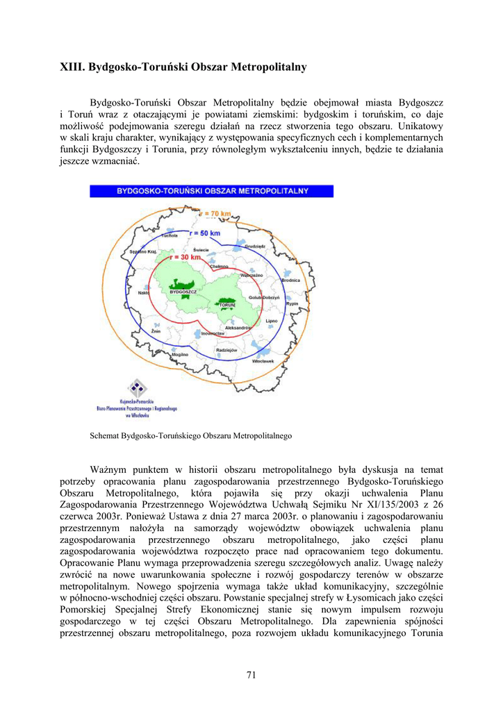 XIII. Bydgosko-Toruński Obszar Metropolitalny Bydgosko-Toruński Obszar Metropolitalny będzie obejmował miasta Bydgoszcz i Toruń wraz z otaczającymi je powiatami ziemskimi: bydgoskim i toruńskim, co daje możliwość podejmowania szeregu działań na rzecz stworzenia tego obszaru. Unikatowy w skali kraju charakter, wynikający z występowania specyficznych cech i komplementarnych funkcji Bydgoszczy i Torunia, przy równoległym wykształceniu innych, będzie te działania jeszcze wzmacniać. Schemat Bydgosko-Toruńskiego Obszaru Metropolitalnego Ważnym punktem w historii obszaru metropolitalnego była dyskusja na temat potrzeby opracowania planu zagospodarowania przestrzennego Bydgosko-Toruńskiego Obszaru Metropolitalnego, która pojawiła się przy okazji uchwalenia Planu Zagospodarowania Przestrzennego Województwa Uchwałą Sejmiku Nr XI/135/2003 z 26 czerwca 2003r. Ponieważ Ustawa z dnia 27 marca 2003r. o planowaniu i zagospodarowaniu przestrzennym nałożyła na samorządy województw obowiązek uchwalenia planu zagospodarowania przestrzennego obszaru metropolitalnego, jako części planu zagospodarowania województwa rozpoczęto prace nad opracowaniem tego dokumentu. Opracowanie Planu wymaga przeprowadzenia szeregu szczegółowych analiz. Uwagę należy zwrócić na nowe uwarunkowania społeczne i rozwój gospodarczy terenów w obszarze metropolitalnym. Nowego spojrzenia wymaga także układ komunikacyjny, szczególnie w północno-wschodniej części obszaru. Powstanie specjalnej strefy w Łysomicach jako części Pomorskiej Specjalnej Strefy Ekonomicznej stanie się nowym impulsem rozwoju gospodarczego w tej części Obszaru Metropolitalnego. Dla zapewnienia spójności przestrzennej obszaru metropolitalnego, poza rozwojem układu komunikacyjnego Torunia 71 i Bydgoszczy, niezbędne jest powiązanie komunikacyjne strefy z planowaną autostradą A-1 poprzez węzeł Turzno i z drogą krajową nr 1 i nr 80. Istotne znaczenie w dążeniach do integracji obszaru metropolitalnego miały zabiegi samorządu województwa zakończone Porozumieniem Partnerskim podpisanym przez Marszałka Województwa, prezydentów Bydgoszczy i Torunia oraz starostów powiatów bydgoskiego i toruńskiego, w dniu 20 kwietnia 2005r. w Toruniu. Zawarte porozumienie daje poczucie zacieśnienia współpracy między samorządami, kierunkuje wspólne działania samorządów na rzecz metropolii oraz powołuje Kolegium B-TOM. Podpisanie Porozumienia Partnerskiego W dniu 10 lipca 2006r. zostało podpisane porozumienie w sprawie dofinansowania zadania „Przygotowanie i opracowanie studium wykonalności dla projektu BiT City”. Obok Marszałka Województwa Waldemara Achramowicza porozumienie sygnowali: Prezydent Torunia Michał Zaleski, Wiceprezydent Bydgoszczy Lidia Wilniewczyc oraz Zastępca Naczelnego Dyrektora Oddziału Regionalnego PKP PLK S.A. w Gdańsku Włodzimierz Cerluncakiewicz. Porozumienie zobowiązuje do przeprowadzenia postępowania przetargowego w celu wyłonienia wykonawcy studium wykonalności dla inwestycji – budowy sieci szybkiej kolei, która połączy północne i południowe rejony Torunia, a także połączy Toruń z Bydgoszczą. W projekcie budowy szybkiej miejskiej kolei będzie wykorzystana istniejąca już infrastruktura kolejowa (tory, dworzec Toruń Północ), a ze względu na ekologiczne walory BiT City istnieją szansę na pozyskanie unijnych środków na tę inwestycję. 72