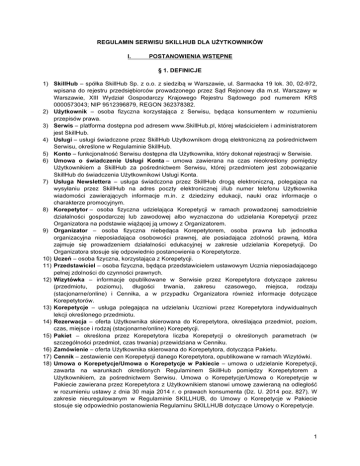 REGULAMIN SERWISU SKILLHUB DLA UŻYTKOWNIKÓW I. POSTANOWIENIA WSTĘPNE § 1. DEFINICJE 1) SkillHub – spółka SkillHub Sp. z o.o. z siedzibą w Warszawie, ul. Sarmacka 19 lok. 30, 02-972, wpisana do rejestru przedsiębiorców prowadzonego przez Sąd Rejonowy dla m.st. Warszawy w Warszawie, XIII Wydział Gospodarczy Krajowego Rejestru Sądowego pod numerem KRS 0000573043; NIP 9512396879, REGON 362378382. 2) Użytkownik – osoba fizyczna korzystająca z Serwisu, będąca konsumentem w rozumieniu przepisów prawa. 3) Serwis – platforma dostępna pod adresem www.SkillHub.pl, której właścicielem i administratorem jest SkillHub. 4) Usługi – usługi świadczone przez SkillHub Użytkownikom drogą elektroniczną za pośrednictwem Serwisu, określone w Regulaminie SkillHub. 5) Konto – funkcjonalność Serwisu dostępna dla Użytkownika, który dokonał rejestracji w Serwisie. 6) Umowa o świadczenie Usługi Konta – umowa zawierana na czas nieokreślony pomiędzy Użytkownikiem a SkillHub za pośrednictwem Serwisu, której przedmiotem jest zobowiązanie SkillHub do świadczenia Użytkownikowi Usługi Konta. 7) Usługa Newslettera – usługa świadczona przez SkillHub drogą elektroniczną, polegająca na wysyłaniu przez SkillHub na adres poczty elektronicznej i/lub numer telefonu Użytkownika wiadomości zawierających informacje m.in. z dziedziny edukacji, nauki oraz informacje o charakterze promocyjnym. 8) Korepetytor – osoba fizyczna udzielająca Korepetycji w ramach prowadzonej samodzielnie działalności gospodarczej lub zawodowej albo wyznaczona do udzielania Korepetycji przez Organizatora na podstawie wiążącej ją umowy z Organizatorem. 9) Organizator – osoba fizyczna niebędąca Korepetytorem, osoba prawna lub jednostka organizacyjna nieposiadająca osobowości prawnej, ale posiadająca zdolność prawną, która zajmuje się prowadzeniem działalności edukacyjnej w zakresie udzielania Korepetycji. Do Organizatora stosuje się odpowiednio postanowienia o Korepetytorze. 10) Uczeń – osoba fizyczna, korzystająca z Korepetycji. 11) Przedstawiciel – osoba fizyczna, będąca przedstawicielem ustawowym Ucznia nieposiadającego pełnej zdolności do czynności prawnych. 12) Wizytówka – informacje opublikowane w Serwisie przez Korepetytora dotyczące zakresu (przedmiotu, poziomu), długości trwania, zakresu czasowego, miejsca, rodzaju (stacjonarne/online) i Cennika, a w przypadku Organizatora również informacje dotyczące Korepetytorów. 13) Korepetycje – usługa polegająca na udzielaniu Uczniowi przez Korepetytora indywidualnych lekcji określonego przedmiotu. 14) Rezerwacja – oferta Użytkownika skierowana do Korepetytora, określająca przedmiot, poziom, czas, miejsce i rodzaj (stacjonarne/online) Korepetycji. 15) Pakiet – określona przez Korepetytora liczba Korepetycji o określonych parametrach (w szczególności przedmiot, czas trwania) przewidziana w Cenniku. 16) Zamówienie – oferta Użytkownika skierowana do Korepetytora, dotycząca Pakietu. 17) Cennik – zestawienie cen Korepetycji danego Korepetytora, opublikowane w ramach Wizytówki. 18) Umowa o Korepetycje/Umowa o Korepetycje w Pakiecie – umowa o udzielanie Korepetycji, zawarta na warunkach określonych Regulaminem SkillHub pomiędzy Korepetytorem a Użytkownikiem, za pośrednictwem Serwisu. Umowa o Korepetycje/Umowa o Korepetycje w Pakiecie zawierana przez Korepetytora z Użytkownikiem stanowi umowę zawieraną na odległość w rozumieniu ustawy z dnia 30 maja 2014 r. o prawach konsumenta (Dz. U. 2014 poz. 827). W zakresie nieuregulowanym w Regulaminie SKILLHUB, do Umowy o Korepetycje w Pakiecie stosuje się odpowiednio postanowienia Regulaminu SKILLHUB dotyczące Umowy o Korepetycje. 1 19) Regulamin SKILLHUB – niniejszy Regulamin Serwisu dla Użytkowników określający zasady funkcjonowania Serwisu, zasady zawierania i wykonywania Umów o Korepetycje, prawa i obowiązki SkillHub, Użytkowników, Korepetytorów i Organizatorów, Usługodawcy i Użytkowników. § 2. POSTANOWIENIA WSTĘPNE 1. Regulamin SKILLHUB określa zasady świadczenia przez SkillHub Usług na rzecz Użytkowników, zasady zawierania i wykonywania Umów o Korepetycje oraz prawa i obowiązki stron wynikające ze współpracy. 2. Serwis dostarcza narzędzi pozwalających na przeglądanie Wizytówek przez Użytkowników, komunikację między Użytkownikiem a Korepetytorem i zawieranie Umów o Korepetycje. W tym celu Serwis dostarcza Użytkownikom oraz Korepetytorom infrastrukturę teleinformatyczną niezbędną do zamieszczania Wizytówek, ich przeglądania, do komunikacji między Użytkownikiem a Korepetytorem, a także zawierania Umów o Korepetycje. II. USŁUGI ŚWIADCZONE DROGĄ ELEKTRONICZNĄ § 3. ZAKRES USŁUG, ZASADY ZAWIERANIA UMÓW ŚWIADCZENIA USŁUG 1. SkillHub świadczy Użytkownikom w szczególności następujące Usługi: 1) Usługę polegającą na możliwości przeglądania Wizytówek zamieszczonych w Serwisie, 2) Usługę Konta, polegającą na utrzymywaniu Konta w Serwisie, w szczególności ułatwiającego Użytkownikowi zawieranie Umów o Korepetycje, pozwalającego na przechowywanie danych dotyczących zawartych Umów o Korepetycje, ułatwiającego komunikację z Korepetytorami, wystawianie opinii o Korepetytorach, a także realizowanie prawa odstąpienia od Umowy o Korepetycje, 3) Usługę zawierania na odległość Umów o Korepetycje, 4) Usługę Newslettera. 2. Użytkownikiem może być Uczeń lub Przedstawiciel zgodnie z następującymi zasadami: 1) W przypadku Ucznia posiadającego pełną zdolność do czynności prawnych (>18 lat), Użytkownikiem jest Uczeń; 2) W przypadku Ucznia nieposiadającego pełnej zdolności do czynności prawnych (<18 lat), Użytkownikiem jest Przedstawiciel; 3) W przypadku Ucznia posiadającego ograniczoną zdolność do czynności prawnych (13-18 lat), Uczeń może być Użytkownikiem za zgodą Przedstawiciela. SkillHub jest uprawniony do żądania przedstaw