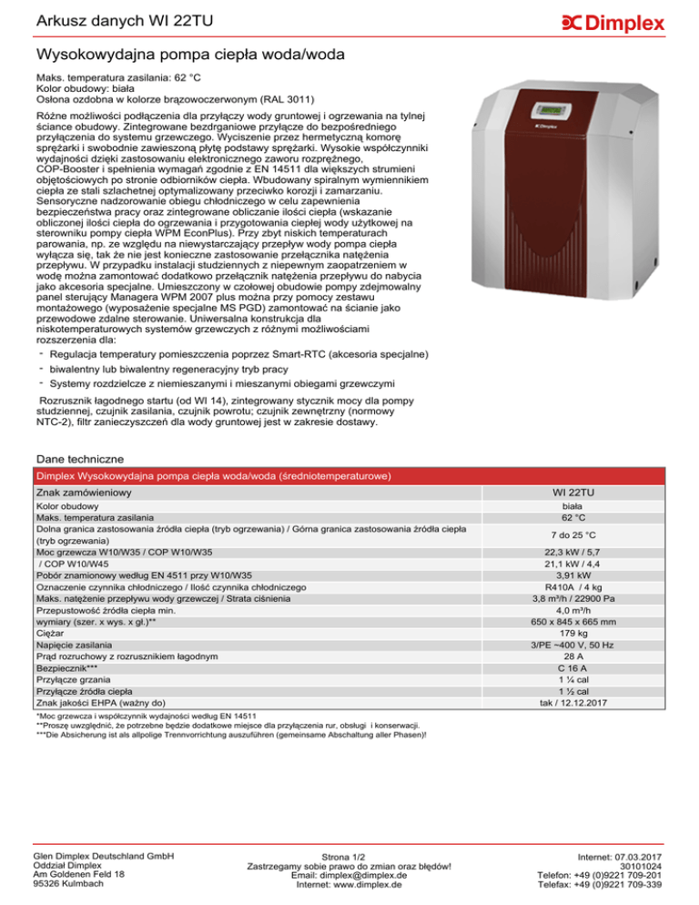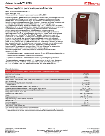 Arkusz danych WI 22TU Wysokowydajna pompa ciepła woda/woda Maks. temperatura zasilania: 62 °C Kolor obudowy: biała Osłona ozdobna w kolorze brązowoczerwonym (RAL 3011) Różne możliwości podłączenia dla przyłączy wody gruntowej i ogrzewania na tylnej ściance obudowy. Zintegrowane bezdrganiowe przyłącze do bezpośredniego przyłączenia do systemu grzewczego. Wyciszenie przez hermetyczną komorę sprężarki i swobodnie zawieszoną płytę podstawy sprężarki. Wysokie współczynniki wydajności dzięki zastosowaniu elektronicznego zaworu rozprężnego, COP-Booster i spełnienia wymagań zgodnie z EN 14511 dla większych strumieni objętościowych po stronie odbiorników ciepła. Wbudowany spiralnym wymiennikiem ciepła ze stali szlachetnej optymalizowany przeciwko korozji i zamarzaniu. Sensoryczne nadzorowanie obiegu chłodniczego w celu zapewnienia bezpieczeństwa pracy oraz zintegrowane obliczanie ilości ciepła (wskazanie obliczonej ilości ciepła do ogrzewania i przygotowania ciepłej wody użytkowej na sterowniku pompy ciepła WPM EconPlus). Przy zbyt niskich temperaturach parowania, np. ze względu na niewystarczający przepływ wody pompa ciepła wyłącza się, tak że nie jest konieczne zastosowanie przełącznika natężenia przepływu. W przypadku instalacji studziennych z niepewnym zaopatrzeniem w wodę można zamontować dodatkowo przełącznik natężenia przepływu do nabycia jako akcesoria specjalne. Umieszczony w czołowej obudowie pompy zdejmowalny panel sterujący Managera WPM 2007 plus można przy pomocy zestawu montażowego (wyposażenie specjalne MS PGD) zamontować na ścianie jako przewodowe zdalne sterowanie. Uniwersalna konstrukcja dla niskotemperaturowych systemów grzewczych z różnymi możliwościami rozszerzenia dla: - Regulacja temperatury pomieszczenia poprzez Smart-RTC (akcesoria specjalne) - biwalentny lub biwalentny regeneracyjny tryb pracy - Systemy rozdzielcze z niemieszanymi i mieszanymi obiegami grzewczymi Rozrusznik łagodnego startu (od WI 14), zintegrowany stycznik mocy dla pompy studziennej, czujnik zasilania, czujnik powrotu; czujnik zewnętrzny (normowy NTC-2), filtr zanieczyszczeń dla wody gruntowej jest w zakresie dostawy. Dane techniczne Dimplex Wysokowydajna pompa ciepła woda/woda (średniotemperaturowe) Znak zamówieniowy WI 22TU Kolor obudowy Maks. temperatura zasilania Dolna granica zastosowania źródła ciepła (tryb ogrzewania) / Górna granica zastosowania źródła ciepła (tryb ogrzewania) Moc grzewcza W10/W35 / COP W10/W35 / COP W10/W45 Pobór znamionowy według EN 4511 przy W10/W35 Oznaczenie czynnika chłodniczego / Ilość czynnika chłodniczego Maks. natężenie przepływu wody grzewczej / Strata ciśnienia Przepustowość źródła ciepła min. wymiary (szer. x wys. x gł.)** Ciężar Napięcie zasilania Prąd rozruchowy z rozrusznikiem łagodnym Bezpiecznik*** Przyłącze grzania Przyłącze źródła ciepła Znak jakości EHPA (ważny do) biała 62 °C 7 do 25 °C 22,3 kW / 5,7 21,1 kW / 4,4 3,91 kW R410A / 4 kg 3,8 m³/h / 22900 Pa 4,0 m³/h 650 x 845 x 665 mm 179 kg 3/PE ~400 V, 50 Hz 28 A C 16 A 1 ¼ cal 1 ½ cal tak / 12.12.2017 *Moc grzewcza i współczynnik wydajności według EN 14511 **Proszę uwzględnić, że potrzebne będzie dodatkowe miejsce dla przyłączenia rur, obsługi i konserwacji. ***Die Absicherung ist als allpolige Trennvorrichtung auszuführen (gemeinsame Abschaltung aller Phasen)! Glen Dimplex Deutschland GmbH Oddział Dimplex Am Goldenen Feld 18 95326 Kulmbach Strona 1/2 Zastrzegamy sobie prawo do zmian oraz błędów! Email: [email protected] Internet: www.dimplex.de Internet: 07.03.2017 30101024 Telefon: +49 (0)9221 709-201 Telefax: +49 (0)9221 709-339 Wyposażenie urządzenia WI 22TU Opis Numer Ilości artykułu przykładowe WI 22TU SYL 250 VSF 32 364220 352260 361800 1 PSW 200 PSW 500 DDV 32 WWM 32 MMH 32 MMB 32 VSE 32-50 VSE 32-100 VSE 32-150 VSE 32-200 VSE 32-300 HDLR 450 HCT 300 339830 339210 348450 367800 367790 367780 362520 362530 362540 362550 362560 337450 351210 WWSP 332 WWSP 442 WWSP 556 FLH 25M FLH 60 FLHU 70 SVK 852 SA 1 WWSP 540 SOL 346610 372840 370080 349430 338060 338070 326660 324990 PWD 750 349100 PWD 900 362860 WPG 32 356040 NWPM EWPM LWPM 410 AP PGD FG 3115 NTC-10M KRRV 003 356960 356970 339410 356570 336620 363600 322070 WTE 20 358400 WPM Econ PK 360000 RKS WPM 342220 TPW WPM RTK 601U RTK 602U 350970 355610 355620 SST 25 348430 Typ-nr Sztuk Cena Pompa ciepła Wysokowydajna pompa ciepła woda/woda Elastyczne taśmy izolacyjne do podłożenia Zestaw połączeniowy dla pompy ciepła powietrze/woda Akcesoria hydrauliczne Podstawa zbiornika buforowego 200 l* Uniwersalny zbiornik buforowy 500 l* Podwójny rozdzielacz bezciśnieniowy Moduł ciepłej wody / moduł niemieszanego obiegu grzewczego Moduł mieszanego obiegu grzewczego Moduł mieszalnika do systemów biwalentnych Wstępnie obrobiona rura falista ze stali nierdzewnej DN 32 Wstępnie obrobiona rura falista ze stali nierdzewnej DN 32 Wstępnie obrobiona rura falista ze stali nierdzewnej DN 32 Wstępnie obrobiona rura falista ze stali nierdzewnej DN 32 Wstępnie obrobiona rura falista ze stali nierdzewnej DN 32 Podzespoły rur do grzałek* Ogrzewanie rurowe 3 kW Wyposażenie dodatkowe przygotowania ciepłej wody Zasobnik ciepłej wody 300 l z czujnikiem temperatury* Zasobnik ciepłej wody 400 l z czujnikiem temperatury* Zasobnik ciepłej wody 500 l z czujnikiem temperatury Ogrzewanie kołnierzowe FLH 25M Ogrzewanie kołnierzowe do ciepłej wody Ogrzewanie kołnierzowe do ciepłej wody Układ zaworów zabezpieczających Armatura solaru SA 1 Zbiornik solarny 500 l do pompy ciepła* Zbiornik kombinacyjny dla ogrzewania i centralnego podgrzewania przepływowego wody pitnej* Zbiornik kombinacyjny dla ogrzewania i centralnego podgrzewania przepływowego wody pitnej* Seria pomp DN 32 do bezpośredniego podłączenia zbiornika ciepłej wody 1 1 361090 Wyposażenie dodatkowe techniki regulacji Rozszerzenie dla p