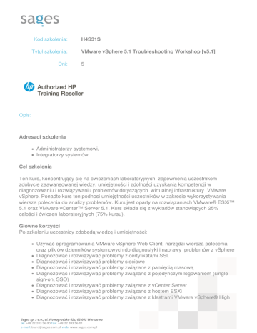 Kod szkolenia: Tytuł szkolenia: Dni: H4S31S VMware vSphere 5.1 Troubleshooting Workshop [v5.1] 5 Opis: Adresaci szkolenia Administratorzy systemowi, Integratorzy systemów Cel szkolenia Ten kurs, koncentrujący się na ćwiczeniach laboratoryjnych, zapewnienia uczestnikom zdobycie zaawansowanej wiedzy, umiejętności i zdolności uzyskania kompetencji w diagnozowaniu i rozwiązywaniu problemów dotyczących wirtualnej infrastruktury VMware vSphere. Ponadto kurs ten podnosi umiejętności uczestników w zakresie wykorzystywania wiersza polecenia do analizy problemów. Kurs jest oparty na rozwiązaniach VMware® ESXi™ 5.1 oraz VMware vCenter™ Server 5.1. Kurs składa się z wykładów stanowiących 25% całości i ćwiczeń laboratoryjnych (75% kursu). Główne korzyści Po szkoleniu uczestnicy zdobędą wiedzę i umiejętności: Używać oprogramowania VMware vSphere Web Client, narzędzi wiersza polecenia oraz plik ów dzienników systemowych do diagnostyki i naprawy problemów z vSphere Diagnozować i rozwiązywać problemy z certyfikatami SSL Diagnozować i rozwiązywać problemy sieciowe Diagnozować i rozwiązywać problemy związane z pamięcią masową Diagnozować i rozwiązywać problemy związane z pojedynczym logowaniem (single sign-on, SSO) Diagnozować i rozwiązywać problemy związane z vCenter Server Diagnozować i rozwiązywać problemy związane z hostem ESXi Diagnozować i rozwiązywać problemy związane z klastrami VMware vSphere® High Availability Diagnozować i rozwiązywać problemy związane z VMware vSphere® vMotion® Diagnozować i rozwiązywać problemy związane z maszynami wirtualnymi Wymagania Posiadanie certyfikacji VMware® Certified Professional 5 – Datacenter Virtualization (VCP5-DV) Ukończenie kursu VMware vSphere: Fast Track [V5.1] (H1L95S) Ukończenie kursu VMware vSphere: Optimize and Scale [V5.1](H1L94S) Posiadanie równoważnej wiedzy i doświadczenia w pracy z rozwiązaniami VMware ESXi™ oraz vCenter Server Parametry szkolenia 5*8 godzin (5*7 godzin netto) wykładów i warsztatów. Wielkość grupy: maks. 8-10 osób. Program szkolenia: Moduł 1. Wprowadzenie do kursu Wprowadzenie i logistyka kursu Cele kursu Moduł 2. Wprowadzenie do diagnozowania i rozwiązywania problemów Podejście strukturalne do diagnozowania i rozwiązywania problemów Moduł 3. Narzędzia do diagnozowania i rozwiązywania problemów Dodanie VMware vSphere® Management Assistant do środowiska Active Directory Używanie poleceń do odnotowania informacji dotyczących konfiguracji vSphere Położenie ważnych plików dzienników systemowych Zbieranie zestawów (bundle) plików dzienników systemowych dla potrzeb wsparcia technicznego Moduł 4. Certyfikaty SSL Implementacja certyfikatów SSL dla oprogramowania vCenter Server Implementacja certyfikatów SSL dla oprogramowania ESXi Moduł 5. Zagadnienia sieciowe Diagnozowanie i rozwiązywanie problemów ze standardowych switchami wirtualnymi Diagnozowanie i rozwiązywanie problemów z połączeniami sieciowymi maszyn wirtualnych Diagnozowanie i rozwiązywanie problemów z połączeniami sieci zarządzającej Diagnozowanie i rozwiązywanie problemów z rozproszonymi switchami wirtualnymi Moduł 6. Pamięci masowe Diagnozowanie i rozwiązywanie problemów z połączeniami LUN Diagnozowanie i rozwiązywanie problemów wielościeżkowych (multipathing) Moduł 7. Zarządzanie klastrami Diagnozowanie i rozwiązywanie problemów z vSphere High Availability Diagnozowanie i rozwiązywanie problemów z vSphere vMotion Moduł 8. vCenter Server oraz ESXi Diagnozowanie i rozwiązywanie problemów z usługami vCenter Server Diagnozowanie i rozwiązywanie problemów z hostem ESXi Moduł 9. Maszyny wirtualne Diagnozowanie i rozwiązywanie problemów dotyczących stanu maszyn wirtualnych Diagnozowanie i rozwiązywanie problemów z instalacją VMware ® Tools™ Diagnozowanie i rozwiązywanie problemów z migawkami (snapshot) VMware Diagnozowanie i rozwiązywanie problemów z włączaniem maszyn wirtualnych Powered by TCPDF (www.tcpdf.org)