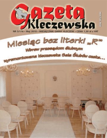 NR 5/176 • Maj 2010 • MIESIĘCZNIK GMINY KLECZEW • CENA 1,30 zł z VAT Majowe patriotyczne refleksje Narodowe Święto Trzeciego Maja ma swoją niekwestionowaną rangę i godność. Jest zaszczytną pamiątką uchwalonej w 1791 r. pierwszej konstytucji w nowożytnej Europie a drugiej po konstytucji amerykańskiej na świecie. Wyprzedziła trzecią co do rozmiarów twórczego czynu patriotycznego narodów – konstytucję francuską. Polski naród po dłuższym okresie lekkomyślności, po paru pokoleniach szaleństw zdobył się na mądrość i stworzył c.d. na str. 7 Chopin w Kleczewie D nia 10 maja 2010 roku w kinie „Zachęta” w Kleczewie odbyło się uroczyste wręczenie nagród w Konkursie Plastycznym „Chopin – inspirator wyobraźni”. 2 Konkurs został ogłoszony w lutym, rozstrzygnięcie i wręczenie nagród odbyło się właśnie 10 maja. W tym roku obchodzimy dwusetny Jubileusz urodzin Fryderyka Chopina i stąd pomysł zorga- nizowania przez Miejsko-Gminne Centrum Kultury tegoż konkursu i koncertu Chopinowskiego. Szanowna Komisja: p. Małgorzta Dobrzycka, p. Alina Wińcza i p. Mariola Makowska po obejrzeniu 32 prac plastycznych przyznała następujące nagrody i wyróżnienia c.d. na str. 7 XXXVIII Sesja Rady Miejskiej KWIECIEŃ – 27 kwietnia 2010 roku 2010 Relacjonowanie budżetu ubiegłorocznego przez Burmistrza O brady XXXVIII sesji Rady Miejskiej w Kleczewie otworzył Przewodniczący Rady, p. Maciej Trzewiczyński, witając radnych oraz zaproszonych gości. Rada Miejska i zgromadzeni uczcili minutą ciszy pamięć tych wszystkich, którzy zginęli w katastrofie lotniczej 10 kwietnia pod Smoleńskiem oraz tych, którzy zginęli w Katyniu 70 lat wcześniej. Interpelacje i wnioski radnych: radny B. Bojko wnioskował o oczyszczenie lamp oświetleniowych przez ZGKiM oraz o uzupełnienie nasadzeń drzew w mieście Kleczewie, a radny J. Sucholas prosił o podanie przyczyny częstych wyłączeń wody w Nieborzynie. Zapytań do radnych powiatowych nie zgłoszono. Sprawozdanie z rocznego wykonania budżetu przedstawił burmistrz Marek Wesołowski. W uzasadnieniu poinformował m.in. że uchwalony na rok 2009 plan Nowy skarbnik, p. Jarosław Bąk dochodów budżetowych w wysokości 45 268 078 zł wzrósł o sumę 5 615 824 zł tj. o 14,16 %, natomiast plan wydatków budżetowych wzrósł również o 7,31 % tj. o 3 288 182 zł w stosunku do pierwotnie zaplanowanych 48 285 151 zł. Określony przez Radę na etapie planowania deficyt budżetowy w wysokości 5 344 715 zł w wyniku zmian struktury budżetu i zmian dochodów i wydatków w ciągu roku uległ zmianie, by wynieść 3 017 073 zł. Ponadplanowe dochody w wys. 237 410, 31 zł i oszczędności w poniesionych wydatkach w stosunku do planu wyniosły 8 558 076,25 zł, dając nadwyżkę budżetową w wys. 5 778 413,56 zł. Uwaga. Informacja z realizacji budżetu za rok 2009 dostępna jest na stronach www.bip.kleczew.pl w dziale: Prawo lokalne. Jedną z najważniejszych uchwał była uchwała o udzieleniu absolutorium Burmistrzowi Gminy i Miasta Kleczew. Po rozpatrzeniu przez Radę Miejską sprawozdania Burmistrza o wykonaniu budżetu za rok 2009 i wniosku o udzielenie absolutorium, odczytane przez Przewodniczącego Komisji Rewizyjnej p. P. Szczekockiego oraz po zapoznaniu się z pozytywną opinią Regionalnej Izby Obrachunkowej o złożonym sprawozdaniu, jednogłośnie udzielono Burmistrzowi absolutorium. Burmistrz M. Wesołowski podziękował Radzie za zaufanie i współpracę, podziękował również tym wszystkim, którzy przyczynili się do prawidłowej realizacji budżetu. W dalszej części sesji radni podjęli następujące uchwały: uchwała w sprawie nadania odznaki „Zasłużony dla Gminy c.d. na str. 4 NA ŚWIECIE: W Indiach rozpoczął się spis powszechny, na podstawie którego wydane zostaną mieszkańcom dowody osobiste • W Republice Południowej Afryki zamordowany został przez swoich czarnych pracowników 70-letni Eugene Terreblanche, przywódca radykalnych zwolenników przywrócenia w tym kraju apartheidu • Na cmentarzu w Katyniu, z udziałem premierów Rosji i Polski – Władimira Putina i Donalda Tuska, odbyły się uroczystości związane z 70. rocznicą rozstrzelania przez NKWD ponad 20 tysięcy polskich jeńców; prezydent Rosji Dmitrij Miedwiediew nakazał Państwowym Archiwom Rosji opublikowanie na w internecie dokumentów w sprawie zbrodni katyńskiej świadczących o tym, że dokonali jej funkcjonariusze NKWD na rozkaz Józefa Stalina • Prezydenci USA i Rosji – Barack Obama i Dmitrij Miedwiediew, podpisali porozumienie START o redukcji arsenałów nuklearnych • W Kirgizji doszło do rozruchów, w wyniku których obalono prezydenta Kurmanbeka Bakijewa • Przed lotniskiem „Siewiernyj” w Smoleńsku rozbił się prezydencki samolot Tu-154 M Lux; w wyniku katastrofy zginęli wszyscy, którzy lecieli do Katynia na uroczystości związane z 70. rocznicą zbrodni katyńskiej: Prezydent RP Lech Kaczyński, Jego Małżonka Maria oraz 94 pozostałe osoby • W Waszyngtonie miał miejsce światowy szczyt poświęcony sprawie bezpieczeństwa nuklearnego • Ponad ośmiuset Chińczyków zginęło w wyniku trzęsienia ziemi w prowincji Qinghai • Wybuch wulkanu Eyjafjoell na Islandii spowodował paraliż ruchu lotniczego w znacznej części Europy • Papież Benedykt XVI przebywał z pielgrzymką na Malcie, gdzie między innymi spotkał się z ofiarami pedofilii duchownych • Ukraina w zamian za tańszy gaz podpisała z Rosją umowę o przedłużeniu o 25 lat dzierżawy bazy wojskowej na Krymie • Fidesz, partia byłego premiera Viktora Orbána, zdecydowanie wygrała wybory parlamentarne na Węgrzech • Kryzys w Grecji spowodował serię obniżek wiarygodności kredytowych krajów strefy euro • Przewodniczący Parlamentu Europejskiego Jerzy Buzek i polski minister spraw zagranicznych Radosław Sikorski namawiali w Waszyngtonie amerykańskich przywódców do zniesienia wiz dla Polakó