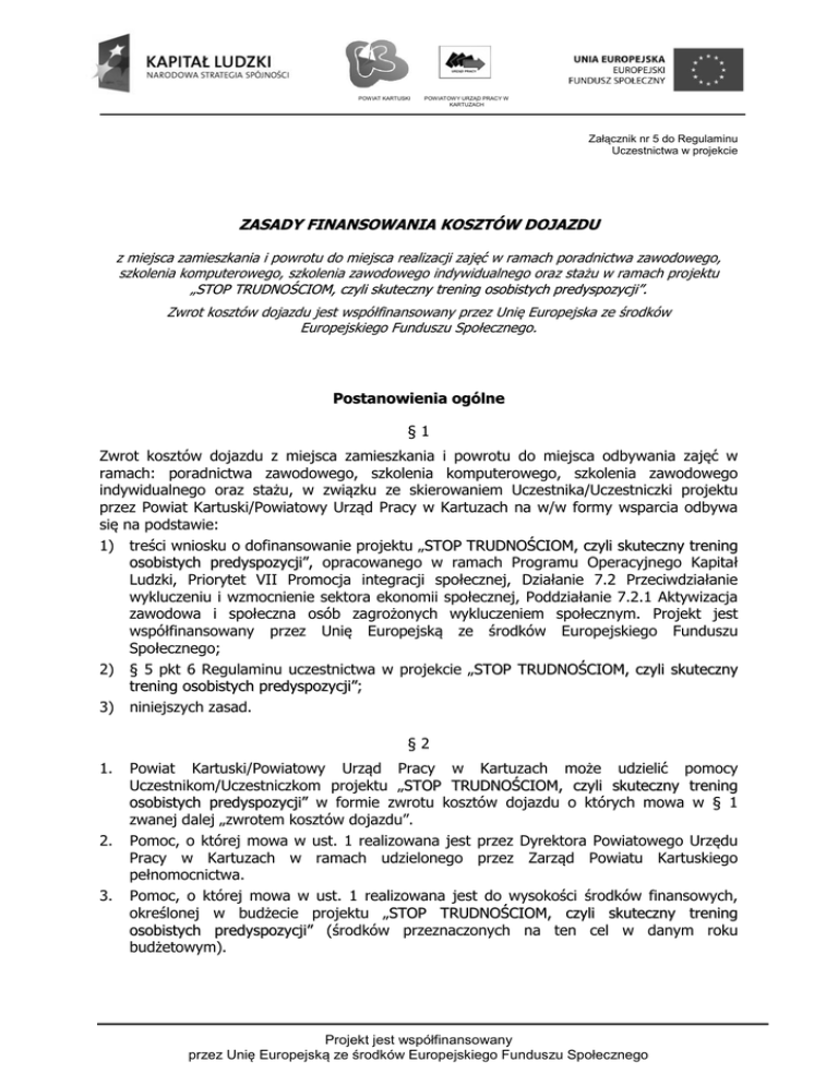 POWIAT KARTUSKI POWIATOWY URZĄD PRACY W KARTUZACH Załącznik nr 5 do Regulaminu Uczestnictwa w projekcie ZASADY FINANSOWANIA KOSZTÓW DOJAZDU z miejsca zamieszkania i powrotu do miejsca realizacji zajęć w ramach poradnictwa zawodowego, szkolenia komputerowego, szkolenia zawodowego indywidualnego oraz stażu w ramach projektu „S STOP TRUDNOŚCIOM, czyli skuteczny trening osobistych predyspozycji”. Zwrot kosztów dojazdu jest współfinansowany przez Unię Europejska ze środków Europejskiego Funduszu Społecznego. Postanowienia ogólne §1 Zwrot kosztów dojazdu z miejsca zamieszkania i powrotu do miejsca odbywania zajęć w ramach: poradnictwa zawodowego, szkolenia komputerowego, szkolenia zawodowego indywidualnego oraz stażu, w związku ze skierowaniem Uczestnika/Uczestniczki projektu przez Powiat Kartuski/Powiatowy Urząd Pracy w Kartuzach na w/w formy wsparcia odbywa się na podstawie: 1) treści wniosku o dofinansowanie projektu „S STOP TRUDNOŚCIOM, czyli skuteczny trening osobistych predyspozycji”, opracowanego w ramach Programu Operacyjnego Kapitał Ludzki, Priorytet VII Promocja integracji społecznej, Działanie 7.2 Przeciwdziałanie wykluczeniu i wzmocnienie sektora ekonomii społecznej, Poddziałanie 7.2.1 Aktywizacja zawodowa i społeczna osób zagrożonych wykluczeniem społecznym. Projekt jest współfinansowany przez Unię Europejską ze środków Europejskiego Funduszu Społecznego; 2) § 5 pkt 6 Regulaminu uczestnictwa w projekcie „S STOP TRUDNOŚCIOM, czyli skuteczny trening osobistych predyspozycji”; 3) niniejszych zasad. §2 1. 2. 3. Powiat Kartuski/Powiatowy Urząd Pracy w Kartuzach może udzielić pomocy Uczestnikom/Uczestniczkom projektu „S STOP TRUDNOŚCIOM, czyli skuteczny trening osobistych predyspozycji” w formie zwrotu kosztów dojazdu o których mowa w § 1 zwanej dalej „zwrotem kosztów dojazdu”. Pomoc, o której mowa w ust. 1 realizowana jest przez Dyrektora Powiatowego Urzędu Pracy w Kartuzach w ramach udzielonego przez Zarząd Powiatu Kartuskiego pełnomocnictwa. Pomoc, o której mowa w ust. 1 realizowana jest do wysokości środków finansowych, określonej w budżecie projektu „S STOP TRUDNOŚCIOM, czyli skuteczny trening osobistych predyspozycji” (środków przeznaczonych na ten cel w danym roku budżetowym). Projekt jest współfinansowany przez Unię Europejską ze środków Europejskiego Funduszu Społecznego POWIAT KARTUSKI POWIATOWY URZĄD PRACY W KARTUZACH §3 1. Powiat Kartuski/Powiatowy Urząd Pracy w Kartuzach, z zastrzeżeniem § 2 ust. 3, może dokonywać zwrotu kosztów dojazdu z miejsca zamieszkania i powrotu do miejsca: a) odbywania zajęć w ramach poradnictwa zawodowego, b) odbywania zajęć w ramach szkolenia komputerowego, c) odbywania zajęć w ramach szkolenia zawodowego indywidualnego, d) odbywania u pracodawcy stażu. 2. Powiat Kartuski/Powiatowy Urząd Pracy w Kartuzach może dokonywać zwrotu kosztów dojazdu w celu wskazanym w ust. 1 za dni faktycznego uczestnictwa (z zastrzeżeniem zapisów § 8 niniejszych zasad) osobie, która na podstawie skierowania Powiatu Kartuskiego/Powiatowego Urzędu Pracy w Kartuzach odbywa zajęcia w ramach poradnictwa zawodowego, szkolenia komputerowego, szkolenia zawodowego indywidualnego, podjęła staż i dojeżdża do tych miejsc. Dojazd jest kosztem kwalifikowanym jeżeli forma wsparcia jest w miejscowości innej niż miejsce zamieszkania Uczestnika/Uczestniczki. 3. Powiat Kartuski/Powiatowy Urząd Pracy w Kartuzach, z zastrzeżeniem § 2 ust. 3, może dokonywać zwrotu kosztów dojazdu o którym mowa w ust. 1 przez okres trwania projektu „S STOP TRUDNOŚCIOM, czyli skuteczny trening osobistych predyspozycji”, nie dłużej jednak niż przez faktyczny okres zajęć w ramach poradnictwa zawodowego, szkolenia komputerowego, szkolenia zawodowego indywidualnego oraz stażu. 4. Zwrot kosztów dojazdu możliwy jest tylko za te dni, których obecność na zajęciach została poświadczona podpisem Uczestnika/Uczestniczki Projektu na liście obecności. 5. Zwrotu kosztów dojazdu, o których mowa w ust. 1 dokonuje się za okres wnioskowany przez Uczestnika/Uczestniczkę projektu, nie dłuższy jednak niż 2 miesięczny. 6. Zwrot będzie przysługiwać do momentu wyczerpania całości dofinansowania, o którym mowa w § 2 ust. 3. §4 1. Powiat Kartuski/Powiatowy Urząd Pracy w Kartuzach może dokonać zwrotu kosztów dojazdu środkiem transportu zbiorowego (bilety komunikacji autobusowej, kolejowej - II klasa, komunikacji miejskiej) lub własnym/użyczonym środkiem transportu. 2. Uczestnikom/Uczestniczkom przysługuje zwrot kosztów dojazdu do miejsca odbywania zajęć w ramach poradnictwa zawodowego, szkolenia komputerowego, szkolenia zawodowego indywidualnego oraz stażu i powrotu, w wysokości nie większej niż koszt przejazdu najtańszym publicznym środkiem transportu na danej trasie. 3. Powiat Kartuski/ Powiatowy Urząd Pracy w Kartuzach może dokonać zwrotu faktycznie poniesionych i udokumentowanych kosztów dojazdu. Dokumentami poniesienia kosztu dojazdu są: a. bilet jednorazowy, b. bilet okresowy, c. oświadczenie wnioskodawcy dot. dojeżdżania własnym/użyczonym środkiem transportu, 4. W przypadku zakupu biletu okresowego (długoterminowego np. tygodniowego, miesięcznego) wskazane jest aby termin ważności biletu odpowiadał terminowi trwania udzielonej pomocy (formy aktywizacji wymienionej w § 3 ust. 1). Projekt jest współfinansowany przez Unię Europejską ze środków Europejskiego Funduszu Społecznego POWIAT KARTUSKI POWIATOWY URZĄD PRACY W KARTUZACH a. W przypadku, gdy termin wskazany na bilecie okresowym nie odpowiada terminowi uczestnictwa w formach aktywizacji wymienionych w § 3 ust. 1 zwrot dokonywany jest tylko za faktyczny okres uczestnictwa w wybranej formie aktywizacji. b. W przypadku gdy bilet okresowy został zakupiony po terminie początku jego ważności (np. bilet na okres od 01.01.2012 r. do 31.01.2012 r. zakupiony dnia 05.01