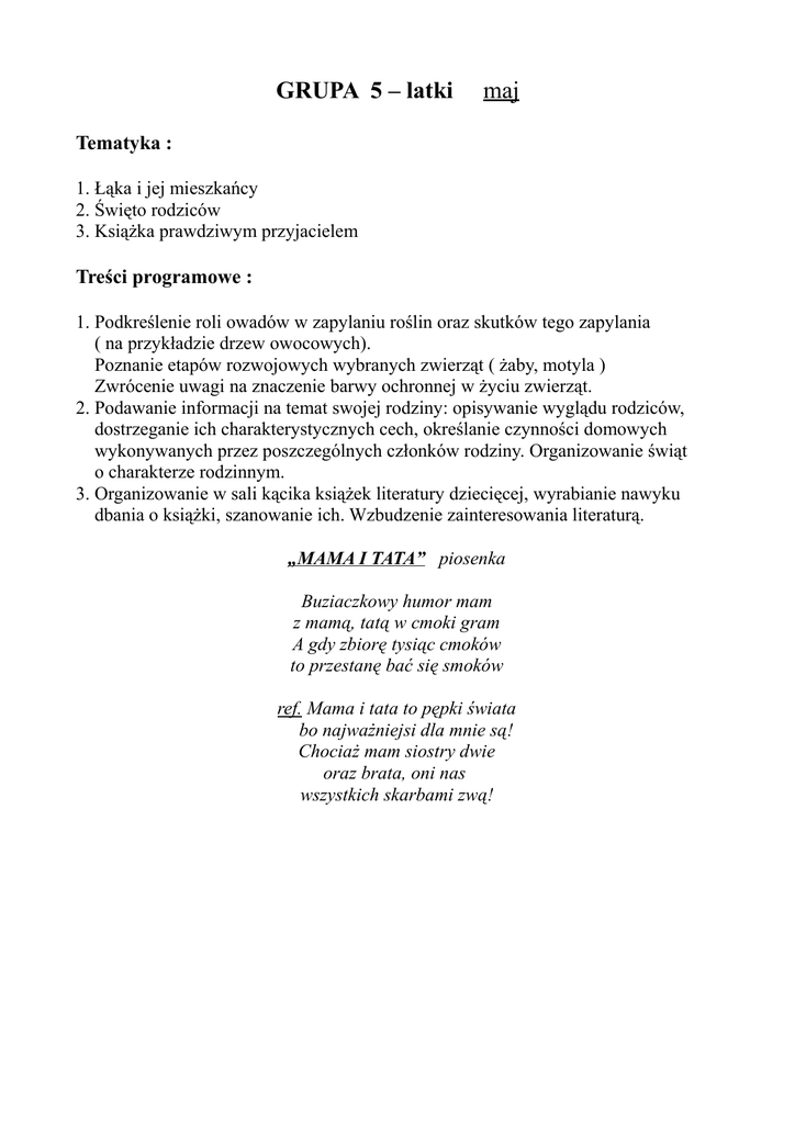 GRUPA 5 – latki maj Tematyka : 1. Łąka i jej mieszkańcy 2. Święto rodziców 3. Książka prawdziwym przyjacielem Treści programowe : 1. Podkreślenie roli owadów w zapylaniu roślin oraz skutków tego zapylania ( na przykładzie drzew owocowych). Poznanie etapów rozwojowych wybranych zwierząt ( żaby, motyla ) Zwrócenie uwagi na znaczenie barwy ochronnej w życiu zwierząt. 2. Podawanie informacji na temat swojej rodziny: opisywanie wyglądu rodziców, dostrzeganie ich charakterystycznych cech, określanie czynności domowych wykonywanych przez poszczególnych członków rodziny. Organizowanie świąt o charakterze rodzinnym. 3. Organizowanie w sali kącika książek literatury dziecięcej, wyrabianie nawyku dbania o książki, szanowanie ich. Wzbudzenie zainteresowania literaturą. „MAMA I TATA” piosenka Buziaczkowy humor mam z mamą, tatą w cmoki gram A gdy zbiorę tysiąc cmoków to przestanę bać się smoków ref. Mama i tata to pępki świata bo najważniejsi dla mnie są! Chociaż mam siostry dwie oraz brata, oni nas wszystkich skarbami zwą!