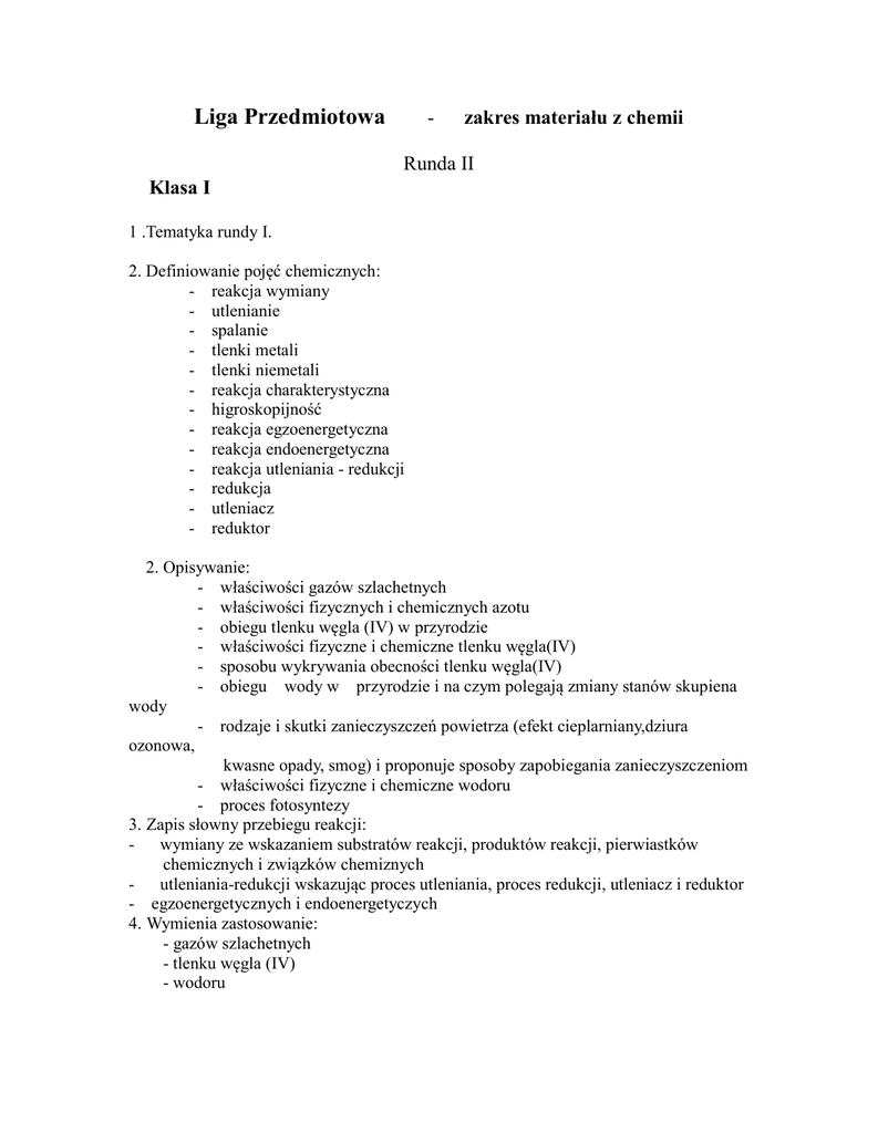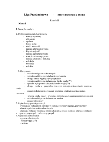 Liga Przedmiotowa - zakres materiału z chemii Runda II Klasa I 1 .Tematyka rundy I. 2. Definiowanie pojęć chemicznych: - reakcja wymiany - utlenianie - spalanie - tlenki metali - tlenki niemetali - reakcja charakterystyczna - higroskopijność - reakcja egzoenergetyczna - reakcja endoenergetyczna - reakcja utleniania - redukcji - redukcja - utleniacz - reduktor 2. Opisywanie: - właściwości gazów szlachetnych - właściwości fizycznych i chemicznych azotu - obiegu tlenku węgla (IV) w przyrodzie - właściwości fizyczne i chemiczne tlenku węgla(IV) - sposobu wykrywania obecności tlenku węgla(IV) - obiegu wody w przyrodzie i na czym polegają zmiany stanów skupiena wody - rodzaje i skutki zanieczyszczeń powietrza (efekt cieplarniany,dziura ozonowa, kwasne opady, smog) i proponuje sposoby zapobiegania zanieczyszczeniom - właściwości fizyczne i chemiczne wodoru - proces fotosyntezy 3. Zapis słowny przebiegu reakcji: - wymiany ze wskazaniem substratów reakcji, produktów reakcji, pierwiastków chemicznych i związków chemiznych - utleniania-redukcji wskazując proces utleniania, proces redukcji, utleniacz i reduktor - egzoenergetycznych i endoenergetyczych 4. Wymienia zastosowanie: - gazów szlachetnych - tlenku węgla (IV) - wodoru Literatura: Podręcznik dla gimnazjum cz.1 Nowa Era, autorzy:J.Kulawik, T.Kulawik Zeszyt ćwiczeń dla gimnazjum cz.1 Nowa Era D.Babczonek-Wróbel Klasa II 1. Tematyka rundy I 2. Definiowanie pojęć chemicznych: - rozpuszczanie - dipol - budowa polarna - roztwór - substancja rozpuszczona - rozpuszczalnik - roztwór nasycony - krzywa rozpuszczalności - roztwór właściwy - koloid - zawiesina - stężenia procentowe 2. Dokonywanie obliczeń: - ilosci substancji, którą można rozpuścić w określonej ilości wody - stężenia procentowego roztworu opodanej masie i znanej msie substancji rozpuszczonej - stężenia procentowego roztworu o znanej masie substancji rozpuszczonej i rozpuszczalnika - masy substancji rozpuszczonej, którą trzeba dodać, aby otrzymać roztwór o określonym stężeniu procentowym - masy substancji rozpuszczonej w roztworze o określonym stężeniiu i gęstości - stężenia procentowego roztworupo jego rozcieńczeniu 3. Opisuje budowę czastek wody i sposoby racjonalnego gospodarowania wodą. . 4. Wykazuje wpływ różnych czynników na szubkość rozpuszcznia się substancji stałych w wodzie. 5. Analizuje wykresy rozpuszczalności ciał stałych i gazów. Literatura: Podręcznik dla gimnazjum cz.1 Nowa Era autorzy:J.Kulawik,T.Kulawik Zeszyt ćwiczeń dla gimnazjum cz.1 Nowa Era D.Banczonek-Wróbel Klasa III 1. Tematyka rundy I. 2. Definiowanie pojęć chemicznych: - alkohole (alkanole) - grupa funkcyjna - grupa hydroksylowa - fermentacja alkoholowa - alkohole monohydroksylowe i polihydroksylowe - kwasy karboksylowe - grupa karboksylowa 1. Zapisywanie wzorów sumarycznych, strukturalnych i półstrukturalnych na podstawie nazwy, liczby atomów węgla, liczby atomów wodoru i masy cząsteckowej: - alkoholi - kwasów karboksylowych 2. Tworzenie nazw alkoholi i kwasów karboksylowych na podstawie wzoru sumarycnego strukturalnego i półstrukturalnego. 3. Zapisywanie równań reakcji: a) spalania całkowitego i niecałkowitego alkoholi monohydroksylowych i polihydroksylowych b) otrzymywania etanolu c) otrzymywania kwasu etanowego w procesie fermentacji octowej d) spalania, dysocjacji jonowej (elektrolitycznej), reakcję z zasadami, metalami i tlenkami metali kwasów organicznych (karboksylowych) 4. Podaje nazwy zwyczajowe alkoholi i kwasów karboksylowych. 5. Opisuje właściwości , zastosowanie metanolu i etanolu oraz negatywne skutki działania na organizm ludzki. 6. Opisuje własciwości i zastosowanie kwasu metanowego i etanowego. 7. Obliczanie: a) procentu masowego pierwiastków w alkoholach i kwasach karboksylowych b) stosunku masowego pierwiastków w alkoholach i kwasach karboksylowych Literatura: Podręcznik dla gimnazjum cz.3 Nowa Era autorzy: J.Kulawik,T.Kulawik Zeszyt ćwiczeń dla gimnazjum cz.3, D.Babczonek-Wróbel