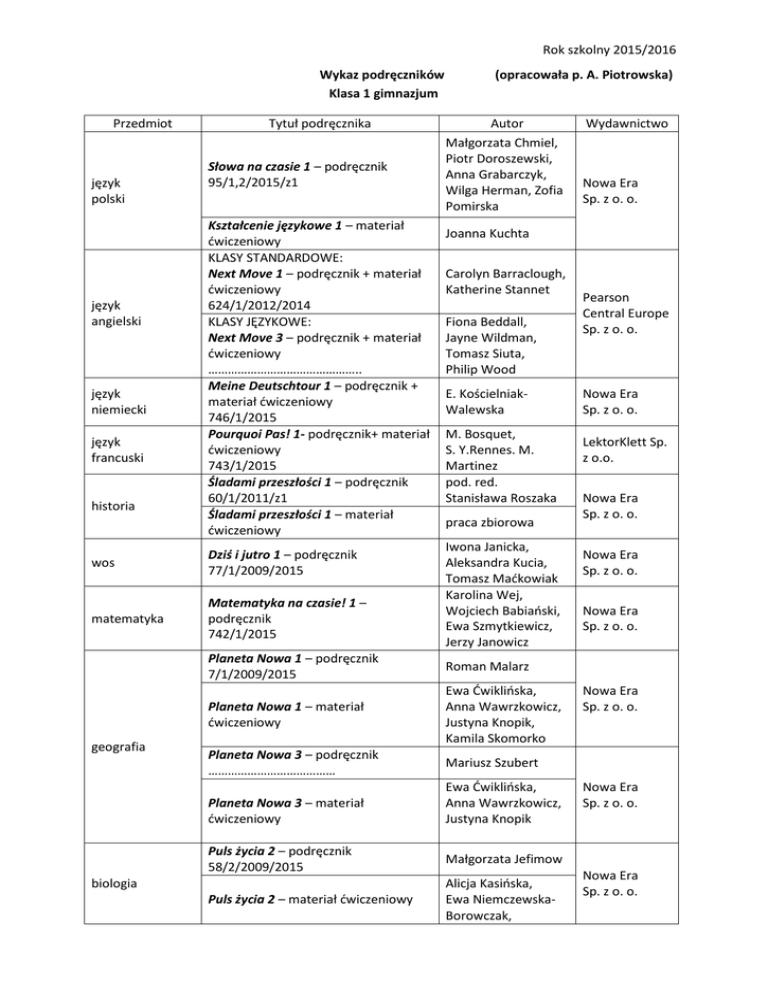 Rok szkolny 2015/2016 Wykaz podręczników Klasa 1 gimnazjum Przedmiot język polski język angielski język niemiecki język francuski historia Tytuł podręcznika Słowa na czasie 1 – podręcznik 95/1,2/2015/z1 Kształcenie językowe 1 – materiał ćwiczeniowy KLASY STANDARDOWE: Next Move 1 – podręcznik + materiał ćwiczeniowy 624/1/2012/2014 KLASY JĘZYKOWE: Next Move 3 – podręcznik + materiał ćwiczeniowy ……………………………………….. Meine Deutschtour 1 – podręcznik + materiał ćwiczeniowy 746/1/2015 Pourquoi Pas! 1- podręcznik+ materiał ćwiczeniowy 743/1/2015 Śladami przeszłości 1 – podręcznik 60/1/2011/z1 Śladami przeszłości 1 – materiał ćwiczeniowy wos Dziś i jutro 1 – podręcznik 77/1/2009/2015 matematyka Matematyka na czasie! 1 – podręcznik 742/1/2015 geografia (opracowała p. A. Piotrowska) Autor Małgorzata Chmiel, Piotr Doroszewski, Anna Grabarczyk, Wilga Herman, Zofia Pomirska Carolyn Barraclough, Katherine Stannet Fiona Beddall, Jayne Wildman, Tomasz Siuta, Philip Wood E. KościelniakWalewska M. Bosquet, S. Y.Rennes. M. Martinez pod. red. Stanisława Roszaka praca zbiorowa Iwona Janicka, Aleksandra Kucia, Tomasz Maćkowiak Karolina Wej, Wojciech Babiański, Ewa Szmytkiewicz, Jerzy Janowicz Roman Malarz Planeta Nowa 1 – materiał ćwiczeniowy Ewa Ćwiklińska, Anna Wawrzkowicz, Justyna Knopik, Kamila Skomorko Planeta Nowa 3 – podręcznik ………………………………… Mariusz Szubert Ewa Ćwiklińska, Anna Wawrzkowicz, Justyna Knopik Puls życia 2 – podręcznik 58/2/2009/2015 Małgorzata Jefimow Puls życia 2 – materiał ćwiczeniowy Alicja Kasińska, Ewa NiemczewskaBorowczak, biologia Nowa Era Sp. z o. o. Joanna Kuchta Planeta Nowa 1 – podręcznik 7/1/2009/2015 Planeta Nowa 3 – materiał ćwiczeniowy Wydawnictwo Pearson Central Europe Sp. z o. o. Nowa Era Sp. z o. o. LektorKlett Sp. z o.o. Nowa Era Sp. z o. o. Nowa Era Sp. z o. o. Nowa Era Sp. z o. o. Nowa Era Sp. z o. o. Nowa Era Sp. z o. o. Nowa Era Sp. z o. o. Rok szkolny 2015/2016 Jacek Pawłowski muzyka / zajęcia artystyczne Gra muzyka – podręcznik do muzyki dla gimnazjum 20/2009/2015 plastyka / zajęcia artystyczne zajęcia techniczne Jan Oleszkowicz Nowa Era Sp. z o. o. Sztuka tworzenia- podręcznik do plastyki dla gimnazjum 725/2014 N. Mrozkowiak Nowa Era Sp. z o. o. brak podręcznika - - Podręcznik do lekcji religii i etyki nie jest objęty ofertą dotacyjną.