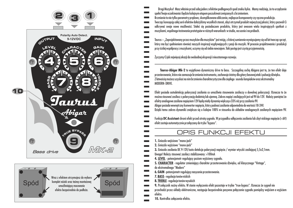 Drogi Muzyku! Masz właśnie przed sobą jeden z efektów podłogowych spod znaku byka. Mamy nadzieję, że to urządzenie spełni Twoje oczekiwania i będzie kolejnym etapem poszukiwań związanych z brzmieniem. Brzmienie to nie tylko parametry prądowe, skomplikowane obliczenia, najlepsze komponenty czy ręczna produkcja. Tworząc koncepcję całej serii efektów dołożyliśmy wszelkich starań, abyś otrzymałprodukt najwyższej jakości, który pozwoli Ci odkrywać swoje nowe możliwości. Stałeś się posiadaczem produktu, który jest owocem wielu inspirujących spotkań z muzykami, wspólnego testowania prototypów w różnych warunkach: w studio, na scenie i na próbach. Polarity Auto Detect. 9-12V/DC 4 Taurus – „Zaprojektowany przez muzyków dla muzyków” jest misją, z której sumiennie wywiązujemy się od lat tworząc sprzęt, który ma być spełnieniem również naszych inspiracji wypływających z pasji do muzyki. W procesie projektowania i produkcji przy ścisłej współpracy z muzykami, uczymy się od siebie nawzajem. Taki postęp jest czystą przyjemnością. 5 4 3 6 3 7 2 1 6 1 1 2 1 2 4 4 8 1 2 3 3 Życzymy Ci jak najwięcej okazji do swobodnej ekspresji i nieustannego rozwoju. 7 2 8 1 5 2 3 3 Taurus-Abigar Mk-2 to wyjątkowo dynamiczny drive to basu. Szczególną cechą Abigara jest to, że ten efekt daje przesterowanie, które nie zamazuje brzmienia instrumentu, zachowuje istotny dla gitary basowej atak i pulsację dźwięku. Z łatwością możesz uzyskaćna nim brzmienie charakterystyczne dla ciepłego soundu lampiaków oraz ekstremalny MODERN- DRIVE. 4 4 Efekt posiada autodetekcję polaryzacji zasilania co umożliwia stosowanie zasilaczy o dowolnej polaryzacji. Oznacza to że można stosować zasilacz z polaryzacją dodatnią lub ujemną. Zakres napięć zasilających jest od 9V do 12V. Należy pamiętać że efekty analogowe zasilane napięciem 12V będą miały dynamię większą o 33% niż przy zasilaniu 9V. Abigar posiada wewnętrzny konwerter napięcia, który podnosi zasilanie odpowiednio do wartości 18-24V. Dzięki temu zakres dynamiki zwiększa się o kolejne 100% w stosunku do układów analogowych zasilanych napięciem 9V. Abigar Bass drive Spód UE R BYPA OPIS FUNKCJI EFEKTU S S T Funkcja DC Assistant chroni efekt przed utratą sygnału. W przypadku odłączenia zasilania lub zbyt niskiego napięcia (<6V) efekt zostaje automatycznie przełączany do trybu "bypass”. MK-2 Wraz z efektem otrzymujesz do wyboru komplet nóżek oraz taśmę montażową umożliwiającą mocowanie efektu bezpośrednio do podłoża. Spód Spód 1. Gniazdo wejściowe “mono-jack” 2. Gniazdo wyjściowe “mono-jack” 3. Gniazdo zasilania DC 9-12V/auto detekcja polaryzacji napięcia / wymiar wtyczki zasilającej 5,5x2,1mm. Uwaga! Należy stosować zasilacz stabilizowany >100mA 4. LEVEL - potencjometr regulujący poziom wyjściowy sygnału. 5. CHARACTER - regulator zmieniający charakter przesterowania dźwięku, od klasycznego “Vintage”, do ekstremalnego “Modern” 6. GAIN - potencjometr regulujący nasycenie przesterowania. 7. BASS - regulacja tonów niskich 8. TREBLE - regulacja tonów wysokich 9. Przełącznik nożny efektu. W stanie wyłączenia efekt pozostaje w trybie “true-bypass”. Oznacza że sygnałnie przechodzi przez układy elektroniczne, następuje bezpośrednie pasywne połączenie sygnału pomiędzy wejściem a wyjściem efektu. 10. Kontrolka załączenia efektu. ODKRYJ CECHY EFEKTU ABIGAR 4 5 4 3 6 7 2 1 1 2 1 2 3 3 2 2 3 4 6 7 2 1 8 1 1 2 1 2 3 3 8 2 3 3 4 6 6 7 2 1 8 1 1 2 1 2 3 3 8 2 3 3 4 4 5 4 3 6 3 7 1 2 6 7 1 1 1 2 3 3 4 5 2 8 1 4 3 1 2 4 4 2 5 3 7 1 2 8 1 2 3 3 4 Przetestuj brzmienie basu stosując MIX soundu Vintage + Modern 4 4 5 2 2 1 2 4 4 3 5 3 7 1 Posłuchaj brzmienia typu VINTAGE używając delikatnego DRIVE 4 4 6 4 8 5 2 1 1 3 4 4 4 7 1 1 4 6 2 8 3 5 3 4 4 Możesz eksperymentować z brzmieniem używając głęboki i agresywny GROOVE INSTRUKCJA OBSŁUGI MK-2 Abigar Bass-drive Używając ekstremalnego MODERN DRIVE nadasz brzmieniu basu zupełnie nowy charakter Box Electronics ul Cieszyńskiego 4 81-881 Sopot Poland tel +48 58 550 66 46 tel/fax +48 58 551 90 05 e-mail [email protected] www.taurus-amp.pl RoHS Utylizacja zużytego sprzętu elektrycznego i elektronicznego Symbol ten umieszczony na produkcie lub jego opakowaniu stanowi, że produkt ten nie może być traktowany jako odpad gospodarstwa domowego. Powinien być przekazany do odpowiedniego punktu zbiórki zużytego sprzętu elektrycznego i elektronicznego. Poprzez zapewnienie odpowiedniego składowania, pomożesz zapobiec negatywnym skutkom grożącym środowisku i ludzkiemu zdrowiu w przypadku niewłaściwego składowania. Recykling pomaga zachować naturalne zasoby. W celu uzyskania dokładniejszych informacji na temat recyklingu, proszę skontaktować się z Twoim lokalnym urzędem miasta, z firmą zajmującą się wywozem odpadów w Twoim mieście lub sklepem gdzie zakupiłeś produkt. Zaprojektowany przez muzyków dla muzyków