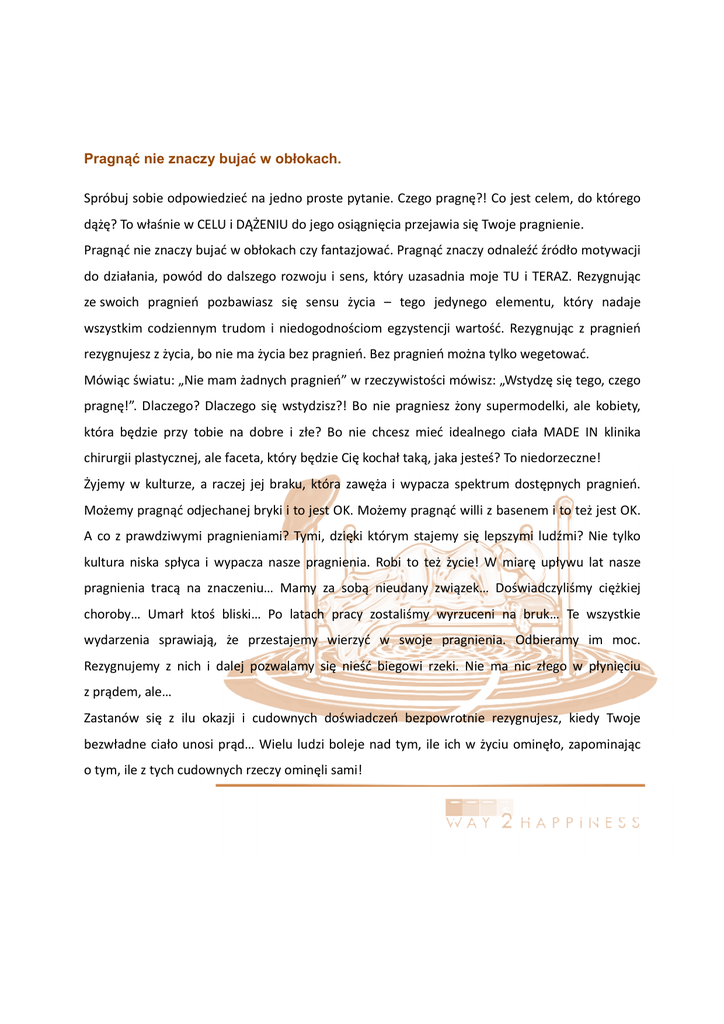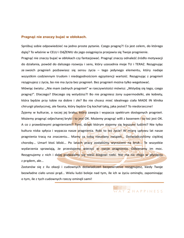 Pragnąć nie znaczy bujać w obłokach. Spróbuj sobie odpowiedzieć na jedno proste pytanie. Czego pragnę?! Co jest celem, do którego dążę? To właśnie w CELU i DĄŻENIU do jego osiągnięcia przejawia się Twoje pragnienie. Pragnąć nie znaczy bujać w obłokach czy fantazjować. Pragnąć znaczy odnaleźć źródło motywacji do działania, powód do dalszego rozwoju i sens, który uzasadnia moje TU i TERAZ. Rezygnując ze swoich pragnień pozbawiasz się sensu życia – tego jedynego elementu, który nadaje wszystkim codziennym trudom i niedogodnościom egzystencji wartość. Rezygnując z pragnień rezygnujesz z życia, bo nie ma życia bez pragnień. Bez pragnień można tylko wegetować. Mówiąc światu: „Nie mam żadnych pragnień” w rzeczywistości mówisz: „Wstydzę się tego, czego pragnę!”. Dlaczego? Dlaczego się wstydzisz?! Bo nie pragniesz żony supermodelki, ale kobiety, która będzie przy tobie na dobre i złe? Bo nie chcesz mieć idealnego ciała MADE IN klinika chirurgii plastycznej, ale faceta, który będzie Cię kochał taką, jaka jesteś? To niedorzeczne! Żyjemy w kulturze, a raczej jej braku, która zawęża i wypacza spektrum dostępnych pragnień. Możemy pragnąć odjechanej bryki i to jest OK. Możemy pragnąć willi z basenem i to też jest OK. A co z prawdziwymi pragnieniami? Tymi, dzięki którym stajemy się lepszymi ludźmi? Nie tylko kultura niska spłyca i wypacza nasze pragnienia. Robi to też życie! W miarę upływu lat nasze pragnienia tracą na znaczeniu… Mamy za sobą nieudany związek… Doświadczyliśmy ciężkiej choroby… Umarł ktoś bliski… Po latach pracy zostaliśmy wyrzuceni na bruk… Te wszystkie wydarzenia sprawiają, że przestajemy wierzyć w swoje pragnienia. Odbieramy im moc. Rezygnujemy z nich i dalej pozwalamy się nieść biegowi rzeki. Nie ma nic złego w płynięciu z prądem, ale… Zastanów się z ilu okazji i cudownych doświadczeń bezpowrotnie rezygnujesz, kiedy Twoje bezwładne ciało unosi prąd… Wielu ludzi boleje nad tym, ile ich w życiu ominęło, zapominając o tym, ile z tych cudownych rzeczy ominęli sami!