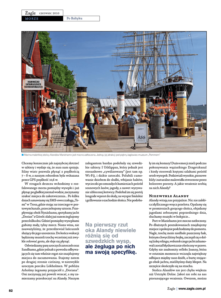 Żagle Morze czerwiec 2010 Po Bałtyku n Marina maleńkiej stolicy Alandów Mariehamn jest mocno zatłoczona. Jedną z jej atrakcji jest piękny żaglowiec-muzeum „Pommern” Chcemy koniecznie jak najszybciej dotrzeć w szkiery i wydaje się, że aura nam sprzyja. Silny wiatr pozwala płynąć z prędkością 7 – 8 w, a naszym rekordem była wskazana przez GPS prędkość 10,6 w. W strugach deszczu wchodzimy z rozfalowanego morza pomiędzy wysepki i już płynąc po gładkiej niemal wodzie, zaczynamy szukać miejsca do zakotwiczenia… Po kilku dniach umawiamy się SMS-owo z załogą „Temi” w Trosa, gdzie stojąc na trzeciego w portowym kanale, przeczekujemy sztorm. Przepływając obok Nynäshamn, spotykamy jacht „Dorian” z Górek i dalej już razem żeglujemy przez kilka dni. Gdzieś pomiędzy wysepkami gubimy mały, tylny miecz. Nasza wina, nie zauważyliśmy, że przerdzewiał łańcuszek służący do jego unoszenia. Do końca wakacji będziemy musieli trochę wcześniej niż zwykle refować grota, ale daje się płynąć. Odwiedzamy parę uroczych zatoczek oraz Sandhamn, gdzie jednak z powodu odbywających się tam właśnie regat nie znajdujemy miejsca do zacumowania. Stajemy zatem po drugiej stronie cieśniny, w niezwykle uroczym porciku Lökholmen. W pobliżu Arholmy żegnamy przyjaciół z „Doriana”. Oni zaczynają już powoli wracać, a my zamierzamy przeskoczyć na Alandy. Naszym 82 załogantom bardzo podobały się szwedzkie szkiery. I Utklippan, który jednak jest stosunkowo „cywilizowany” (jest tam np. Wi-Fi), i dzikie zatoczki. Polubili cumowanie dziobem do skałki, wbijanie haków, wycieczki po omszałych kamieniach pośród sosnowych lasów, jagody, a nawet wyrywanie ubłoconej kotwicy. Podobał im się postój longside wprost do skały, na wyspie Småskär i grillowanie o zachodzie słońca. Nie podoba- Na pierwszy rzut oka Alandy niewiele różnią się od szwedzkich wysp, ale żegluga po nich ma swoją specyfikę. ły im się komary! Dużo emocji mieli podczas pokonywania wąziutkiego Dragetskanal i kiedy sterowali krętymi szlakami pośród setek wysepek. Podziwiali wysokie, pionowe klify i naturalne malowidła stworzone przez kolorowe porosty. A jakie wrażenie zrobią na nich Alandy? Niezwykłe Alandy Alandy witają nas przyjaźnie. Nic nie zakłóca idyllicznego wręcz przelotu. Opalamy się w promieniach gorącego słońca, objadamy jagodami zebranymi poprzedniego dnia, słuchamy muzyki w kokpicie... Port w Mariehamn jest mocno zatłoczony. Po dłuższych poszukiwaniach znajdujemy miejsce i spokojnie podchodzimy do pomostu. Nagle, trochę może niedbale puszczony hak, którym chwyciliśmy bojkę, zaczepił się o dolną linkę relingu, wskutek czego jacht zahamował i został błyskawicznie obrócony w prawo. Gdyby nie znakomity refleks Joanny, która w ostatnim momencie wcisnęła największy odbijacz między nasz dziób, a burtę stojącego obok jachtu, mielibyśmy duży kłopot. Na szczęście skończyło się na strachu. Stolica Alandów nie jest chyba większa niż Ustrzyki Dolne. Jakoś nie robi na nas piorunującego wrażenia. Owszem, można Żagle | www.zagle.com.pl