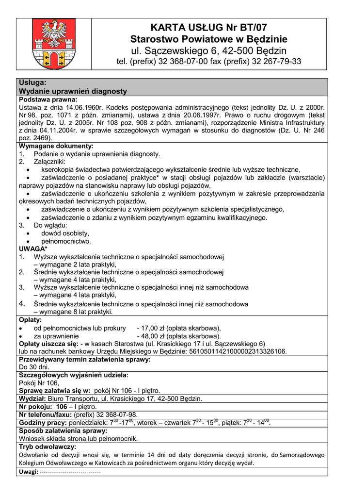 KARTA USŁUG Nr BT/07 Starostwo Powiatowe w Będzinie ul. Sączewskiego 6, 42-500 Będzin tel. (prefix) 32 368-07-00 fax (prefix) 32 267-79-33 Usługa: Wydanie uprawnień diagnosty Podstawa prawna: Ustawa z dnia 14.06.1960r. Kodeks postępowania administracyjnego (tekst jednolity Dz. U. z 2000r. Nr 98, poz. 1071 z późn. zmianami), ustawa z dnia 20.06.1997r. Prawo o ruchu drogowym (tekst jednolity Dz. U. z 2005r. Nr 108 poz. 908 z późn. zmianami), rozporządzenie Ministra Infrastruktury z dnia 04.11.2004r. w sprawie szczegółowych wymagań w stosunku do diagnostów (Dz. U. Nr 246 poz. 2469). Wymagane dokumenty: 1. Podanie o wydanie uprawnienia diagnosty. 2. Załączniki: • kserokopia świadectwa potwierdzającego wykształcenie średnie lub wyŜsze techniczne, • zaświadczenie o posiadanej praktyce* w stacji obsługi pojazdów lub zakładzie (warsztacie) naprawy pojazdów na stanowisku naprawy lub obsługi pojazdów, • zaświadczenie o ukończeniu szkolenia z wynikiem pozytywnym w zakresie przeprowadzania okresowych badań technicznych pojazdów, • zaświadczenie o ukończeniu z wynikiem pozytywnym szkolenia specjalistycznego, • zaświadczenie o zdaniu z wynikiem pozytywnym egzaminu kwalifikacyjnego. 3. Do wglądu: • dowód osobisty, • pełnomocnictwo. UWAGA* 1. WyŜsze wykształcenie techniczne o specjalności samochodowej – wymagane 2 lata praktyki, 2. Średnie wykształcenie techniczne o specjalności samochodowej – wymagane 4 lata praktyki, 3. WyŜsze wykształcenie techniczne o specjalności innej niŜ samochodowa – wymagane 4 lata praktyki, 4. Średnie wykształcenie techniczne o specjalności innej niŜ samochodowa – wymagane 8 lat praktyki. Opłaty: • od pełnomocnictwa lub prokury - 17,00 zł (opłata skarbowa), • za uprawnienie - 48,00 zł (opłata skarbowa). Opłaty uiszcza się: - w kasach Starostwa (ul. Krasickiego 17 i ul. Sączewskiego 6) lub na rachunek bankowy Urzędu Miejskiego w Będzinie: 56105011421000002313326106. Przewidywany termin załatwienia sprawy: Do 30 dni. Szczegółowych wyjaśnień udziela: Pokój Nr 106, Sprawę załatwia się w: pokój Nr 106 - I piętro. Wydział: Biuro Transportu, ul. Krasickiego 17, 42-500 Będzin. Nr pokoju: 106 – I piętro. Nr telefonu/faxu: (prefix) 32 368-07-98. Godziny pracy: poniedziałek: 730 -1700, wtorek – czwartek 730 - 1530, piątek: 730 - 1400. Sposób załatwienia sprawy: Wniosek składa strona lub pełnomocnik. Tryb odwoławczy: Odwołanie od decyzji wnosi się, w terminie 14 dni od daty doręczenia decyzji stronie, do Samorządowego Kolegium Odwoławczego w Katowicach za pośrednictwem organu który decyzję wydał. Uwagi: ------------------------------