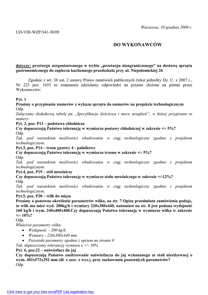 Warszawa, 10 grudnia 2009 r. UD-VIII-WZP/341-38/09 DO WYKONAWCÓW dotyczy: przetargu zorganizowanego w trybie „przetargu nieograniczonego” na dostawę sprzętu gastronomicznego do zaplecza kuchennego przedszkola przy ul. Niepołomickiej 26 Zgodnie z art. 38 ust. 2 ustawy Prawo zamówień publicznych (tekst jednolity Dz. U. z 2007 r., Nr 223 poz. 1655 ze zmianami) udzielamy odpowiedzi na pytanie złożone na piśmie przez Wykonawców: Pyt. 1 Prosimy o przypisanie numerów z wykazu sprzętu do numerów na projekcie technologicznym Odp. Załączamy dodatkową tabelę pn „Specyfikacja ilościowa i moce urządzeń”, w której przypisano te numery. Pyt. 2, poz. P13 – podstawa chłodnicza Czy dopuszczają Państwo tolerancję w wymiarze postawy chłodniczej w zakresie +/- 5%? Odp. Tak, pod warunkiem możliwości wbudowania w ciąg technologiczny zgodnie z projektem technologicznym. Pyt.3, poz. P14 – trzon gazowy 4 - palnikowy Czy dopuszczają Państwo tolerancję w wymiarze trzonu w zakresie +/- 5%? Odp. Tak, pod warunkiem możliwości wbudowania w ciąg technologiczny zgodnie z projektem technologicznym. Pyt.4, poz. P19 – stół mroźniczy Czy dopuszczają Państwo tolerancję w wymiarze stołu mroźniczego w zakresie +/-12%? Odp. Tak, pod warunkiem możliwości wbudowania w ciąg technologiczny zgodnie z projektem technologicznym. Pyt.5, poz. P20 – wilk do mięsa Prosimy o ponowne określenie parametrów wilka, na str. 7 Opisu przedmiotu zamówienia podaje, że wilk ma mieć wyd. 200kg/h i wymiary 220x380x440, natomiast na str. 8 jest podana wydajność 160 kg/h i wym. 240x400x400.Czy dopuszczają Państwo tolerancję w wymiarze wilka w zakresie +/- 10%? Odp. Właściwe parametry wilka: Wydajność – 200 kg/h Wymiary - 220x380x440 mm Pozostałe parametry zgodnie z opisem na stronie 8 Tak, dopuszczamy tolerancję wymiaru o +/- 10% Pyt. 6, poz.22 – naświetlacz do jaj Czy dopuszczają Państwo zaoferowanie naświetlacza do jaj wykonanego ze stali nierdzewnej o wym. 402x572x292 mm (dł. x szer. x wys.), przy zachowaniu pozostałych parametrów? Odp. Click here to get your free novaPDF Lite registration key Tak, jeżeli nie będzie to kolidowało z wymiarami ciągu technologicznego, zgodnie z projektem technologicznym. Pyt. 7, poz. P23 – chłodziarka do jaj Czy zgadzają się Państwo na tolerancję w wymiarze chłodziarki do jaj w zakresie +/-10%, przy zachowaniu pozostałych parametrów? Odp. Tak, jeżeli nie będzie kolidowało z wymiarami ciągu technologicznego, zgodnie z projektem technologicznym Pyt. 8, poz.P25 – szafa chłodnicza nierdzewna Czy dopuszczają Państwo zaoferowanie szafy chłodniczej o wym. 700x895x2040mm (dł.x szer.x wys.) i pojemności 700 l? Odp. Nie, zaproponowana szerokość sprzętu nie odpowiada wymiarom pomieszczenia Pyt. 9, poz. P26 – szafa mroźnicza nierdzewna Czy dopuszczają Państwo zaoferowanie szafy mroźniczej o wym. 700x895x2040mm (dł.x szer.x wys.) i pojemności 700l? Odp. Nie, zaproponowana szerokość sprzętu nie odpowiada wymiarom pomieszczenia. Pyt.10, poz. P27 – wózek kelnerski Czy dopuszczają Państwo tolerancję w wymiarze wózka kelnerskiego w zakresie +/-10%? Odp. Tak, pod warunkiem możliwości ustawienia w ciągu technologicznym, zgodnie z projektem technologicznym). Pyt. 11, poz. P28 – pojemnik na odpadki Czy dopuszczają Państwo tolerancję w wymiarze pojemnika na odpadki w zakresie +/-10%? Odp. Tak, pod warunkiem możliwości ustawienia w ciągu technologicznym, zgodnie z projektem technologicznym). Pyt. 12, poz. P34 – bemar jezdny z rozsuwanymi blatami Czy dopuszczają Państwo tolerancję w wymiarze bemaru w zakresie +/-10%? Odp. Tak, pod warunkiem możliwości ustawienia w ciągu technologicznym, zgodnie z projektem technologicznym). Pyt. 13, poz. P37 – piec konwekcyjno - parowy Czy dopuszczają Państwo zaoferowanie pieca konwekcyjno – parowego o wym. 940x850x805 mmm(dł. x szer. wys.) i mocy 15,5 kW, przy zachowaniu pozostałych parametrów? Odp. Nie Pyt. 14, poz. P49, P50 – Regał magazynowy Czy dopuszczają Państwo tolerancję w wymiarze regałów w zakresie +/-2%? Odp. Tak Pyt. 15 W poz. 10 kuter R-3 brak w ofercie jedynym eksporterem jest firma Stalgast W-wa tel. 0801 40 50 63 , która ma w ofercie cuter – wilk R2 lub R4. Kuter R 2 jest o zbliżonych parametrach technicznych ale o mocy 0,4 kW, wydajności 40kg Odp. Zamawiający wskazał nazwę handlową urządzenia jedynie celem określenia pożądanych parametrów technicznych. Każdy sprzęt innego producenta o takich samych parametrach spełnia nasze wymagania. Najważniejszymi kryteriami wyboru są wydajność oraz moc urządzenia. Click here to get your free novaPDF Lite registration key Pyt 16 Zmywarka poz. 32 GS 302T wycofana z produkcji Odp. Zamawiający wskazał nazwę handlową urządzenia jedynie celem określenia pożądanych parametrów technicznych. Każdy sprzęt innego producenta o takich samych parametrach spełnia nasze wymagania. Pyt. 17 Piec konwekcyjno – parowy Zanussi typ 240304 to piec na 6xGN1/1 o wym. 869x755x710 (wycofany z produkcji) w opisie jest piec 10xGN 1/1 równoważnym dla pieca 6x GN 1/1. Obecnie jego następcą jest typ 237000 6GN 1/1 895x845x830 mm. Czy ma być piec na 10 GN czy na 6 GN Odp. Należy przyjąć piec 6 GN 1/1. Wymiary należy tak dobrać, aby w danym pomieszczeniu można było zbudować ciąg technologiczny, zgodnie z projektem technologicznym. Pyt. 18 Poz. 19 stół mroźniczy - czy zamawiający dopuszcza urządzenie o wym. 1325x700x850? Odp. Tak, pod warunkiem możliwości wbudowania w ciąg technologiczny, zgodnie z projektem technologicznym. Pyt. 19 Poz. 22 naświetlacz do jaj – czy zamawiający dopuszcza urządzenie o innej konstrukcji, szufladowe a nie walizkowe, o takich samych parametrach funkcjonalnych? Odp. Nie Pyt. 20 Poz. 25 szafa chłodnicza – czy zamawiający dopuszcza urządzenie o wym. 700x860x2000 mm? Odp. Nie, zaproponowana szerokość sprzętu nie odpowiada wymia