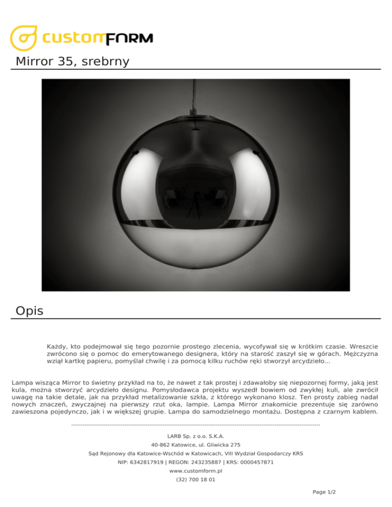 Mirror 35, srebrny Opis Każdy, kto podejmował się tego pozornie prostego zlecenia, wycofywał się w krótkim czasie. Wreszcie zwrócono się o pomoc do emerytowanego designera, który na starość zaszył się w górach. Mężczyzna wziął kartkę papieru, pomyślał chwilę i za pomocą kilku ruchów ręki stworzył arcydzieło... Lampa wisząca Mirror to świetny przykład na to, że nawet z tak prostej i zdawałoby się niepozornej formy, jaką jest kula, można stworzyć arcydzieło designu. Pomysłodawca projektu wyszedł bowiem od zwykłej kuli, ale zwrócił uwagę na takie detale, jak na przykład metalizowanie szkła, z którego wykonano klosz. Ten prosty zabieg nadał nowych znaczeń, zwyczajnej na pierwszy rzut oka, lampie. Lampa Mirror znakomicie prezentuje się zarówno zawieszona pojedynczo, jak i w większej grupie. Lampa do samodzielnego montażu. Dostępna z czarnym kablem. ----------------------------------------------------------------------------------------------------------------------------------LARB Sp. z o.o. S.K.A. 40-862 Katowice, ul. Gliwicka 275 Sąd Rejonowy dla Katowice-Wschód w Katowicach, VIII Wydział Gospodarczy KRS NIP: 6342817919 | REGON: 243235887 | KRS: 0000457871 www.customform.pl (32) 700 18 01 Page 1/2 W wyniku procesu produkcji w kloszu mogą znajdować się pęcherzyki powietrza. Lampa Mirror. Lustrzane odbicie doskonałości Specyfikacja Wysokość z kablem 120 cm Gwint żarówki E27 Średnica 35 cm Moc żarówki max 60W Ilość żarówek 1 Żarówka w komplecie tak Klosz szkło Dodatkowe zdjęcia ----------------------------------------------------------------------------------------------------------------------------------LARB Sp. z o.o. S.K.A. 40-862 Katowice, ul. Gliwicka 275 Sąd Rejonowy dla Katowice-Wschód w Katowicach, VIII Wydział Gospodarczy KRS NIP: 6342817919 | REGON: 243235887 | KRS: 0000457871 www.customform.pl (32) 700 18 01 Page 2/2 Powered by TCPDF (www.tcpdf.org)