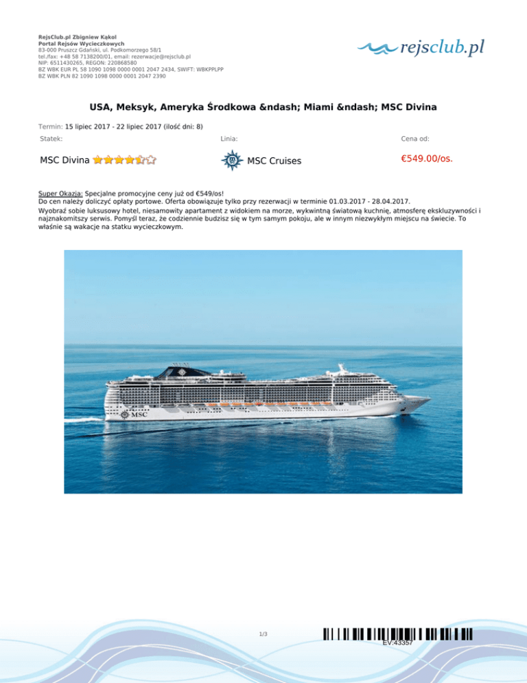 RejsClub.pl Zbigniew Kąkol Portal Rejsów Wycieczkowych 83-000 Pruszcz Gdański, ul. Podkomorzego 58/1 tel./fax: +48 58 7138200/01, email: [email protected] NIP: 6511430265, REGON: 220868580 BZ WBK EUR PL 58 1090 1098 0000 0001 2047 2434, SWIFT: WBKPPLPP BZ WBK PLN 82 1090 1098 0000 0001 2047 2390 USA, Meksyk, Ameryka Środkowa – Miami – MSC Divina Termin: 15 lipiec 2017 - 22 lipiec 2017 (ilość dni: 8) Statek: MSC Divina Linia: Cena od: MSC Cruises €549.00/os. Super Okazja: Specjalne promocyjne ceny już od €549/os! Do cen należy doliczyć opłaty portowe. Oferta obowiązuje tylko przy rezerwacji w terminie 01.03.2017 - 28.04.2017. Wyobraź sobie luksusowy hotel, niesamowity apartament z widokiem na morze, wykwintną światową kuchnię, atmosferę ekskluzywności i najznakomitszy serwis. Pomyśl teraz, że codziennie budzisz się w tym samym pokoju, ale w innym niezwykłym miejscu na świecie. To właśnie są wakacje na statku wycieczkowym. 1/3 EV:43357 RejsClub.pl Zbigniew Kąkol Portal Rejsów Wycieczkowych 83-000 Pruszcz Gdański, ul. Podkomorzego 58/1 tel./fax: +48 58 7138200/01, email: [email protected] NIP: 6511430265, REGON: 220868580 BZ WBK EUR PL 58 1090 1098 0000 0001 2047 2434, SWIFT: WBKPPLPP BZ WBK PLN 82 1090 1098 0000 0001 2047 2390 TRASA REJSU dzień 1 Data Port Wpłynięcie Wypłynięcie sobota 15.07.2017 Miami, Floryda --:-- 19:00 Stany Zjednoczone dzień 2 niedziela 16.07.2017 Dzień na morzu --:-- --:-- dzień 3 poniedziałek 17.07.2017 Ocho Rios 10:30 17:00 wtorek 18.07.2017 George Town, Wielki Kajman 09:00 16:00 środa 19.07.2017 Cozumel 10:00 18:00 dzień 6 czwartek 20.07.2017 Dzień na morzu --:-- --:-- dzień 7 piątek 21.07.2017 Nassau 12:00 18:00 07:00 --:-- dzień 4 dzień 5 dzień 8 Legenda Jamajka sobota 22.07.2017 Kajmany Meksyk Bahamy Miami, Floryda Stany Zjednoczone CENNIK Cena katalogowa Cena promocyjna Kabina wewnętrzna od €569.00 od €549.00 Kabina zewnętrzna z oknem od €699.00 od €669.00 Kabina zewnętrzna z balkonem od €889.00 od €849.00 Suite (apartament) od €1 469.00 od €1 399.00 MSC Yacht Club Suite od €1 999.00 od €1 899.00 Kabina jednoosobowa na zapytanie 3 i 4 osoba dorosła w kabinie dziecko od 12 do 17 lat jako 3 i 4 osoba w kabinie od €289.00 od €279.00 €249.00 €169.00 2/3 EV:43357 RejsClub.pl Zbigniew Kąkol Portal Rejsów Wycieczkowych 83-000 Pruszcz Gdański, ul. Podkomorzego 58/1 tel./fax: +48 58 7138200/01, email: [email protected] NIP: 6511430265, REGON: 220868580 BZ WBK EUR PL 58 1090 1098 0000 0001 2047 2434, SWIFT: WBKPPLPP BZ WBK PLN 82 1090 1098 0000 0001 2047 2390 dziecko od 2 do 11 lat jako 3 i 4 osoba w kabinie Opłaty portowe tylko opłaty portowe €130.00 Uwaga! Ceny za osobę w kabinie dwuosobowej. Cena zawiera: zakwaterowanie w kabinie wybranej kategorii; wyżywienie - 3 główne posiłki, przekąski między posiłkami, bufet lub przekąski o północy; napoje serwowane do śniadania i w bufetach samoobsługowych; serwis bagażowy podczas wejścia i zejścia ze statku; serwis kabinowy; korzystanie ze wszystkich urządzeń sportowo - rekreacyjnych znajdujących się na pokładzie statku (basen, jacuzzi, sala fitness, itp.); udział we wszystkich imprezach organizowanych na statku (przedstawienia w teatrze, koncerty, programy animacyjne itp.). Cena nie zawiera: kosztów dojazdu do portu; opłat portowych; ewentualnych noclegów w hotelu przed/po rejsie i transferów; wycieczek fakultatywnych w trakcie rejsu; korzystania z barów, mini baru w kabinie oraz napojów zamawianych w restauracji; korzystania z punktów usługowych (fryzjer, pralnia, fotograf, salon piękności i odnowy biologicznej, internet) i wydatków osobistych; napiwków dla obsługi na statku (kwota uzależniona od długości rejsu); ubezpieczenia KL, NNW i bagaż, kosztów wiz (tam gdzie wymagane). Uwagi: na wszystkich rejsach MSC Cruises można zarezerwować pakiety all inclusive: Allegrissimo 24h: 26€/os./dzień i 12€/dziecko/dzień; Allegrissimo Premium: 44€/os./dzień i 21€/dziecko/dzień (pakiet musi być wykupiony przez każdą osobę zakwaterowaną w kabinie - można zakupić w biurze przed rejsem). Na Państwa życzenie zarezerwujemy przelot, transfery do/z portu, parking, dodatkowe noclegi oraz zadbamy o odpowiednie ubezpieczenie podróżne. 3/3 EV:43357