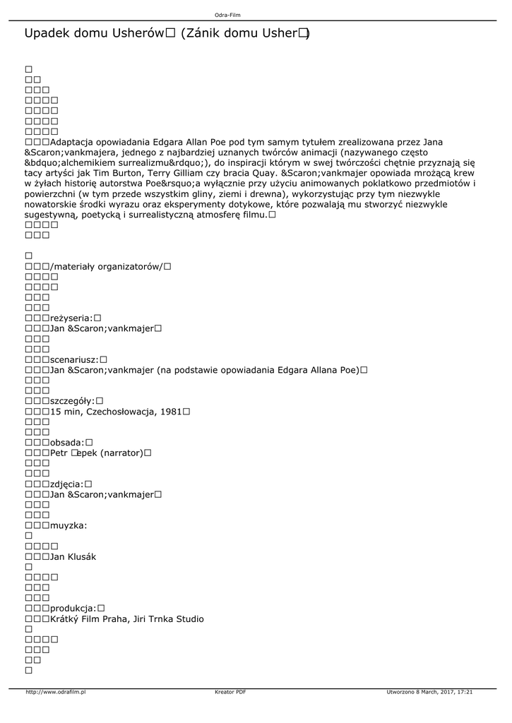 Odra-Film Upadek domu Usherów (Zánik domu Usherù) Adaptacja opowiadania Edgara Allan Poe pod tym samym tytułem zrealizowana przez Jana Švankmajera, jednego z najbardziej uznanych twórców animacji (nazywanego często „alchemikiem surrealizmu”), do inspiracji którym w swej twórczości chętnie przyznają się tacy artyści jak Tim Burton, Terry Gilliam czy bracia Quay. Švankmajer opowiada mrożącą krew w żyłach historię autorstwa Poe’a wyłącznie przy użyciu animowanych poklatkowo przedmiotów i powierzchni (w tym przede wszystkim gliny, ziemi i drewna), wykorzystując przy tym niezwykle nowatorskie środki wyrazu oraz eksperymenty dotykowe, które pozwalają mu stworzyć niezwykle sugestywną, poetycką i surrealistyczną atmosferę filmu. /materiały organizatorów/ reżyseria: Jan Švankmajer scenariusz: Jan Švankmajer (na podstawie opowiadania Edgara Allana Poe) szczegóły: 15 min, Czechosłowacja, 1981 obsada: Petr Èepek (narrator) zdjęcia: Jan Švankmajer muyzka: Jan Klusák produkcja: Krátký Film Praha, Jiri Trnka Studio http://www.odrafilm.pl Kreator PDF Utworzono 8 March, 2017, 17:21 Odra-Film http://www.odrafilm.pl Kreator PDF Utworzono 8 March, 2017, 17:21