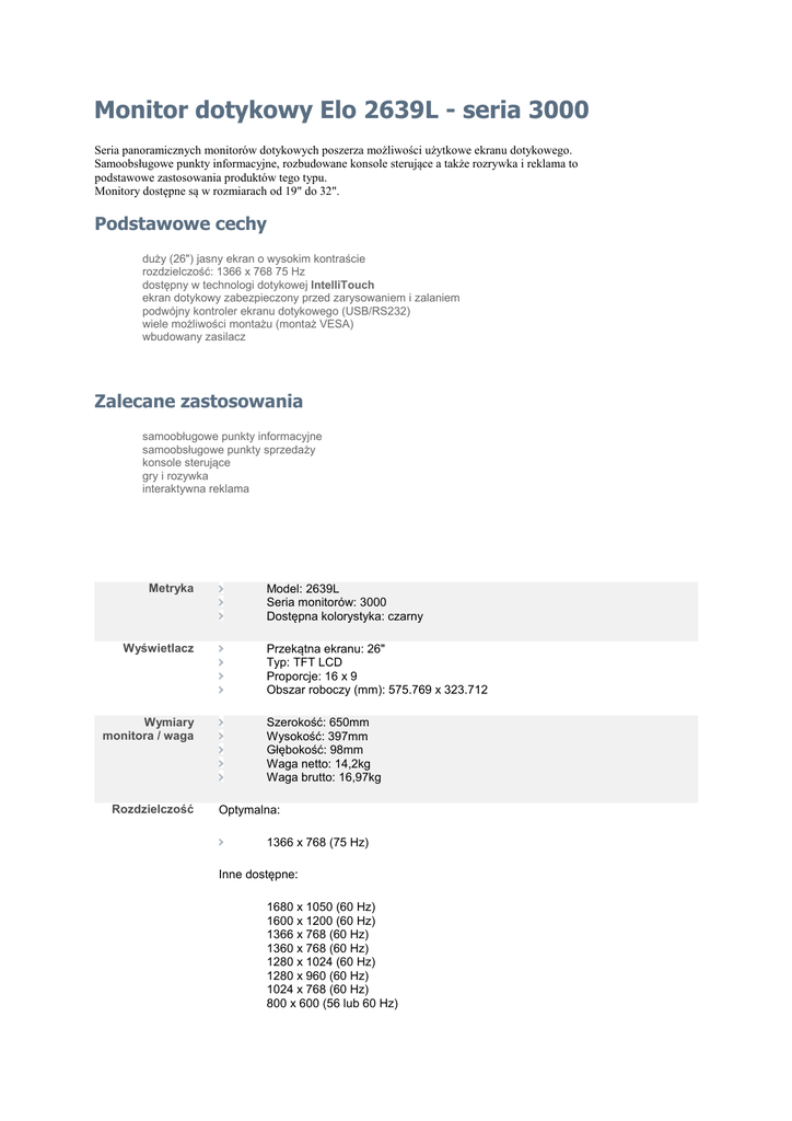 Monitor dotykowy Elo 2639L - seria 3000 Seria panoramicznych monitorów dotykowych poszerza możliwości użytkowe ekranu dotykowego. Samoobsługowe punkty informacyjne, rozbudowane konsole sterujące a także rozrywka i reklama to podstawowe zastosowania produktów tego typu. Monitory dostępne są w rozmiarach od 19" do 32". Podstawowe cechy duży (26") jasny ekran o wysokim kontraście rozdzielczość: 1366 x 768 75 Hz dostępny w technologi dotykowej IntelliTouch ekran dotykowy zabezpieczony przed zarysowaniem i zalaniem podwójny kontroler ekranu dotykowego (USB/RS232) wiele możliwości montażu (montaż VESA) wbudowany zasilacz Zalecane zastosowania samoobługowe punkty informacyjne samoobsługowe punkty sprzedaży konsole sterujące gry i rozywka interaktywna reklama Metryka Wyświetlacz Wymiary monitora / waga Rozdzielczość Model: 2639L Seria monitorów: 3000 Dostępna kolorystyka: czarny Przekątna ekranu: 26" Typ: TFT LCD Proporcje: 16 x 9 Obszar roboczy (mm): 575.769 x 323.712 Szerokość: 650mm Wysokość: 397mm Głębokość: 98mm Waga netto: 14,2kg Waga brutto: 16,97kg Optymalna: 1366 x 768 (75 Hz) Inne dostępne: 1680 x 1050 (60 Hz) 1600 x 1200 (60 Hz) 1366 x 768 (60 Hz) 1360 x 768 (60 Hz) 1280 x 1024 (60 Hz) 1280 x 960 (60 Hz) 1024 x 768 (60 Hz) 800 x 600 (56 lub 60 Hz) 640 x 480 (60 Hz) Jasność panela LCD Czas odpowiedzi matrycy Poprawna widoczność obrazu Kontrast Wejście wideo Pobór mocy 2 sam panel LCD: 500 cd/m 2 wer. APR: 450 cd/m 2 wer. IntelliTouch: 450 cd/m 2 wer. Surface Capacitive: 415 cd/m 20 ms poziomo: ±88° or 176° (lewo/prawo) pionowo: ±88° or 176° (góra/dół) 1500:1 sygnał analogowy: Mini D-Sub 15 Pin VGA sygnał cyfrowy: DVI-D typowo: 93,3W maksimum: 130W Zasilacz Szacowana trwałość podzespołów OSD Opcje montażu Gwarancja Certyfikaty i deklaracje producenta typ: wbudowany 230V żywotność podświetlania matrycy (tzw. backlight): minimum 50 000 godzin do osiągnięcia połowy pierwotnej jasności MTBF: 50 000 godzin (wykazanej) typ sterowania OSD: cyfrowe przyciski: menu, up, down, select, power funkcje: ustawienia automatyczne, kontrast, jasność, pozycja obrazu, przywr. ust. fab., temperatura kolorów, taktowanie, faza, ostrość, pozycja OSD, auto ustawienia, język (Angielski, Francuski, Włoski, Niemiecki, Hiszpański, Japoński, Chiński) funkcje publiczne OSD: blokowanie wyłącznika, blokowanie OSD Otwory montażowe w standardzie VESA 100mm 3 lata Australia C-Tick, China CCC, Japan VCCI, Korea EK, Korea MIC, Taiwan BSMI, Singapore, Argentina S-mark, UL, cUL, FCC, Mexico NOM, CE, Russia PCT, China RoHS, WEEE, IMERC