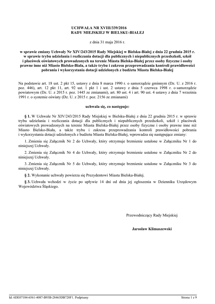 UCHWAŁA NR XVIII/339/2016 RADY MIEJSKIEJ W BIELSKU-BIAŁEJ z dnia 31 maja 2016 r. w sprawie zmiany Uchwały Nr XIV/243/2015 Rady Miejskiej w Bielsku-Białej z dnia 22 grudnia 2015 r. w sprawie trybu udzielania i rozliczania dotacji dla publicznych i niepublicznych przedszkoli, szkół i placówek oświatowych prowadzonych na terenie Miasta Bielska-Białej przez osoby fizyczne i osoby prawne inne niż Miasto Bielsko-Biała, a także trybu i zakresu przeprowadzania kontroli prawidłowości pobrania i wykorzystania dotacji udzielonych z budżetu Miasta Bielska-Białej Na podstawie art. 18 ust. 2 pkt 15, ustawy z dnia 8 marca 1990 r. o samorządzie gminnym (Dz. U. z 2016 r. poz. 446), art. 12 pkt 11, art. 92 ust. 1 pkt 1 i ust. 2 ustawy z dnia 5 czerwca 1998 r. o samorządzie powiatowym (Dz. U. z 2015 r. poz. 1445 ze zmianami), art. 80 ust. 4 i art. 90 ust. 4 ustawy z dnia 7 września 1991 r. o systemie oświaty (Dz. U. z 2015 r. poz. 2156 ze zmianami) uchwala się, co następuje: § 1. W Uchwale Nr XIV/243/2015 Rady Miejskiej w Bielsku-Białej z dnia 22 grudnia 2015 r. w sprawie trybu udzielania i rozliczania dotacji dla publicznych i niepublicznych przedszkoli, szkół i placówek oświatowych prowadzonych na terenie Miasta Bielska-Białej przez osoby fizyczne i osoby prawne inne niż Miasto Bielsko-Biała, a także trybu i zakresu przeprowadzania kontroli prawidłowości pobrania i wykorzystania dotacji udzielonych z budżetu Miasta Bielska-Białej, wprowadza się następujące zmiany: 1. Zmienia się Załącznik Nr 2 do Uchwały, który otrzymuje brzmienie ustalone w Załączniku Nr 1 do niniejszej Uchwały. 2. Zmienia się Załącznik Nr 4 do Uchwały, który otrzymuje brzmienie ustalone w Załączniku Nr 2 do niniejszej Uchwały. 3. Zmienia się Załącznik Nr 5 do Uchwały, który otrzymuje brzmienie ustalone w Załączniku Nr 3 do niniejszej Uchwały. § 2. Wykonanie uchwały powierza się Prezydentowi Miasta Bielska-Białej. § 3. Uchwała wchodzi w życie po upływie 14 dni od dnia jej ogłoszenia w Dzienniku Urzędowym Województwa Śląskiego. Przewodniczący Rady Miejskiej Jarosław Klimaszewski Id: 6DE07184-6561-4087-B93B-28463DB720F1. Podpisany Strona 1 z 9 Załącznik Nr 1 do Uchwały Nr XVIII/339/2016 Rady Miejskiej w Bielsku-Białej z dnia 31 maja 2016 r. MIESIĘCZNA INFORMACJA O LICZBIE UCZNIÓW (miesiąc) ………………………… 20 …… r. ……………………………………… Bielsko-Biała, dnia …………………………… pieczątka placówki MIESIĘCZNA INFORMACJA O LICZBIE UCZNIÓW (miesiąc) ………………………… 20 …… r. 1. Pełna nazwa i adres szkoły, przedszkola, placówki: ………………………………..................................... ………………………………………………………………………………………………………………...... 2. Pełna nazwa i adres organu prowadzącego: ………………………………………………………….......... ………………………………………………………………………………………………………………...... 3. Typ szkoły (zgodnie z art. 9 ustawy z dnia 7 września 1991 r. o systemie oświaty, Dz. U. z 1991 r. Nr 95 poz. 425 ): ……………………………………………………………………………………………………………….. 4. Rodzaj szkoły, przedszkola lub placówki (zaznaczyć właściwy): □ publiczna □ stacjonarna □ niepubliczna □ zaoczna 5. Numer rachunku bankowego właściwego do przekazania dotacji: ……………………………………………………………………………………………………………….. UCZNIOWIE / WYCHOWANKOWIE 1. 2. 3. 4. miesięczna liczba uczniów w przedszkolu w tym wczesne wspomaganie rozwoju dziecka w innej formie wychowania przedszkolnego w tym wczesne wspomaganie rozwoju dziecka w szkole podstawowej w tym: a) w oddziałach „0” b) w oddziałach ogólnodostępnych c) w oddziałach sportowych d) w oddziałach mistrzostwa sportowego e) w oddziałach dwujęzycznych f) wczesne wspomaganie rozwoju dziecka g) objętych nauczaniem domowym oraz uczących się poza szkołą w gimnazjum w tym: a) w oddziałach ogólnodostępnych b) w oddziałach sportowych c) w oddziałach mistrzostwa sportowego Id: 6DE07184-6561-4087-B93B-28463DB720F1. Podpisany Strona 2 z 9 5. 5.1 5.2 6. d) w oddziałach dwujęzycznych e) objętych nauczaniem domowym oraz uczących się poza szkołą w szkole ponadgimnazjalnej / ponadpodstawowej dla młodzieży (realizującej obowiązek nauki) w tym: a) w liceum ogólnokształcącym w oddziałach ogólnodostępnych b) w liceum ogólnokształcącym w oddziałach mistrzostwa sportowego c) w liceum ogólnokształcącym w oddziałach dwujęzycznych d) w szkołach zawodowych (liceum profilowane, zasadnicza szkoła zawodowa, technikum) e) objętych nauczaniem domowym oraz uczących się poza szkołą dla młodzieży (nie realizującej obowiązku nauki) w tym: a) w policealnej szkole kształcącej w zawodach medycznych b) w policealnej szkole kształcącej w pozostałych zawodach dla dorosłych (nie realizujących obowiązku nauki) w tym: a) w gimnazjum b) w liceum ogólnokształcącym c) w uzupełniającym liceum ogólnokształcącym d) w technikum e) w uzupełniającym technikum f) w policealnej szkole kształcącej w zawodach medycznych g) w policealnej szkole kształcącej w pozostałych zawodach w pozostałych placówkach Sporządził: ....................................................... Podpis, nr telefonu ............................................................................. Pieczątka i podpis osoby uprawnionej do reprezentowania organu prowadzącego Id: 6DE07184-6561-4087-B93B-28463DB720F1. Podpisany Strona 3 z 9 Załącznik Nr 2 do Uchwały Nr XVIII/339/2016 Rady Miejskiej w Bielsku-Białej z dnia 31 maja 2016 r. Rozliczenie wykorzystania dotacji otrzymanej w roku Formularz przeznaczony j