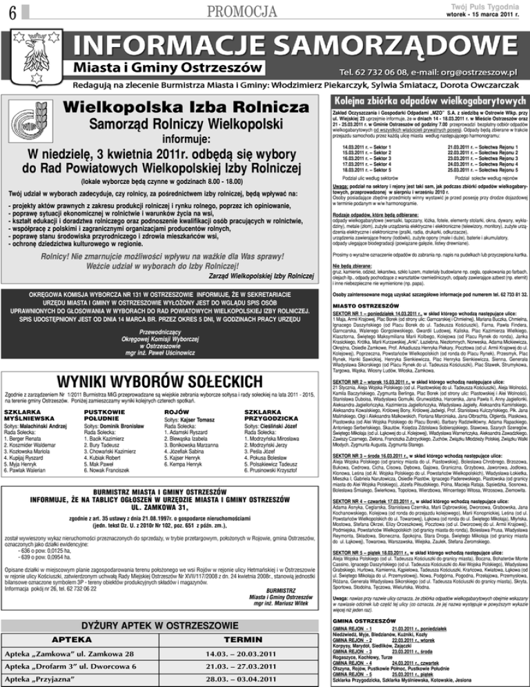 6 PROMOCJA Wielkopolska Izba Rolnicza Samorz¹d Rolniczy Wielkopolski informuje: W niedzielê, 3 kwietnia 2011r. odbêd¹ siê wybory do Rad Powiatowych Wielkopolskiej Izby Rolniczej (lokale wyborcze bêd¹ czynne w godzinach 8.00 - 18.00) Twój udzia³ w wyborach zadecyduje, czy rolnicy, za poœrednictwem izby rolniczej, bêd¹ wp³ywaæ na: - projekty aktów prawnych z zakresu produkcji rolniczej i rynku rolnego, poprzez ich opiniowanie, - poprawê sytuacji ekonomicznej w rolnictwie i warunków ¿ycia na wsi, - kszta³t edukacji i doradztwa rolniczego oraz podnoszenie kwalifikacji osób pracuj¹cych w rolnictwie, - wspó³pracê z polskimi i zagranicznymi organizacjami producentów rolnych, - poprawê stanu œrodowiska przyrodniczego i zdrowia mieszkañców wsi, - ochronê dziedzictwa kulturowego w regionie. Rolnicy! Nie zmarnujcie mo¿liwoœci wp³ywu na wa¿kie dla Was sprawy! WeŸcie udzia³ w wyborach do Izby Rolniczej! Zarz¹d Wielkopolskiej Izby Rolniczej OKRÊGOWA KOMISJA WYBORCZA NR 131 W OSTRZESZOWIE INFORMUJE, ¯E W SEKRETARIACIE URZÊDU MIASTA I GMINY W OSTRZESZOWIE WY£O¯ONY JEST DO WGL¥DU SPIS OSÓB UPRAWNIONYCH DO G£OSOWANIA W WYBORACH DO RAD POWIATOWYCH WIELKOPOLSKIEJ IZBY ROLNICZEJ. SPIS UDOSTÊPNIONY JEST OD DNIA 14 MARCA BR. PRZEZ OKRES 5 DNI, W GODZINACH PRACY URZÊDU Przewodnicz¹cy Okrêgowej Komisji Wyborczej w Ostrzeszowie mgr in¿. Pawe³ Uœcinowicz WYNIKI WYBORÓW SO£ECKICH Zgodnie z zarz¹dzeniem Nr 1/2011 Burmistrza MiG przeprowadzane s¹ wiejskie zebrania wyborcze so³tysa i rady so³eckiej na lata 2011 - 2015, na terenie gminy Ostrzeszów. Poni¿ej zamieszczamy wyniki kolejnych czterech spotkañ. PUSTKOWIE PO£UDNIE So³tys: Dominik Bronis³aw Rada So³ecka: 1. Bacik Kazimierz 2. Bury Tadeusz 3. Chowañski Kazimierz 4. Kubiak Robert 5. Mak Pawe³ 6. Nowak Franciszek SZKLARKA MYŒLNIEWSKA So³tys: Malachiñski Andrzej Rada So³ecka: 1. Berger Renata 2. Koszmider Waldemar 3. Koz³owska Mariola 4. Kupijaj Ryszard 5. Myja Henryk 6. Pawlak Walerian SZKLARKA PRZYGODZICKA So³tys: Cieœliñski Józef Rada So³ecka: 1. Modrzyñska Miros³awa 2. Modrzyñski Jerzy 3. Peœla Józef 4. Pokusa Boles³aw 5. Polsakiewicz Tadeusz 6. Prusinowski Krzysztof ROJÓW So³tys: Kajser Tomasz Rada So³ecka: 1. Adamski Ryszard 2. Blew¹ska Izabela 3. Bonikowska Marzanna 4. Józefiak Sabina 5. Kajser Henryk 6. Kempa Henryk BURMISTRZ MIASTA I GMINY OSTRZESZÓW INFORMUJE, ¯E NA TABLICY OG£OSZEÑ W URZÊDZIE MIASTA I GMINY OSTRZESZÓW UL. ZAMKOWA 31, zgodnie z art. 35 ustawy z dnia 21.08.1997r. o gospodarce nieruchomoœciami (jedn. tekst Dz. U. z 2010r Nr 102, poz. 651 z póŸn. zm.), zosta³ wywieszony wykaz nieruchomoœci przeznaczonych do sprzeda¿y, w trybie przetargowym, po³o¿onych w Rojowie, gmina Ostrzeszów, oznaczonych jako dzia³ki ewidencyjne: - 636 o pow. 0,0125 ha, - 639 o pow. 0,0954 ha. Opisane dzia³ki w miejscowym planie zagospodarowania terenu po³o¿onego we wsi Rojów w rejonie ulicy Hetmañskiej i w Ostrzeszowie w rejonie ulicy Koœciuszki, zatwierdzonym uchwa³¹ Rady Miejskiej Ostrzeszów Nr XVII/117/2008 z dn. 24 kwietnia 2008r., stanowi¹ jednostki bilansowe oznaczone symbolem 3P - tereny obiektów produkcyjnych sk³adów i magazynów. Informacja pokój nr 26, tel. 62 732 06 22 BURMISTRZ Miasta i Gminy Ostrzeszów mgr in¿. Mariusz Witek DY¯URY APTEK W OSTRZESZOWIE APTEKA TERMIN Apteka „Zamkowa” ul. Zamkowa 28 14.03. – 20.03.2011 Apteka „Drofarm 3” ul. Dworcowa 6 21.03. – 27.03.2011 Apteka „Przyjazna” 28.03. – 03.04.2011 Twój Puls Tygodnia wtorek - 15 marca 2011 r. Kolejna zbiórka odpadów wielkogabarytowych Zak³ad Oczyszczania i Gospodarki Odpadami „MZO” S.A. z siedzib¹ w Ostrowie Wlkp. przy ul. Wiejskiej 23 uprzejmie informuje, ¿e w dniach 14 - 18.03.2011 r. w Mieœcie Ostrzeszów oraz 21 - 25.03.2011 r. w Gminie Ostrzeszów od godziny 7.00 przeprowadzi bezp³atny odbiór odpadów wielkogabarytowych od wszystkich w³aœcicieli prywatnych posesji. Odpady bêd¹ zbierane w trakcie przejazdu samochodu przez ka¿d¹ ulicê miasta wed³ug nastêpuj¹cego harmonogramu: 14.03.2011 r. – Sektor 1 15.03.2011 r. – Sektor 2 16.03.2011 r. – Sektor 3 17.03.2011 r. – Sektor 4 18.03.2011 r. – Sektor 5 Podzia³ ulic wed³ug sektorów 21.03.2011 r. – So³ectwa Rejonu 1 22.03.2011 r. – So³ectwa Rejonu 2 23.03.2011 r. – So³ectwa Rejonu 3 24.03.2011 r. – So³ectwa Rejonu 4 25.03.2011 r. – So³ectwa Rejonu 5 Podzia³ so³ectw wed³ug rejonów Uwaga: podzia³ na sektory i rejony jest taki sam, jak podczas zbiórki odpadów wielkogabarytowych, przeprowadzonej w sierpniu i wrzeœniu 2010 r. Osoby posiadaj¹ce zbêdne przedmioty winny wystawiæ je przed posesjê przy drodze dojazdowej w terminie podanym w w/w harmonogramie. Rodzaje odpadów, które bêd¹ odbierane: odpady wielkogabarytowe (wersalki, tapczany, ³ó¿ka, fotele, elementy stolarki, okna, dywany, wyk³adziny), metale (z³om), zu¿yte urz¹dzenia elektryczne i elektroniczne (telewizory, monitory), zu¿yte urz¹dzenia elektryczne i elektroniczne (pralki, radia, drukarki, odkurzacze), urz¹dzenia zawieraj¹ce freony (lodówki), zu¿yte opony (ma³e i du¿e), baterie i akumulatory, odpady ulegaj¹ce biodegradacji (powi¹zane ga³êzie, listwy drewniane). Prosimy o wyraŸne oznaczenie odpadów do zabrania np. napis na pudelkach lub przyczepiona kartka. Nie bêd¹ zbierane: gruz, kamienie, odzie¿, lekarstwa, szk³o luzem, materia³y budowlane np. ceg³a, opakowania po farbach, olejach itp., odpady pochodz¹ce z warsztatów rzemieœlniczych, odpady zawieraj¹ce azbest (np. eternit) i inne niebezpieczne nie wymienione (np. papa). Osoby zainteresowane mog¹ uzyskaæ szczegó³owe informacje pod numerem tel. 62 733 81 32. MIASTO OSTRZESZÓW SEKTOR NR 1 – poniedzia³ek 14.03.2011 r., w sk³ad którego wchodz¹ nastêpuj¹ce ulice: 1 Maja, Armii Krajowej, Plac Borek (od strony ulic: Garncarskiej i Chmielnej), Mariana Buczka, Chmielna, Ignacego Daszyñskiego (od Placu Borek
