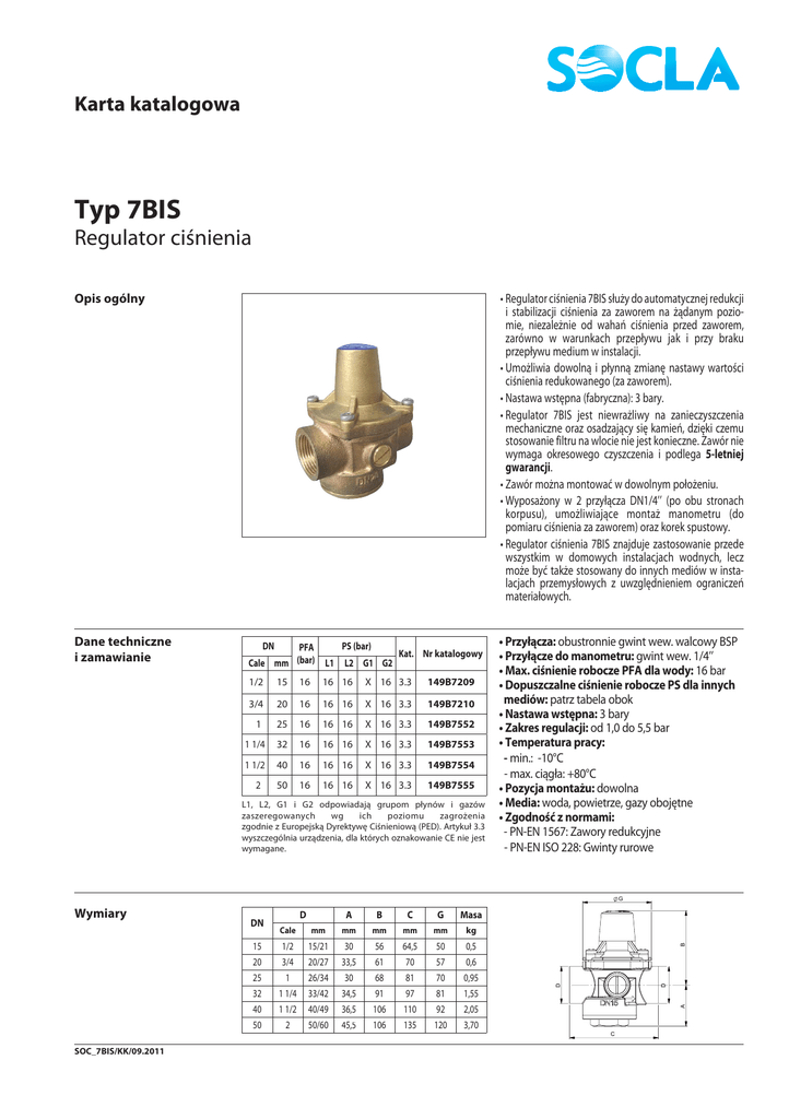 Karta katalogowa Typ 7BIS Regulator ciśnienia Opis ogólny Dane techniczne i zamawianie • Regulator ciśnienia 7BIS służy do automatycznej redukcji i stabilizacji ciśnienia za zaworem na żądanym poziomie, niezależnie od wahań ciśnienia przed zaworem, zarówno w warunkach przepływu jak i przy braku przepływu medium w instalacji. • Umożliwia dowolną i płynną zmianę nastawy wartości ciśnienia redukowanego (za zaworem). • Nastawa wstępna (fabryczna): 3 bary. • Regulator 7BIS jest niewrażliwy na zanieczyszczenia mechaniczne oraz osadzający się kamień, dzięki czemu stosowanie filtru na wlocie nie jest konieczne. Zawór nie wymaga okresowego czyszczenia i podlega 5-letniej gwarancji. • Zawór można montować w dowolnym położeniu. • Wyposażony w 2 przyłącza DN1/4’’ (po obu stronach korpusu), umożliwiające montaż manometru (do pomiaru ciśnienia za zaworem) oraz korek spustowy. • Regulator ciśnienia 7BIS znajduje zastosowanie przede wszystkim w domowych instalacjach wodnych, lecz może być także stosowany do innych mediów w instalacjach przemysłowych z uwzględnieniem ograniczeń materiałowych. DN PS (bar) PFA Kat. Nr katalogowy (bar) Cale mm L1 L2 G1 G2 1/2 15 16 16 16 X 16 3.3 149B7209 3/4 20 16 16 16 X 16 3.3 149B7210 1 25 16 16 16 X 16 3.3 149B7552 1 1/4 32 16 16 16 X 16 3.3 149B7553 1 1/2 40 16 16 16 X 16 3.3 149B7554 50 16 16 16 X 16 3.3 149B7555 2 L1, L2, G1 i G2 odpowiadają grupom płynów i gazów zaszeregowanych wg ich poziomu zagrożenia zgodnie z Europejską Dyrektywę Ciśnieniową (PED). Artykuł 3.3 wyszczególnia urządzenia, dla których oznakowanie CE nie jest wymagane. • Przyłącza: obustronnie gwint wew. walcowy BSP • Przyłącze do manometru: gwint wew. 1/4’’ • Max. ciśnienie robocze PFA dla wody: 16 bar • Dopuszczalne ciśnienie robocze PS dla innych mediów: patrz tabela obok • Nastawa wstępna: 3 bary • Zakres regulacji: od 1,0 do 5,5 bar • Temperatura pracy: - min.: -10°C - max. ciągła: +80°C • Pozycja montażu: dowolna • Media: woda, powietrze, gazy obojętne • Zgodność z normami: - PN-EN 1567: Zawory redukcyjne - PN-EN ISO 228: Gwinty rurowe G SOC_7BIS/KK/09.2011 C G mm mm mm mm Masa kg 15 1/2 15/21 30 56 64,5 50 0,5 20 3/4 20/27 33,5 61 70 57 0,6 25 1 26/34 30 68 81 70 0,95 32 1 1/4 33/42 34,5 91 97 81 1,55 40 1 1/2 40/49 36,5 106 110 92 2,05 50 2 50/60 45,5 106 135 120 3,70 B B mm A D D A Cale DN D Wymiary C Karta katalogowa Typ 7BIS - Regulator ciśnienia Materiały i budowa Nr OPIS MATERIAŁ EURO ANSI 1 KORPUS Brąz CuPb5Zn5Sn5-C ASTM B 505 2 STRZEMIĘ Mosiądz DZR CuZn36 Pb As Mosiądz CuZn39Pb3 3 ZAWIERADŁO 4 USZCZELKA DN1/2’’ - 3/4’’ EPDM USZCZELKA DN1’’ - 2’’ NBR (Nitryl) ASTM B 124 5 MEMBRANA NBR (Nitryl) zbrojony poliamidem 6 PODKŁADKA Mosiądz CuZn39Pb3 ASTM B 124 7 NAKRĘTKA Stal nierdzewna X5CrNi 18-10 AISI 304 8 ŚRUBA Stal nierdzewna X5CrNi 18-10 AISI 304 ASTM B 124 9 POKRYWA Mosiądz CuZn39Pb2 10 SPRĘŻYNA Stal antykorozyjna SH 11 ŚRUBA NASTAWCZA Mosiądz CuZn39Pb3 ASTM B 124 12 POKRYWA DOLNA Mosiądz CuZn39Pb3 ASTM B 124 13 O-RING KOREK (przyłącze 14 manometryczne) 15 PIERŚCIEŃ NBR (Nitryl) CuZn39Pb3 ASTM B 124 16 ZAŚLEPKA Plastik Mosiądz NBR (Nitryl) Charakterystyka pracy Wykres strat ciśnienia Współczynnik Kv Nastawa Ciśnienie za zaworem (bar) Obszar, zaznaczony na wykresie kolorem, wyznacza dopuszczalny zakres regulacji dla zaworów typ 7BIS. Qmax dla Q 2m/s DN Kv Cale m3/h m3/h m3/h 1/2 2 3,5 1,27 3/4 3 5,8 2,26 1 3,1 6,2 3,53 1 1/4 5,5 10 5,8 1 1/2 9,3 13,5 9 2 17,4 30 14 1/2" 3 3/4" 1" 1"1/4 2" 1"1/2 2 'p [bar] Ciśnienie przed zaworem (bar) Zakres regulacji 1 0 Kv= przepływ wody w m3/h przez zawór przy określonym jego stopniu otwarcia i wywołujący stratę ciśnienia 1 bar 0 5 10 15 20 25 30 Débit (m3/h) 3/h] Przepływ [m Przepływ dla nastawy 3 bary i ciśnienia przed zaworem 8 bar. Instalacja Regulatory 7BIS mogą pracować w dowolnej pozycji. Urządzenie należy zamontować zgodnie z kierunkiem przypływu medium (patrz strzałka na obudowie). Zmiany nastawy ciśnienia redukowanego dokonuje się za pomocą śruby nastawczej (w górnej części zaworu). Inne wykonania - typ 7EP: przyłącza półśrubunek (wlot) i gwint zew. (wylot) - typ 7SP: przyłącza gwint zew. (wlot), półśrubunek (wylot) Watts Industries nie ponosi odpowiedzialności za możliwe błędy w katalogach, broszurach i innych materiałach drukowanych. Watts Industries zastrzega sobie prawo do wprowadzania zmian w produktach bez uprzedzenia. Dotyczy to również produktów już zamówionych. Zamienniki mogą być dostarczane bez dokonywania jakichkolwiek zmian w specyfikacjach już uzgodnionych. Wszystkie znaki towarowe w tym materiale są własnością odpowiednich spółek. Wszystkie prawa zastrzeżone. Watts Industries Polska Sp. z o.o. ul. Chrzanowska 5 PL05-825 Grodzisk Mazowiecki Telefon: (48 22) 755 07 00, Faks: (48 22) 755 07 05 http://www.socla.pl e-mail: [email protected] SOC_7BIS/KK/09.2011
