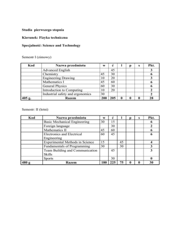 Studia pierwszego stopnia Kierunek: Fizyka techniczna Specjalność: Science and Technology Semestr I (zimowy) Kod 405 g. Nazwa przedmiotu Advanced English Chemistry Engineering Drawing Mathematics I General Physics Introduction to Computing Industrial safety and ergonomics Razem w ć 45 30 20 60 30 20 45 10 45 60 10 30 200 205 l p s 0 0 0 l p s Pkt. 3 6 3 6 6 2 2 28 Semestr: II (letni) Kod 480 g Nazwa przedmiotu Basic Mechanical Engineering Foreign language Mathematics II Electronics and Electrical Engineering Experimental Methods in Science Fundamentals of Programming Team Building and Communication Skills Sports Razem w 30 45 60 ć 15 30 60 45 15 30 45 30 4 3 3 45 30 180 225 75 Pkt. 6 2 6 6 0 0 0 30 Semestr: III (zimowy) Kod 495 Nazwa przedmiotu Business English for Engineers Chemical Analysis Economics Contemporary physics Mathematics III Object Oriented Programming Physics of Solids and Liquids Basic Materials Foreign language Sports Razem w 15 30 45 30 30 30 15 ć 45 l p s 0 0 p s 30 15 20 30 10 30 15 30 60 30 195 170 130 Pkt. 3 3 3 4 6 3 3 3 2 0 30 Semestr: IV (letni) Kod 420 g Nazwa przedmiotu Applied Chemistry and Material Science Mathematical Methods of Physics Experimental Techniques in Material Physics Testing Methods and Techniques in Material Science Network Technologies Project I Foreign Language Sports Razem w 30 ć 30 30 30 l 15 Pkt. 3 6 3 15 15 30 3 15 45 3 9 2 0 29 120 60 30 105 120 60 135 0 Semestr: V (zimowy) Kod 255 g. Nazwa przedmiotu Project II (PBL) Computational Physics Optical devices Radiation protection Intellectual property protection Sports Razem w ć 105 30 30 30 90 0 Pkt. 6 4 2 2 1 0 15 w ć l p s Pkt. 90 25 60 15 0 30 30 30 30 15 l p 90 s 30 Semestr: VI (letni) Kod Nazwa przedmiotu Semestr wyjazdowy Razem Praktyki (co najmniej 4 tygodnie ukończone przed końcem VI semestru) – 2 pkt. Semestr: VII (zimowy) Kod 180 Nazwa przedmiotu Environmental science Elective courses Final project Razem w 30 ć l p s 15 105 15 0 30 0 Pkt. 4 12 15 31