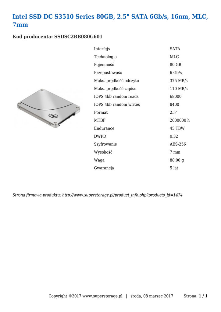 Intel SSD DC S3510 Series 80GB, 2.5" SATA 6Gb/s, 16nm, MLC, 7mm