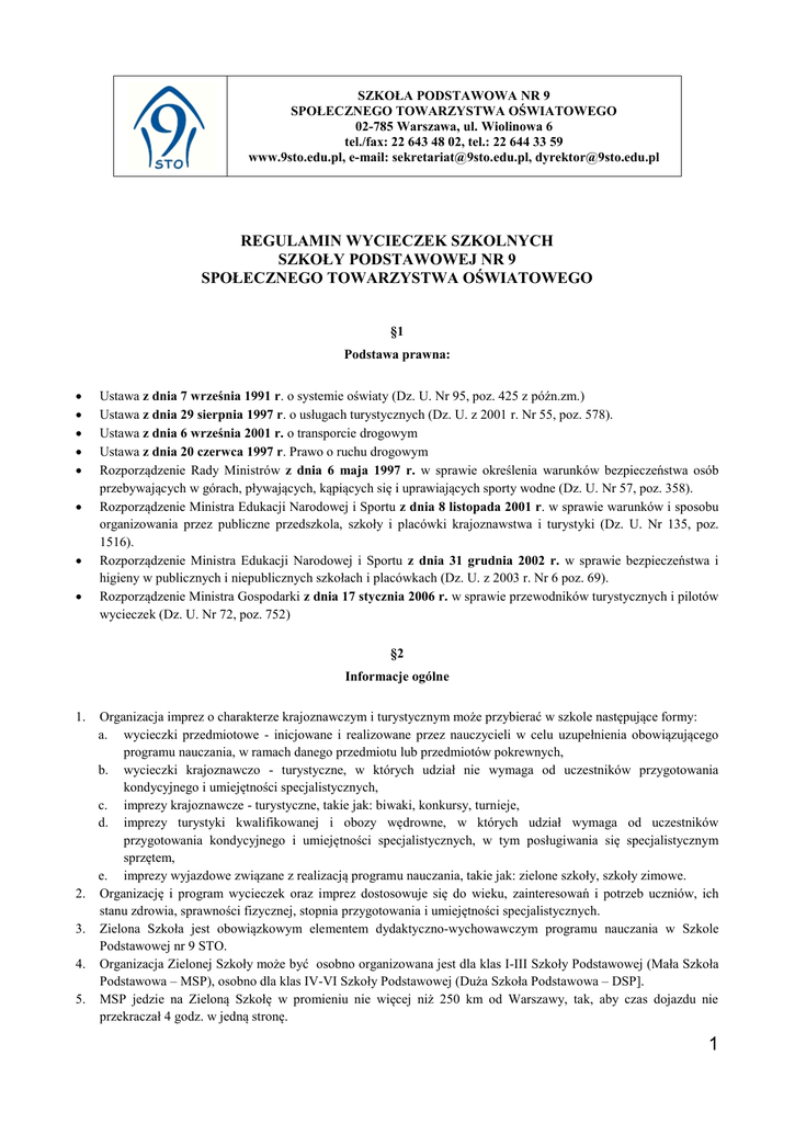 SZKOŁA PODSTAWOWA NR 9 SPOŁECZNEGO TOWARZYSTWA OŚWIATOWEGO 02-785 Warszawa, ul. Wiolinowa 6 tel./fax: 22 643 48 02, tel.: 22 644 33 59 www.9sto.edu.pl, e-mail: [email protected], [email protected] REGULAMIN WYCIECZEK SZKOLNYCH SZKOŁY PODSTAWOWEJ NR 9 SPOŁECZNEGO TOWARZYSTWA OŚWIATOWEGO §1 Podstawa prawna: Ustawa z dnia 7 września 1991 r. o systemie oświaty (Dz. U. Nr 95, poz. 425 z późn.zm.) Ustawa z dnia 29 sierpnia 1997 r. o usługach turystycznych (Dz. U. z 2001 r. Nr 55, poz. 578). Ustawa z dnia 6 września 2001 r. o transporcie drogowym Ustawa z dnia 20 czerwca 1997 r. Prawo o ruchu drogowym Rozporządzenie Rady Ministrów z dnia 6 maja 1997 r. w sprawie określenia warunków bezpieczeństwa osób przebywających w górach, pływających, kąpiących się i uprawiających sporty wodne (Dz. U. Nr 57, poz. 358). Rozporządzenie Ministra Edukacji Narodowej i Sportu z dnia 8 listopada 2001 r. w sprawie warunków i sposobu organizowania przez publiczne przedszkola, szkoły i placówki krajoznawstwa i turystyki (Dz. U. Nr 135, poz. 1516). Rozporządzenie Ministra Edukacji Narodowej i Sportu z dnia 31 grudnia 2002 r. w sprawie bezpieczeństwa i higieny w publicznych i niepublicznych szkołach i placówkach (Dz. U. z 2003 r. Nr 6 poz. 69). Rozporządzenie Ministra Gospodarki z dnia 17 stycznia 2006 r. w sprawie przewodników turystycznych i pilotów wycieczek (Dz. U. Nr 72, poz. 752) §2 Informacje ogólne 1. 2. 3. 4. 5. Organizacja imprez o charakterze krajoznawczym i turystycznym może przybierać w szkole następujące formy: a. wycieczki przedmiotowe - inicjowane i realizowane przez nauczycieli w celu uzupełnienia obowiązującego programu nauczania, w ramach danego przedmiotu lub przedmiotów pokrewnych, b. wycieczki krajoznawczo - turystyczne, w których udział nie wymaga od uczestników przygotowania kondycyjnego i umiejętności specjalistycznych, c. imprezy krajoznawcze - turystyczne, takie jak: biwaki, konkursy, turnieje, d. imprezy turystyki kwalifikowanej i obozy wędrowne, w których udział wymaga od uczestników przygotowania kondycyjnego i umiejętności specjalistycznych, w tym posługiwania się specjalistycznym sprzętem, e. imprezy wyjazdowe związane z realizacją programu nauczania, takie jak: zielone szkoły, szkoły zimowe. Organizację i program wycieczek oraz imprez dostosowuje się do wieku, zainteresowań i potrzeb uczniów, ich stanu zdrowia, sprawności fizycznej, stopnia przygotowania i umiejętności specjalistycznych. Zielona Szkoła jest obowiązkowym elementem dydaktyczno-wychowawczym programu nauczania w Szkole Podstawowej nr 9 STO. Organizacja Zielonej Szkoły może być osobno organizowana jest dla klas I-III Szkoły Podstawowej (Mała Szkoła Podstawowa – MSP), osobno dla klas IV-VI Szkoły Podstawowej (Duża Szkoła Podstawowa – DSP]. MSP jedzie na Zieloną Szkołę w promieniu nie więcej niż 250 km od Warszawy, tak, aby czas dojazdu nie przekraczał 4 godz. w jedną stronę. 1 6. Termin oraz miejsce pobytu Zielonej Szkoły zostaje podany na pierwszym zebraniu z Rodzicami po Nowym Roku i powinien uwzględniać terminy innych wydarzeń, w których udział biorą uczniowie, np. pierwsza komunia i jej rocznica dla klas II i III MSP. §3 Obowiązki kierownika wycieczki 1. 2. 3. 4. 5. 6. 7. Dyrektor szkoły wyznacza kierownika wycieczki lub imprezy spośród pracowników pedagogicznych szkoły o kwalifikacjach odpowiednich do realizacji określonych form krajoznawstwa i turystyki. Kierownikiem wycieczki lub imprezy może być także inna, wyznaczona przez Dyrektora szkoły, osoba pełnoletnia, która: a. ukończyła kurs kierowników wycieczek szkolnych lub b. jest instruktorem harcerskim lub c. posiada uprawnienia przewodnika turystycznego, przodownika lub instruktora turystyki kwalifikowanej lub pilota wycieczek. Na co najmniej trzy dni przed terminem wycieczki przedmiotowej lub turystyczno - krajoznawczej jej kierownik zgłasza Dyrektorowi zamiar wyjścia poza teren szkoły w celu sporządzenia zastępstw za nieobecnego nauczyciela (kierownika lub opiekuna wycieczki). Kierownik wycieczki lub imprezy w szczególności: a. opracowuje program i harmonogram wycieczki lub imprezy, b. opracowuje regulamin i zapoznaje z nim wszystkich uczestników, c. zapewnia warunki do pełnej realizacji programu i regulaminu wycieczki lub imprezy oraz sprawuje nadzór w tym zakresie, d. zapoznaje uczestników z zasadami bezpieczeństwa oraz zapewnia warunki do ich przestrzegania, e. określa zadania opiekuna w zakresie realizacji programu, zapewnienia opieki i bezpieczeństwa uczestnikom wycieczki lub imprezy, f. nadzoruje zaopatrzenie uczestników w sprawny sprzęt i ekwipunek oraz apteczkę pierwszej pomocy, g. organizuje transport, wyżywienie i noclegi dla uczestników, h. dokonuje podziału zadań wśród uczestników, i. dysponuje środkami finansowymi przeznaczonymi na organizację wycieczki lub imprezy, j. dokonuje podsumowania, oceny i rozliczenia finansowego wycieczki lub imprezy po jej zakończeniu. Dokumentacja wycieczki, którą kierownik przekazuje Dyrektorowi w określonym czasie, zawiera: a. kartę wycieczki, b. listę uczestników, c. pisemne zgody rodziców (prawnych opiekunów) - o ile nie zostały one wcześniej pobrane od rodziców i złożone w sekretariacie szkoły, Kierownik wycieczki, po zatwierdzeniu karty wycieczki, zgłasza odpowiednio wcześnie wyjazd grupy do Komendy Policji w celu sprawdzenia stanu technicznego autobusu. Fakt przeprowadzenia wycieczki kierownik lub wychowawcy klas mają obowiązek odnotować w dzienniku elektronicznym. §4 Obowiązki opiekuna wycieczki 1. 2. 3. Opiekunem wycieczki lub imprezy może być nauczyciel albo, po uzyskaniu zgody Dyrektora szkoły, inna pełnoletnia osoba, w tym także rodzic ucznia. Opiekun potwierdza własnoręcznym podpisem na karcie wycieczki zobowiązanie do pełnienia funkcji i rzetelnego wykonywania obowiązków opiekuna wycieczki. Opiekun w szczególności: a. sprawuje opiek