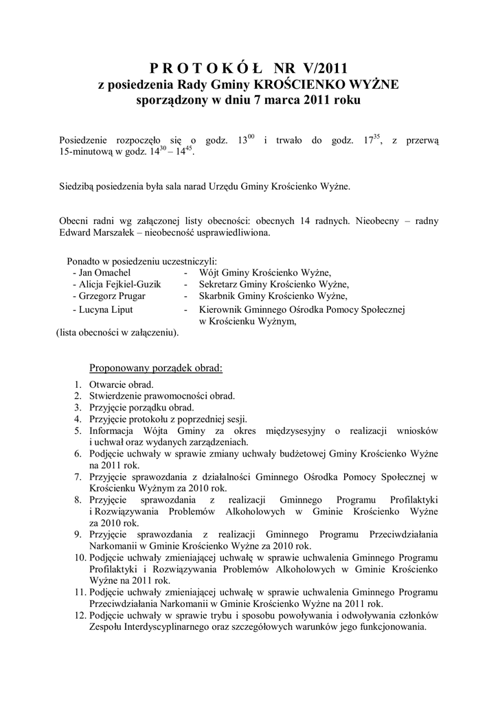 Protokół Nr V/2011 - Urząd Gminy Krościenko Wyżne