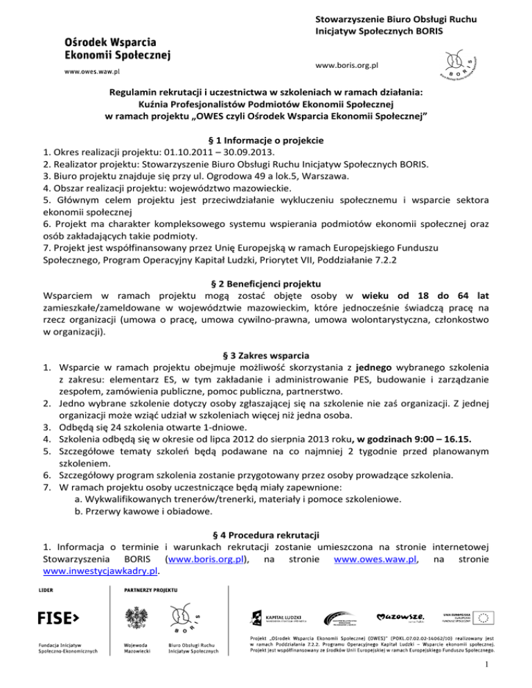 Stowarzyszenie Biuro Obsługi Ruchu Inicjatyw Społecznych BORIS www.boris.org.pl Regulamin rekrutacji i uczestnictwa w szkoleniach w ramach działania: Kuźnia Profesjonalistów Podmiotów Ekonomii Społecznej w ramach projektu „OWES czyli Ośrodek Wsparcia Ekonomii Społecznej” § 1 Informacje o projekcie 1. Okres realizacji projektu: 01.10.2011 – 30.09.2013. 2. Realizator projektu: Stowarzyszenie Biuro Obsługi Ruchu Inicjatyw Społecznych BORIS. 3. Biuro projektu znajduje się przy ul. Ogrodowa 49 a lok.5, Warszawa. 4. Obszar realizacji projektu: województwo mazowieckie. 5. Głównym celem projektu jest przeciwdziałanie wykluczeniu społecznemu i wsparcie sektora ekonomii społecznej 6. Projekt ma charakter kompleksowego systemu wspierania podmiotów ekonomii społecznej oraz osób zakładających takie podmioty. 7. Projekt jest współfinansowany przez Unię Europejską w ramach Europejskiego Funduszu Społecznego, Program Operacyjny Kapitał Ludzki, Priorytet VII, Poddziałanie 7.2.2 § 2 Beneficjenci projektu Wsparciem w ramach projektu mogą zostać objęte osoby w wieku od 18 do 64 lat zamieszkałe/zameldowane w województwie mazowieckim, które jednocześnie świadczą pracę na rzecz organizacji (umowa o pracę, umowa cywilno-prawna, umowa wolontarystyczna, członkostwo w organizacji). 1. 2. 3. 4. 5. 6. 7. § 3 Zakres wsparcia Wsparcie w ramach projektu obejmuje możliwość skorzystania z jednego wybranego szkolenia z zakresu: elementarz ES, w tym zakładanie i administrowanie PES, budowanie i zarządzanie zespołem, zamówienia publiczne, pomoc publiczna, partnerstwo. Jedno wybrane szkolenie dotyczy osoby zgłaszającej się na szkolenie nie zaś organizacji. Z jednej organizacji może wziąć udział w szkoleniach więcej niż jedna osoba. Odbędą się 24 szkolenia otwarte 1-dniowe. Szkolenia odbędą się w okresie od lipca 2012 do sierpnia 2013 roku, w godzinach 9:00 – 16.15. Szczegółowe tematy szkoleń będą podawane na co najmniej 2 tygodnie przed planowanym szkoleniem. Szczegółowy program szkolenia zostanie przygotowany przez osoby prowadzące szkolenia. W ramach projektu osoby uczestniczące będą miały zapewnione: a. Wykwalifikowanych trenerów/trenerki, materiały i pomoce szkoleniowe. b. Przerwy kawowe i obiadowe. § 4 Procedura rekrutacji 1. Informacja o terminie i warunkach rekrutacji zostanie umieszczona na stronie internetowej Stowarzyszenia BORIS (www.boris.org.pl), na stronie www.owes.waw.pl, na stronie www.inwestycjawkadry.pl. 1 Stowarzyszenie Biuro Obsługi Ruchu Inicjatyw Społecznych BORIS www.boris.org.pl 2. Osoby zgłaszające się na szkolenie zobowiązane są wypełnić i podpisać dostępny na stronach internetowych lub w biurze Stowarzyszenia BORIS formularz zgłoszeniowy wraz z deklaracją przystąpienia do projektu oraz formularz PEFS wraz ze zgodą na przetwarzanie w ramach projektu danych osobowych zawartych w formularzu PEFS a następnie odesłać go pocztą elektroniczną na adres – [email protected]. Istnieje również możliwość osobistego dostarczenia formularza do Biura projektu lub wysłania go pocztą tradycyjną. Termin nadsyłania zgłoszeń określany będzie przy każdym ogłoszeniu o naborze na szklenia. Wszystkie dokumenty (formularz zgłoszeniowy, deklaracja udziału w projekcie oraz formularz PEFS) muszą być wypełnione komputerowo lub pismem drukowanym (czytelnie), następnie odesłane na adres mailowy podany wyżej lub osobiście do biura Stowarzyszenia BORIS. 3. Osoby zakwalifikowane do szkolenia, po otrzymaniu potwierdzenia, zobowiązują się do podpisania dokumentów przed rozpoczęciem szkolenia. 4. Liczba miejsc na szkoleniach jest ograniczona – 24 szkolenia po 15 osób każde. W przypadku większej niż zakładana liczby zgłoszeń decydować będzie kolejność zgłoszeń 5. Pierwsze 15 osób zostanie zakwalifikowanych do udziału w szkoleniu. Kolejne osoby (maksymalnie 7), zostaną wpisane na listę rezerwową. W przypadku, gdy któraś z osób zakwalifikowanych zrezygnuje z udziału w szkoleniu, na jej miejsce zostanie przyjęta pierwsza osoba z listy rezerwowej według kolejności zgłoszeń. 6. Warunkiem uczestnictwa w szkoleniach jest wypełnienie i podpisanie przed rozpoczęciem szkolenia deklaracji uczestnictwa, wypełnienie formularza PEFS oraz zgoda na przetwarzanie w ramach projektu danych osobowych zawartych w formularzu PEFS. § 5 Uprawnienia i obowiązki uczestników i uczestniczek 1. Osoby biorące udział w projekcie są uprawnione do skorzystania ze wsparcia oferowanego w ramach projektu. Osoby te nie ponoszą kosztów uczestnictwa w projekcie. 2. Przed szkoleniem osoby zakwalifikowane są zobowiązane do wypełnienia i podpisania deklaracji uczestnictwa, formularza PEFS oraz zgody na przetwarzanie w ramach projektu danych zawartych w formularzu PEFS. Brak tych dokumentów uniemożliwia uczestnictwo w projekcie. 3. Uczestnicy i uczestniczki wyrażają zgodę na udział w badaniu ewaluacyjnym, które odbędzie się w trakcie i po zakończeniu realizacji projektu. § 6 Zasady rezygnacji z udziału w projekcie Rezygnację udziału w projekcie wymaga złożenia oświadczenia woli w formie pisemnej. Oświadczenie należy złożyć w Biurze projektu, ul. Ogrodowa 49a lok. 5, Warszawa. § 7 Postanowienia końcowe 1. Regulamin wchodzi w życie z dniem 25 lipca 2012 r. 2. Realizator zastrzega sobie prawo zmiany niniejszego Regulaminu w uzasadnionych przypadkach, zwłaszcza w przypadku zmiany wytycznych PO KL. 2