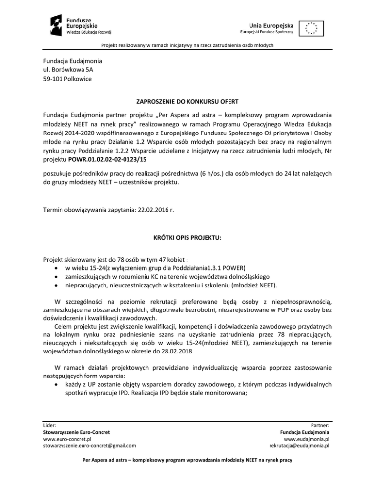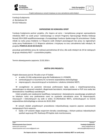 Projekt realizowany w ramach inicjatywy na rzecz zatrudnienia osób młodych Fundacja Eudajmonia ul. Borówkowa 5A 59-101 Polkowice ZAPROSZENIE DO KONKURSU OFERT Fundacja Eudajmonia partner projektu „Per Aspera ad astra – kompleksowy program wprowadzania młodzieży NEET na rynek pracy” realizowanego w ramach Programu Operacyjnego Wiedza Edukacja Rozwój 2014-2020 współfinansowanego z Europejskiego Funduszu Społecznego Oś priorytetowa I Osoby młode na rynku pracy Działanie 1.2 Wsparcie osób młodych pozostających bez pracy na regionalnym rynku pracy Poddziałanie 1.2.2 Wsparcie udzielane z Inicjatywy na rzecz zatrudnienia ludzi młodych, Nr projektu POWR.01.02.02-02-0123/15 poszukuje pośredników pracy do realizacji pośrednictwa (6 h/os.) dla osób młodych do 24 lat należących do grupy młodzieży NEET – uczestników projektu. Termin obowiązywania zapytania: 22.02.2016 r. KRÓTKI OPIS PROJEKTU: Projekt skierowany jest do 78 osób w tym 47 kobiet : w wieku 15-24(z wyłączeniem grup dla Poddziałania1.3.1 POWER) zamieszkujących w rozumieniu KC na terenie województwa dolnośląskiego niepracujących, nieuczestniczących w kształceniu i szkoleniu (młodzież NEET). W szczególności na poziomie rekrutacji preferowane będą osoby z niepełnosprawnością, zamieszkujące na obszarach wiejskich, długotrwale bezrobotni, niezarejestrowane w PUP oraz osoby bez doświadczenia i kwalifikacji zawodowych. Celem projektu jest zwiększenie kwalifikacji, kompetencji i doświadczenia zawodowego przydatnych na lokalnym rynku oraz podniesienie szans na uzyskanie zatrudnienia przez 78 niepracujących, nieuczących i niekształcących się osób w wieku 15-24(młodzież NEET), zamieszkujących na terenie województwa dolnośląskiego w okresie do 28.02.2018 W ramach działań projektowych przewidziano indywidualizację wsparcia poprzez zastosowanie następujących form wsparcia: każdy z UP zostanie objęty wsparciem doradcy zawodowego, z którym podczas indywidualnych spotkań wypracuje IPD. Realizacja IPD będzie stale monitorowana; Lider: Stowarzyszenie Euro-Concret www.euro-concret.pl [email protected] Partner: Fundacja Eudajmonia www.eudajmonia.pl [email protected] Per Aspera ad astra – kompleksowy program wprowadzania młodzieży NEET na rynek pracy Projekt realizowany w ramach inicjatywy na rzecz zatrudnienia osób młodych w przypadku zidentyfikowani w ramach IPD potrzeby uzupełnienia edukacji formalnej i/lub kompetencji i kwalifikacji zawodowych każdy z uczestników projektu będzie mógł skorzystać ze wsparcia edukacyjno/szkoleniowego; w przypadku zidentyfikowani w ramach IPD potrzeby nabycia doświadczenia zawodowego 58 uczestników projektu będzie mógł skorzystać ze staży/praktyk zawodowych; każdy uczestników w zakresie zdiagnozowanym w jego IPD będzie mógł skorzystać z takich aktywizacyjnych form wsparcia jak: wsparcie psychologiczne, coaching, mentoring; uczestnicy projektu (za wyjątkiem osób, które skorzystają z dotacji na rozpoczęcie działalności gospodarczej) będą mogli skorzystać w kompleksowego i indywidulanego pośrednictwa pracy; 20 uczestników projektu z predyspozycjami do prowadzenia działalności gospodarczej otrzyma wsparcie szkoleniowe/dotacje/wsparcie pomostowe. 1. Czas trwania projektu: 01.01.2016 r. – 28.02.2018 r. 2. Okres udzielania wsparcia: 01.05.2016 r. - 31.12.2016 r. OPIS POSTĘPOWANIA: Zamawiający: Fundacja Eudajmonia ul. Borówkowa 5a 59-101 Polkowice NIP: 8982116523 REGON: 020542174 KRS: 0000281074 Osoba do kontaktu: Grzegorz Jucewicz członek zarządu Tel. 537 191 676 Adres email: [email protected] Adres strony internetowej: www.eudajmonia.pl Opis przedmiotu zamówienia: Przedmiotem zamówienia jest świadczenie usług indywidualnego pośrednictwa pracy dla osób młodych do 24 lat należących do grupy młodzieży NEET – uczestników projektu (6 h/os.) w okresie 01.05.2016 31.12.2016. Lider: Stowarzyszenie Euro-Concret www.euro-concret.pl [email protected] Partner: Fundacja Eudajmonia www.eudajmonia.pl [email protected] Per Aspera ad astra – kompleksowy program wprowadzania młodzieży NEET na rynek pracy Projekt realizowany w ramach inicjatywy na rzecz zatrudnienia osób młodych Forma zatrudnienia: umowa zlecenie Niniejsze postępowanie prowadzone jest zgodnie z aktualnymi Wytycznymi w zakresie kwalifikowalności wydatków w ramach Europejskiego Funduszu Rozwoju Regionalnego, Europejskiego Funduszu Społecznego oraz Funduszu Spójności na lata 2014-2020. Warunki udziału w zamówieniu: W postępowaniu mogą wziąć udział oferenci spełniający łącznie poniższe kryteria: Posiadający min. 2-letnie doświadczenie w pośrednictwie pracy lub aktywizacji zawodowej osób wykluczonych i/lub zagrożonych wykluczeniem społecznym. Będący dyspozycyjni na Dolnym Śląsku. Wymagane oświadczenia i dokumenty: Kompletna oferta powinna zawierać minimum: życiorys wraz z klauzulą „Wyrażam zgodę na przetwarzanie moich danych osobowych zawartych w mojej ofercie dla potrzeb niezbędnych do realizacji procesu rekrutacji (zgodnie z ustawą z 29.08.97 r. O ochronie danych osobowych, Dz. U. nr 133, poz. 833 z późn. zm.)”, wypełniony formularz zgłoszeniowy (wzór w załączniku nr 1), Przygotowywanie i składanie ofert: Terminy składania ofert: Terminy składania ofert: 15.02.2016 - 22.02.2016 – rozpatrzenie ofert 23.02.2016 Sposób składania ofert: drogą mailową na adres [email protected] w tytule wiadomości należy wpisać: „pośrednik pracy – oferta”. O zachowaniu terminu decyduje data wpływu oferty. Kryteria oceny ofert z wagami punktowymi: Kryteria formalne: spełnienie warunków udziału w zamówieniu, przesłanie kompletnej oferty (życiorys + formularz) Kryteria merytoryczne: cena (waga: 100%) Lider: Stowarzyszenie Euro-Concret www.euro-concret.pl [email protected] Partner: Fundacja Eudajmonia www.eudajmonia.pl [email protected] Per Aspera ad astra – kompleksowy program wprowadzania m