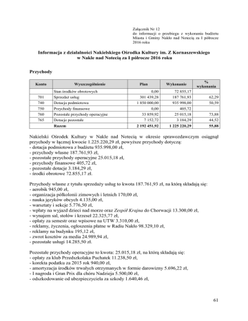 Załącznik Nr 12 do informacji o przebiegu z wykonania budżetu Miasta i Gminy Nakło nad Notecią za I półrocze 2016 roku Informacja z działalności Nakielskiego Ośrodka Kultury im. Z Kornaszewskiego w Nakle nad Notecią za I półrocze 2016 roku Przychody Konto Wyszczególnienie Stan środków obrotowych 701 Sprzedaż usług 740 Dotacja podmiotowa 750 Przychody finansowe 760 Pozostałe przychody operacyjne 765 Dotacje pozostałe Razem Plan Wykonanie % wykonania 0,00 72 855,17 301 439,28 187 761,93 62,29 1 850 000,00 935 998,00 50,59 0,00 405,72 33 859,92 25 015,18 73,88 7 152,72 3 184,29 44,52 2 192 451,92 1 225 220,29 55,88 Nakielski Ośrodek Kultury w Nakle nad Notecią w okresie sprawozdawczym osiągnął przychody w łącznej kwocie 1.225.220,29 zł, powyższe przychody dotyczą: - dotacja podmiotowa z budżetu 935.998,00 zł, - przychody własne 187.761,93 zł, - pozostałe przychody operacyjne 25.015,18 zł, - przychody finansowe 405,72 zł, - pozostałe dotacje 3.184,29 zł, - środki obrotowe 72.855,17 zł. Przychody własne z tytułu sprzedaży usług to kwota 187.761,93 zł, na którą składają się: - aerobik 945,00 zł, - organizacja półkolonii zimowych i letnich 170,00 zł, - nauka języków obcych 4.135,00 zł, - warsztaty i sekcje 5.776,50 zł, - wpłaty na wyjazd dzieci nad morze oraz Zespół Krajna do Chorwacji 13.300,00 zł, - wynajem sal, stołów i krzeseł 22.325,77 zł, - opłaty za semestr oraz wpisowe na UTW 3.310,00 zł, - reklamy, życzenia, ogłoszenia płatne w Radiu Nakło 98.329,10 zł, - reklamy na budynku 195,12 zł, - zwrot kosztów za media 24.989,94 zł, - pozostałe usługi 14.285,50 zł. Pozostałe przychody operacyjne to kwota: 25.015,18 zł, na którą składają się: - opłaty za klub Przedszkolaka Puchatek 11.238,50 zł, - korekta podatku za 2015 rok 940,00 zł, - amortyzacja środków trwałych otrzymanych w formie darowizny 5.696,22 zł, - I nagroda i Gran Prix dla chóru Nadzieja 5.500,00 zł, - odszkodowanie od ubezpieczyciela za szkody 1.640,46 zł, 61 Koszty Paragraf Wyszczególnienie 3020 4010 4110 4120 4170 4210 4260 4270 4280 4300 4410 4430 Wydatki osobowe niezaliczone do wynagrodzeń Wynagrodzenia osobowe pracowników Składki na ubezpieczenia społeczne Składki na Fundusz Pracy Wynagrodzenia bezosobowe Zakup materiałów i wyposażenia Zakup energii Zakup usług remontowych Zakup usług zdrowotnych Zakup usług pozostałych Podróże służbowe krajowe Różne opłaty i składki Odpisy na zakładowy fundusz świadczeń socjalnych Podatek od nieruchomości Podatek od towarów i usług (VAT) Amortyzacja Razem - wydatki finansowane z dotacji - wydatki finansowane z dotacji pozostałej - wydatki finansowane ze środków własnych 4440 4480 4530 4720 1 640,00 1 014 585,00 188 350,00 24 778,00 175 764,00 209 062,26 127 800,00 95 000,00 600,00 237 080,00 5 700,00 23 290,00 0,00 541 129,10 94 525,22 9 432,24 124 541,70 91 587,54 60 171,76 0,00 350,00 149 704,28 1 527,18 11 407,44 % wykonania 0,00 53,34 50,19 38,07 70,86 43,81 47,08 0,00 58,33 63,15 26,79 48,98 29 059,74 21 794,00 75,00 2 280,00 26 261,00 31 201,92 2 192 451,92 930,00 22 968,55 26 166,17 1 156 235,18 927 393,34 3 184,29 225 657,55 40,79 87,46 83,86 52,74 Plan Wykonanie W struktury Nakielskiego Ośrodka Kultury wchodzą działy: - Zespół Pieśni i Tańca KRAJNA, - Chór NADZIEJA i SOLI DEO, - UNIWERSYTET III WIEKU, - Punkt Przedszkolny PUCHATEK, - Sekcja szachowa, - Radio Nakło, - Wiejski Dom Kultury w Paterku, - Wiejski Dom Kultury w Potulicach, - Wiejski Dom Kultury w Ślesinie, - Centrum Ekologiczno - Kulturalne w Trzeciewnicy, - Świetlice Wiejskie (Suchary, Karnowo, Karnówko, Małocin, Michalin, Rozwarzyn, Polichno, Gorzeń, Chrząstowo, Gumnowice), - Sołectwa (Minikowo, Olszewka, Występ, Kazin, Lubaszcz, Wieszki, Bielawy). Koszty działalności podstawowej w okresie sprawozdawczym wykonano w kwocie: 1.156.235,18 zł w tym: wynagrodzenia osobowe i bezosobowe oraz pochodne (składki ZUS i fundusz pracy) odpis na ZFŚS, delegacje służbowe i badania lekarskie pracowników wyniosły 793 299,44 zł. Pozostałe koszty to kwota 362.935,74 zł, którą poniesiono na wydatki rzeczowe związane z utrzymaniem budynków w tym zakup energii cieplnej, energii elektrycznej, wody, zakup opału do Domów Kultury i Świetlic Wiejskich oraz na działalność statutową polegającą na realizacji: koncertów, imprez plenerowych, festynów rodzinnych, konkursów, przeglądów, półkolonii zimowych oraz innych form działalności merytorycznej dla dzieci, młodzieży i osób starszych. Przykładowe imprezy, które zostały zorganizowane przez Nakielski Ośrodek Kultury w I półroczu 2016 roku XXIV Finał Wielkiej Orkiestry Świątecznej Pomocy, 62 Koncert Noworoczny Poznańskiej Orkiestry Symfonicznej, koncert Jacka Silskiego z okazji Dnia Kobiet, IV Festiwal Piosenki Wiosennej, Uroczystości upamiętniające 225 rocznicę Konstytucji 3-Maja, Konfrontacje Teatrów Dziecięcych i Młodzieżowych „Maska”, Eko-majówka, II Powiatowy Przegląd Dziecięcych Zespołów Folklorystycznych, Konkurs Recytatorski dla Szkół podstawowych i gimnazjalnych pt. „Słowo źródłem inspiracji”, Koncert Zespołu Ludowego „Poligrodzianie”, Dni Nakła, Dzień Dziecka – zorganizowano w amfiteatrze Nakielskiego Ośrodka Kultury, a także w podległych jednostkach, Domach Kultury w Paterku, Potulicach, Ślesinie i Świetlicach wiejskich, Występy Kabaretu Neo-nówka, Turniej Wsi – Polichno, Festyny rodzinne: Domach Kultury, Świetlicach wiejskich i Sołectwach. Nakielski Ośrodek Kultury był współorganizatorem imprez charytatywnych ze zbiórką pieniędzy dla dzieci chorych Weroniki i Michałka z gminy Nakło. Bardzo dużo imprez w I półroczu 2016 roku przygotowano dla najmłodszych między innymi: konkurs plastyczny pt. „Zielona kartka na święta”, konkursy recytatorskie, festiwale piosenki, przedstawienia teatralne, w których dzieci mogły zaprezentować swoje talent